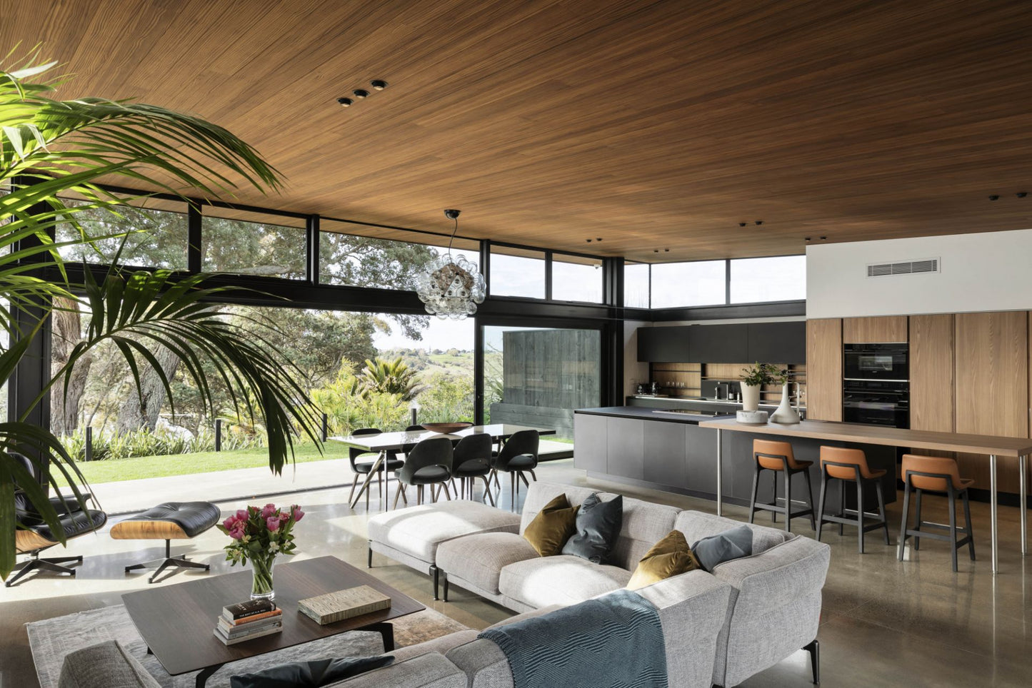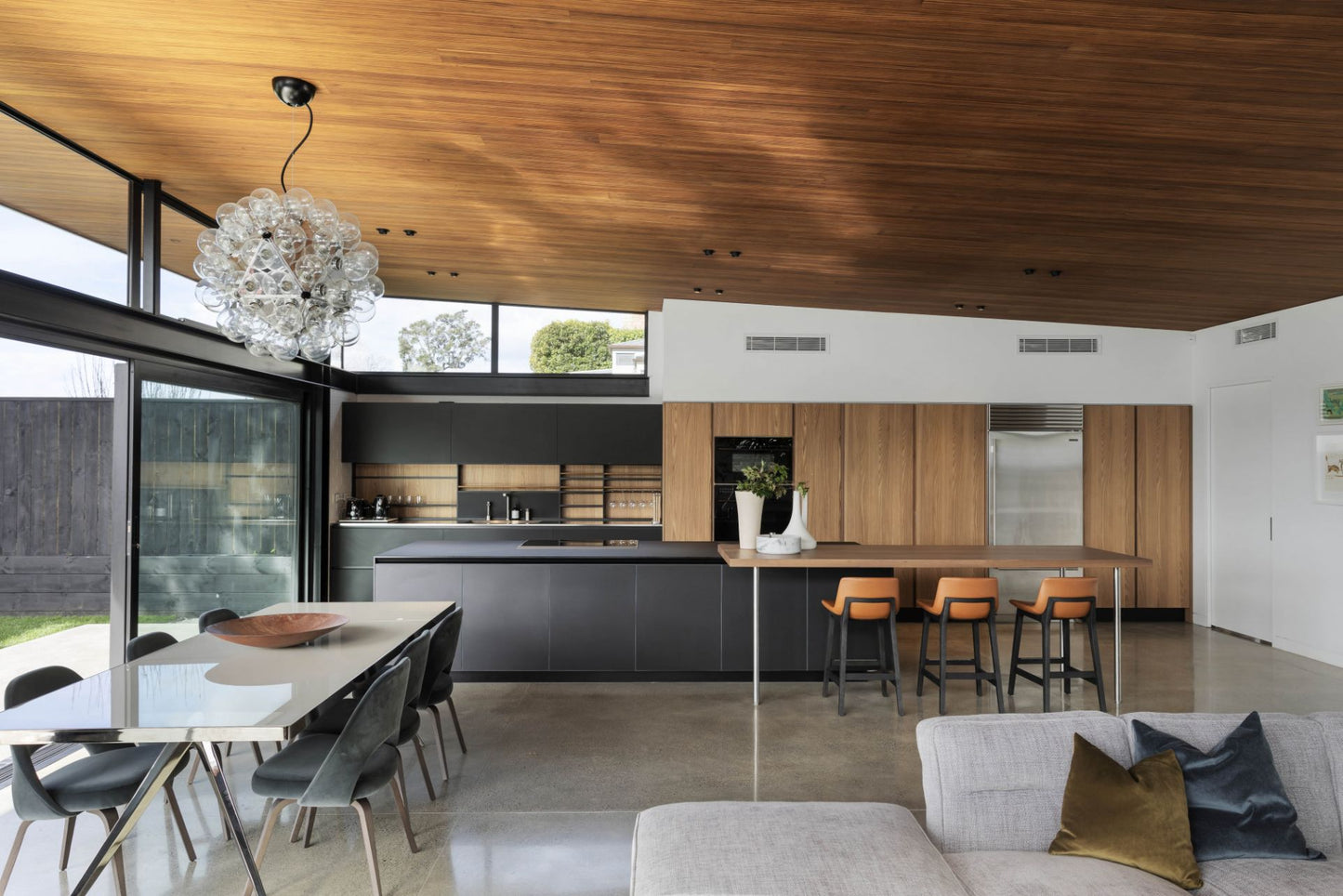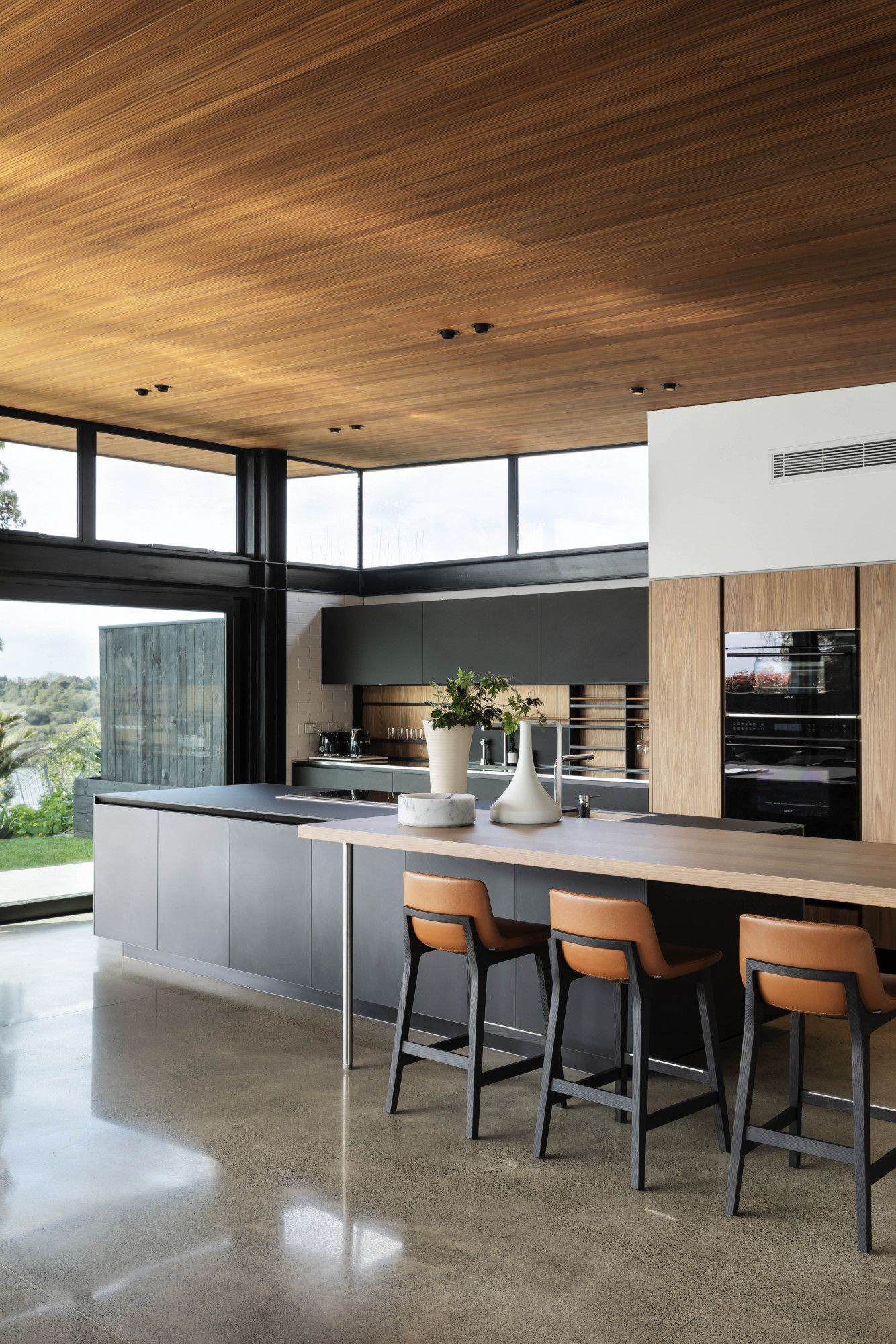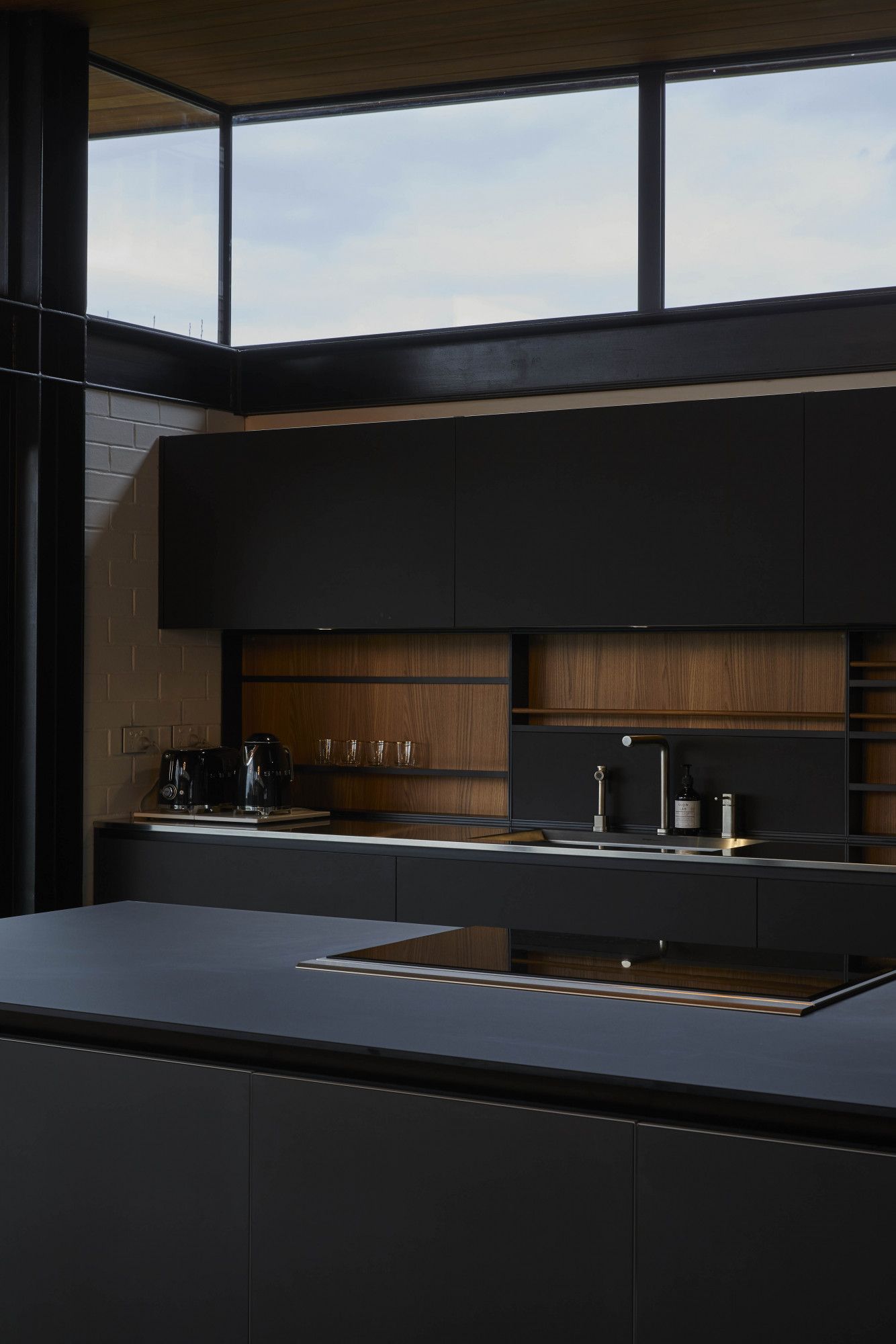The elm cabinetry in the Poliform kitchen works seamlessly with matt black island that ties in with the strong materiality of the pavilion.
