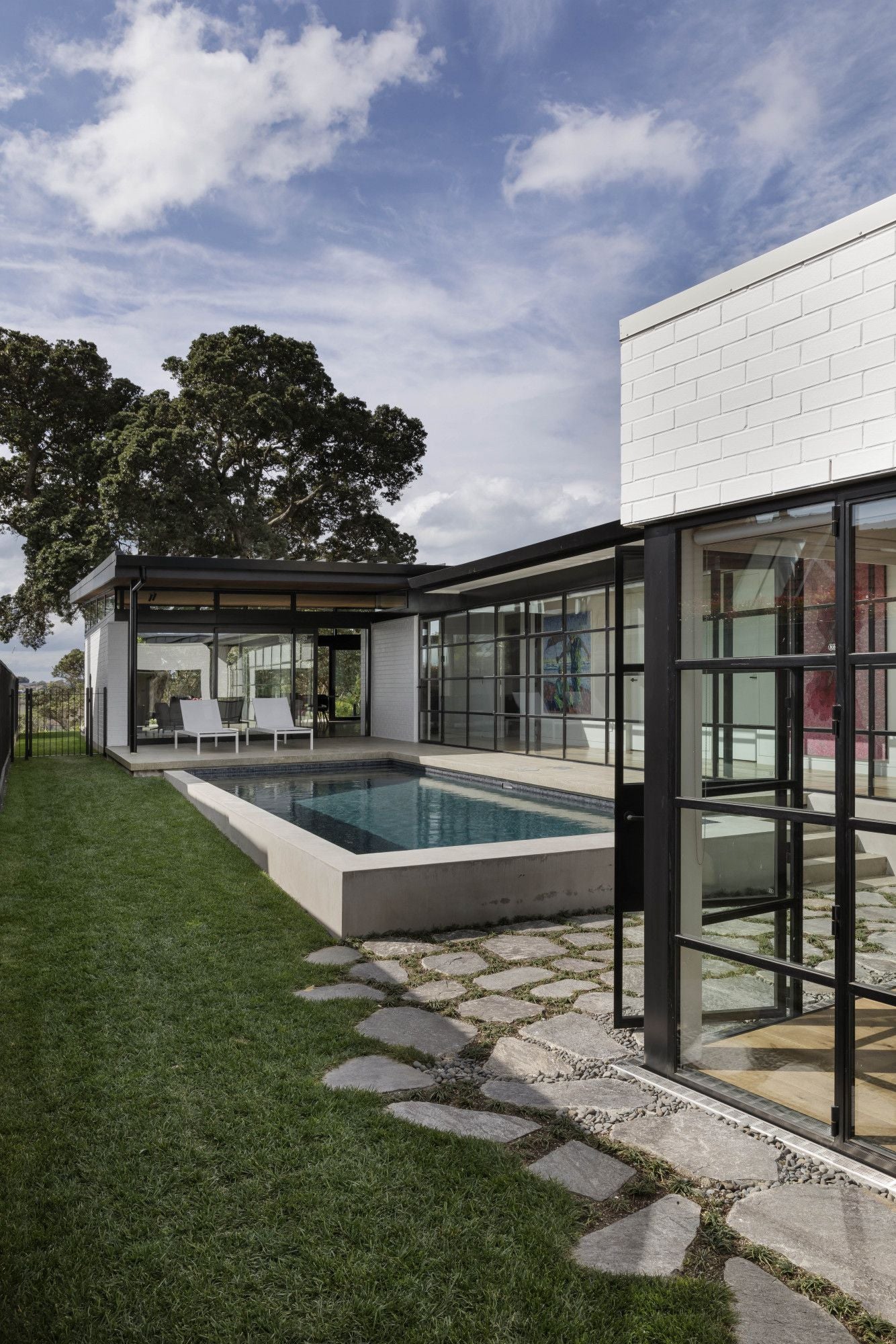 The pavilion has a more industrial aesthetic, with concrete floors and large glazed sliders that open up onto a small garden perched high up above the water. A mature pohutukawa frames the view, providing some privacy and dappled shade.