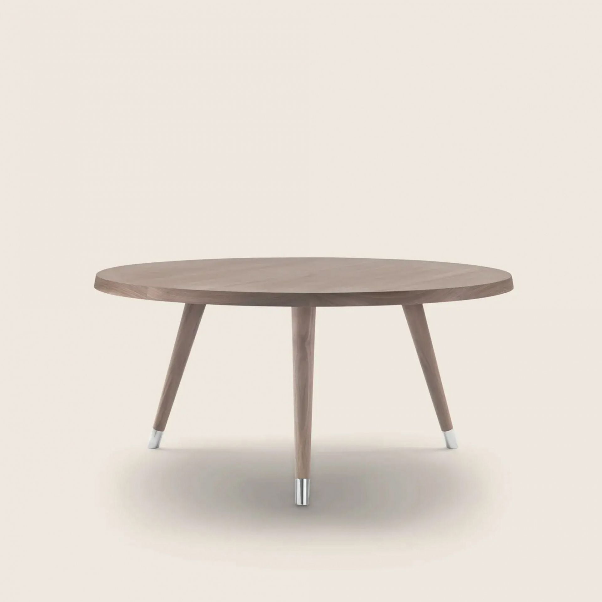 A minimalist-inspired support base composed of tapered legs in turned wood finished with elegant metal tips supports thick tabletops with rounded corners.
