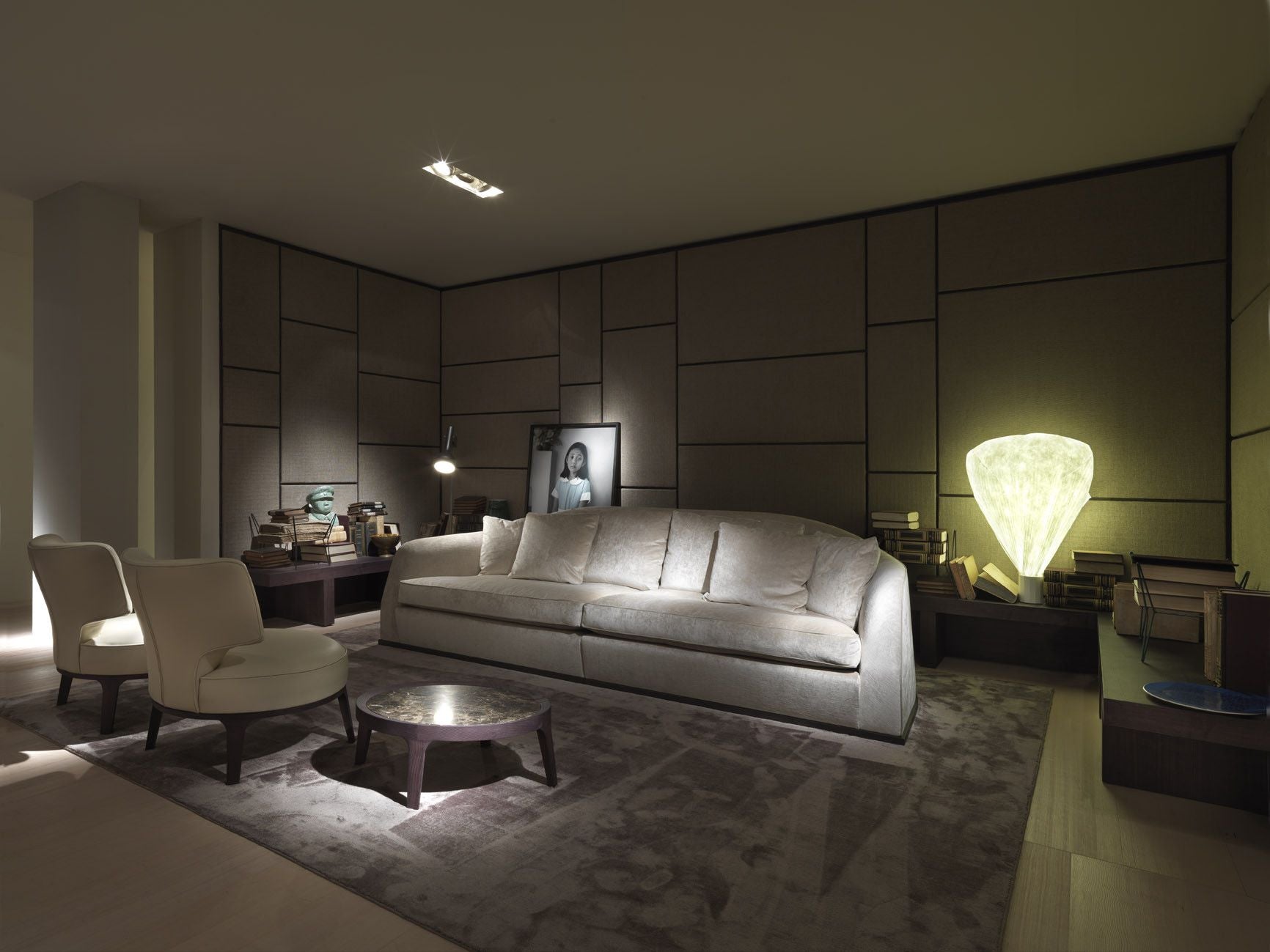 The Alfred stand-alone and sectional sofa conveys a typically “New Classic” flair. Its enveloping seat back curves around, sloping gently to form the armrest. The seat cushions are generously filled with goose down. The sofa rests on an elegant metal base that comes in an array of finishings. Seriously sophisticated in the two- or three-seat stand-alone version, the Alfred sofa also comes with the option of creating interesting compositions, thanks to the curved corner element. Couture details highlight Alfred’s soft silhouette – the seat back and cushions are finished with refined tone-on-tone or contrasting color grosgrain piping.