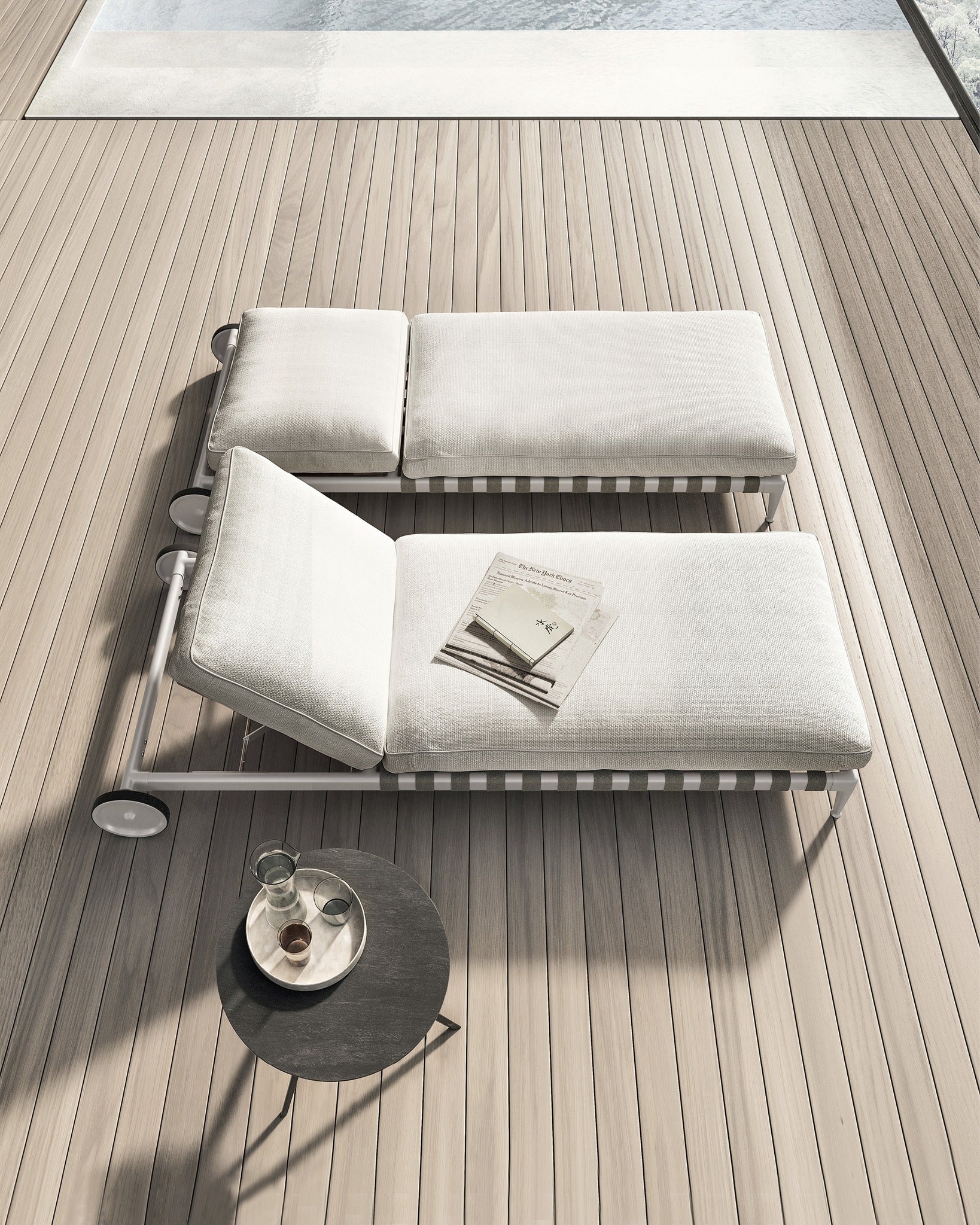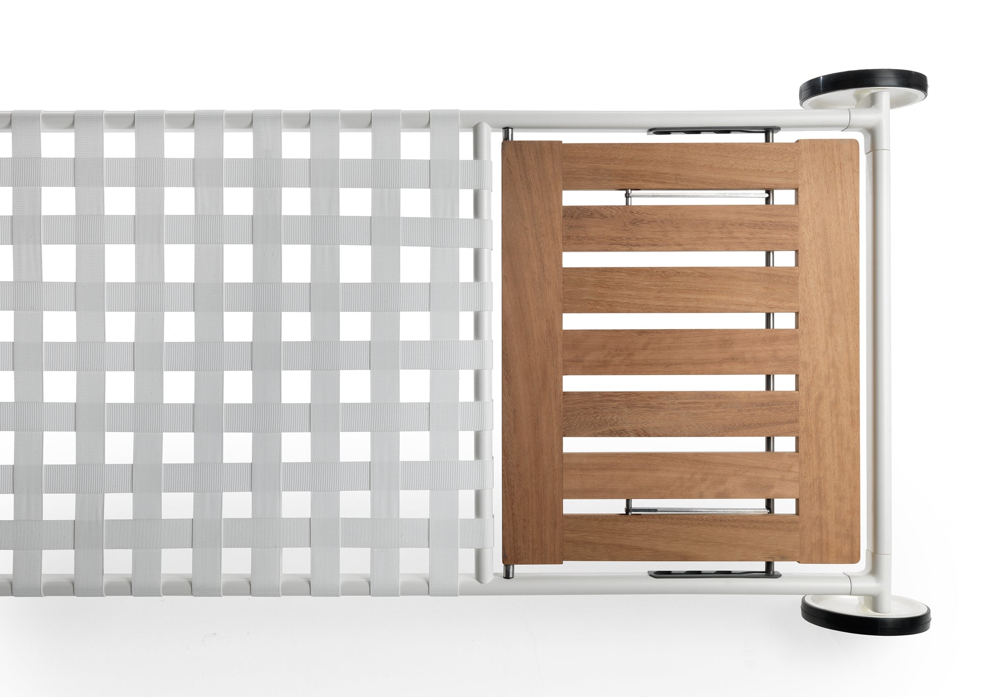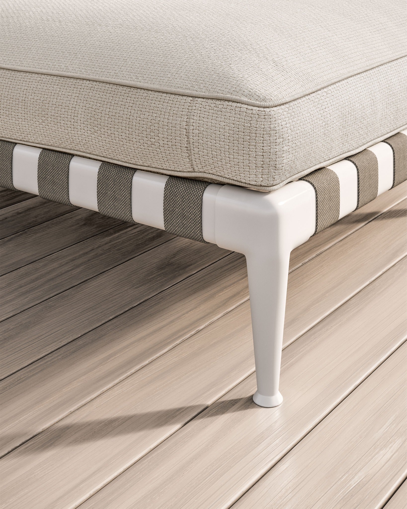 Its many craftsmanship details underscore this daybed’s impressive talent for personalization. The metal base has an epoxy powder-coat finish in a series of sophisticated shades, while the water-repellent elastic webbing comes in white, sand, grey and anthracite colors to create elegant contrasts or subtle tone-on-tone pairings.