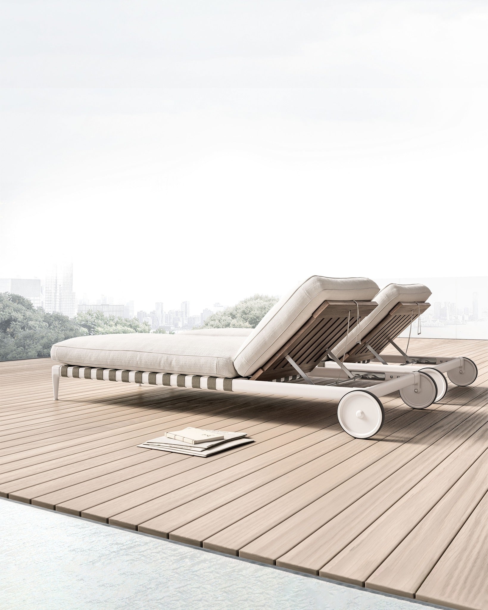 A simple mechanism allows the angle of inclination of the solid iroko backrest to be easily adjusted and also comes in a version with aluminum posterior wheels to smoothly shift its location.