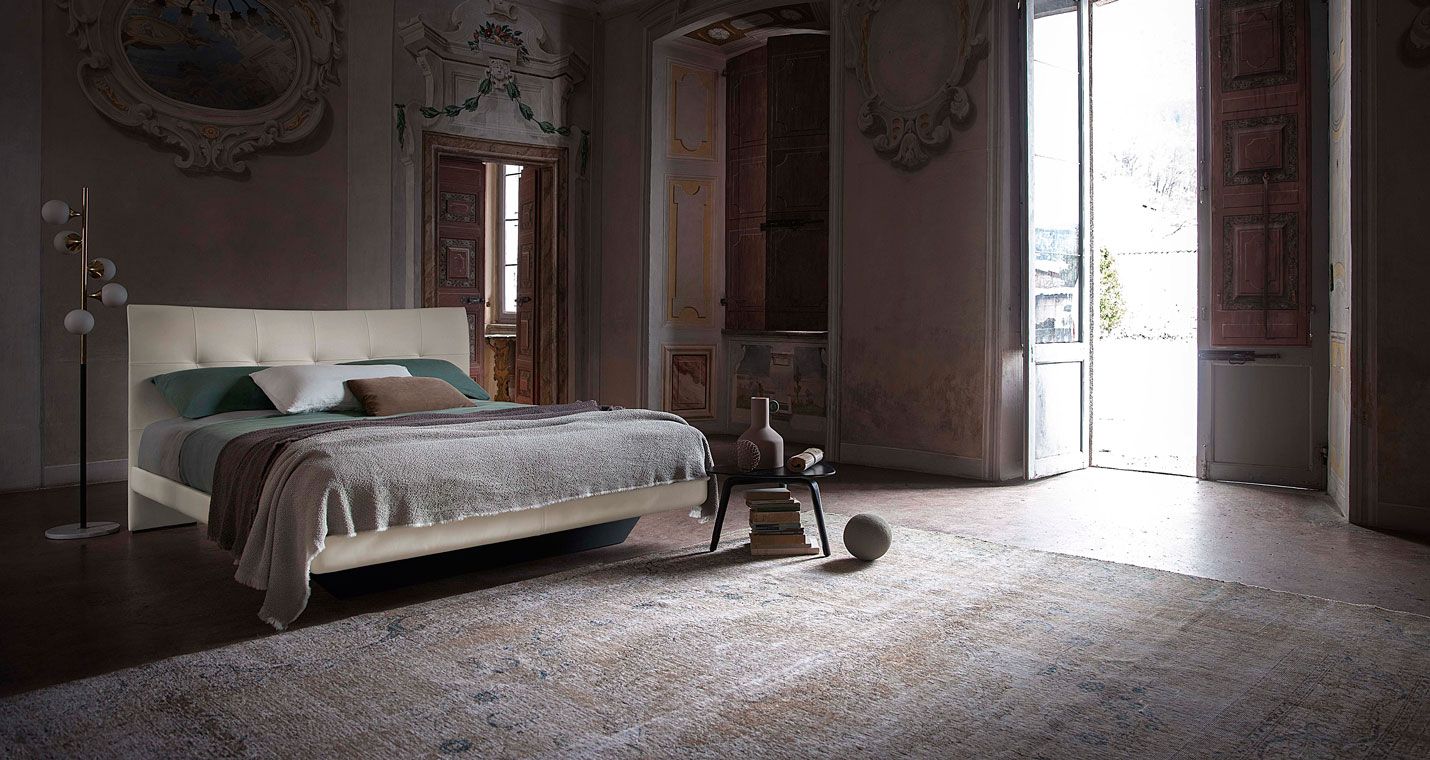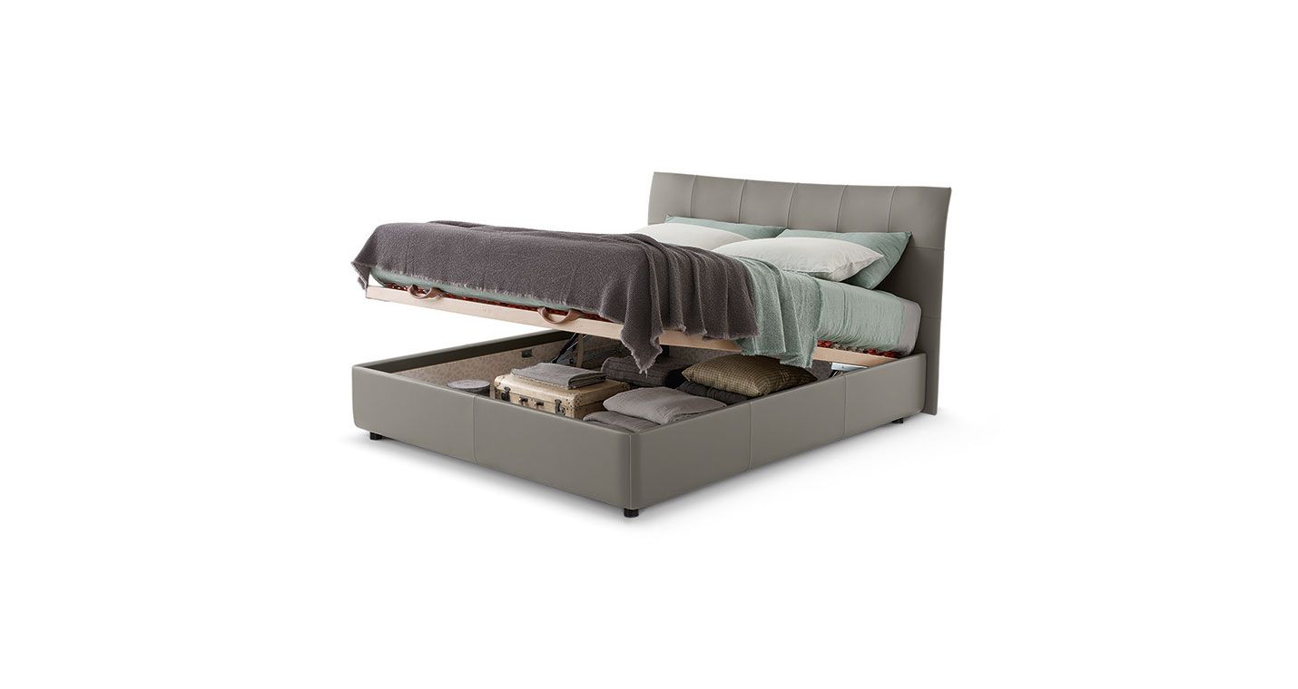 The headboard is in lightly padded solid beech and upholstered with Pelle Frau® leather. The base is lightly padded in polyurethane foam with spruce blockboard for the sides and poplar plywood for the footboard. The front corners are enriched with a leather trim. The back feet of the Aurora Due bed are formed from the headboard, which extends down to the floor, while the front base is in wood with black scratchproof paint and consists of a single trapezoid the same width as the bed. The metal base is the same shape but hollow inside and available with black, gunmetal grey and chromium-plated finishes. The Aurora Due bed can also come equipped with a spacious storage unit which can be accessed from the front of the footboard thanks to a device with gas springs. In this version the front of the base has beechwood feet with a texturised black finish accompanied, on the headboard side, by 2 castors that make it easier to move.