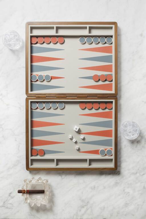Backgammon consists of a fine walnut wood box partially covered in Pelle Frau® leather, with the game checkers, 4 standard opaque plexiglass dice and 1 doubling dice inside, all stored in a special suede pochette.