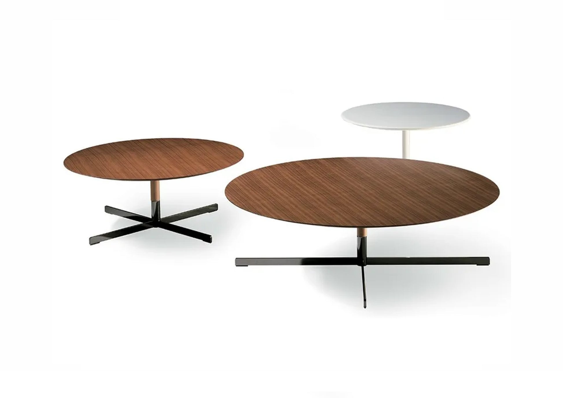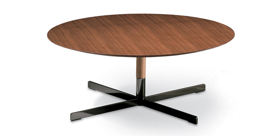 Elegant and practical. Highly desirable blends of wood, leather and steel. Beautiful simplicity inspired by a Kennedy-style international way of life. The structure of the tables with the top upholstered in Pelle Frau® Color System leather or finished in a Canaletto walnut veneer is made of birch plywood. The upper part of the leg features the same finishing of the top. When the table top is in Calacatta gold marble, with brilliant or semi-brilliant finishing, the upper part of the leg is upholstered in leather of matching colour. (Pelle Frau® Nest leather Silice colour). The structure of the base is always made of steel. The base and the lower part of the leg is finished in gunmetal grey or in Canaletto walnut veneer. When the table top is in Canaletto walnut veneer, the base can only be in a gunmetal grey finish. The table with diameter 120 cm is not available with marble top.
