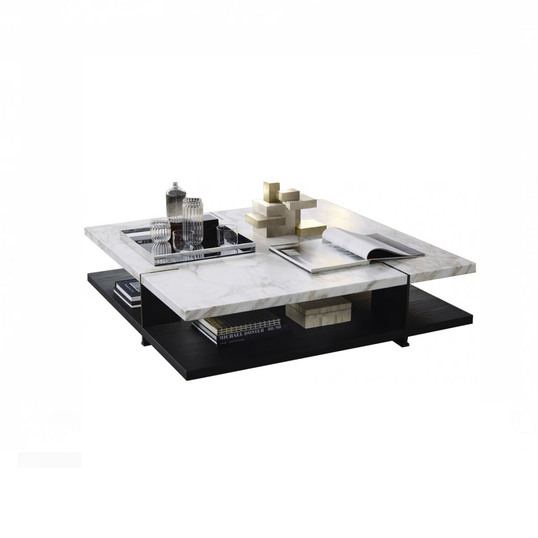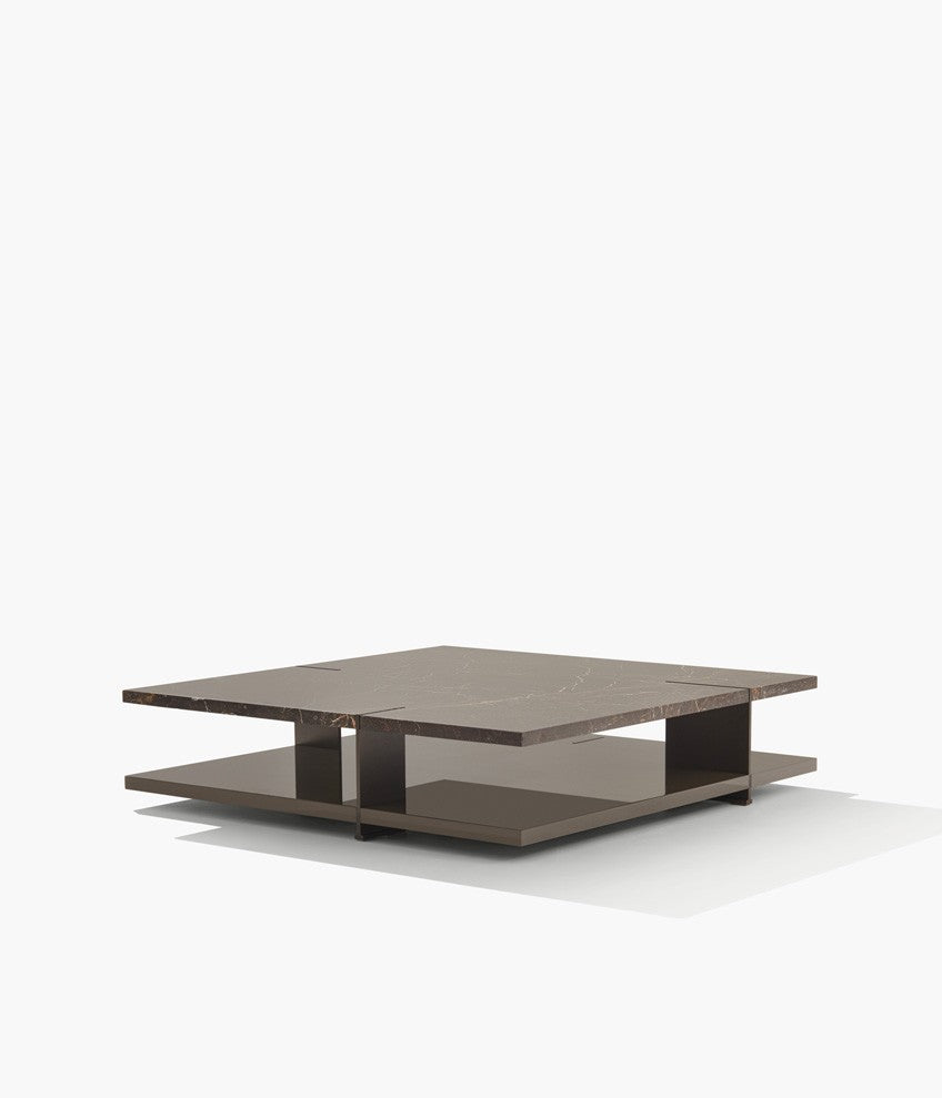 To complete the Bristol collection, consisting of sofa, book-case, and sideboard, there are also the centre coffee tables, characterized by two planes on top of each other. Metal supports intersect the upper top, becoming the signature style of the entire collection. The lower plane is available lacquered or in wood, the upper one also in marble.