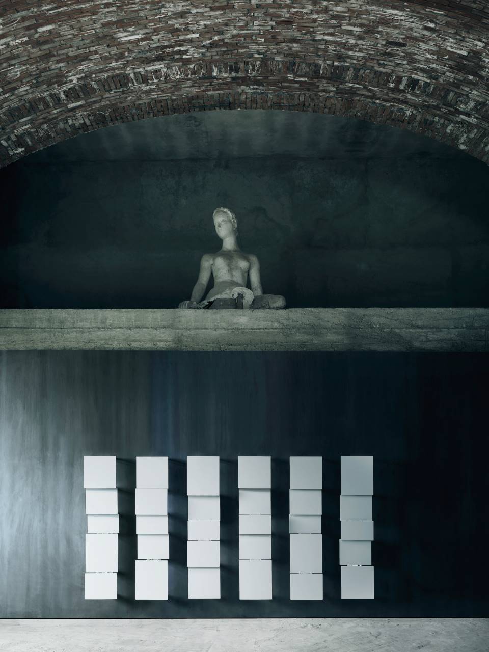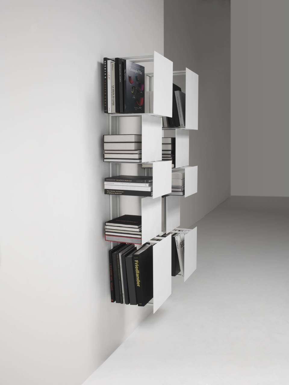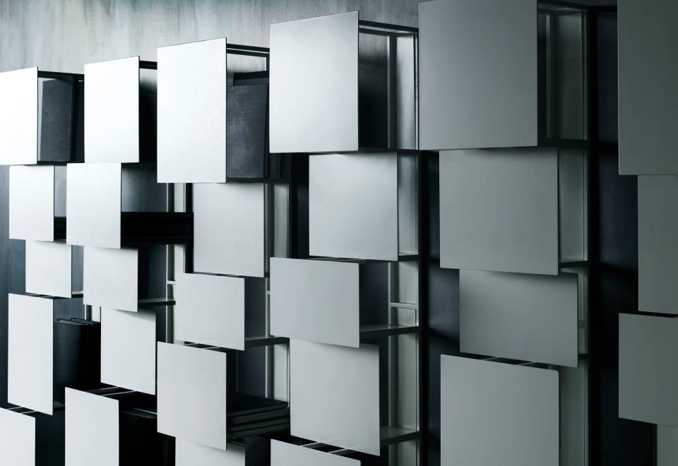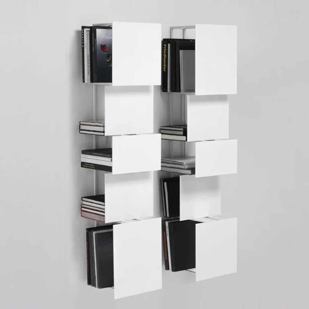 Sculpture-bookcase composed by a series of squared, detached and tangent elements.