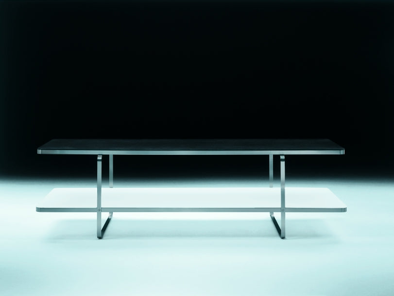 The versatile CARLOTTA family of products includes a small armchair, an ottoman, a chair, tables and a bookcase. The collection, drawing on a design matrix close to rationalism, relies on a light structure in flat metal with visible bolts at the joints. CARLOTTA comes as a folding chair with seat and back in cowhide, paired with an ottoman, as a compact, airy bookcase with overhanging wooden shelves on two uprights, or in the form of tables with solid wood tops. Bauhaus overtones for a timeless collection.