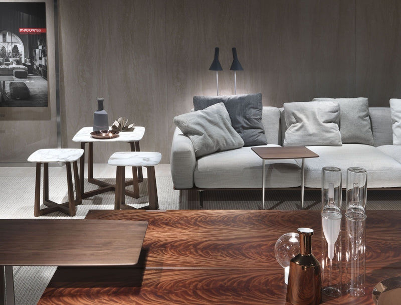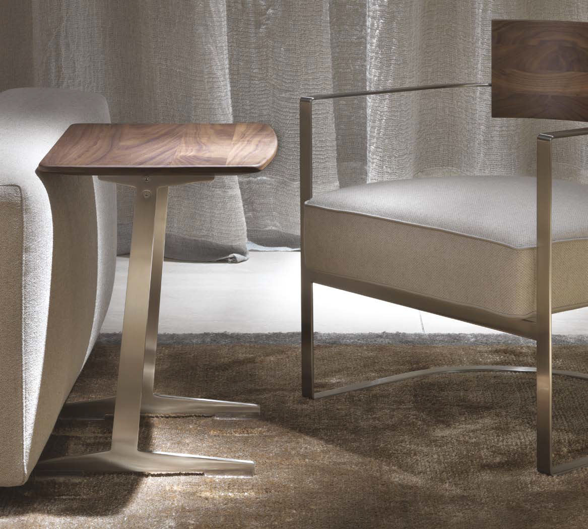 The CESTONE sofa emphasizes its back, an often overlooked part. The sides and back are made with large strips of cowhide, woven in a broad pattern on a metal structure. The aesthetic result is a sophisticated checkerboard that brings a prestigious image, of particular value when positioned at the center of a room. From the same collection, the Cestone bed reprises the elegant cowhide weave on its headboard, introducing a panel of materic thickness that forms a contrast with the simplicity of the bedframe. The sofa can be combined with the CESTONE tables with tops in natural or stained ash wood, an apt match for the warmth of the cowhide. The tables are fastened to the structure of the sofa and become an integral part of its design, adding dynamism to the configuration. The tables, placed freely by the bed, become handy bedside units.