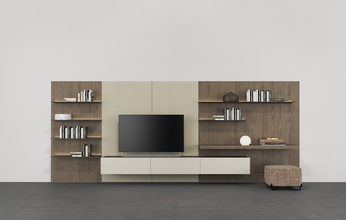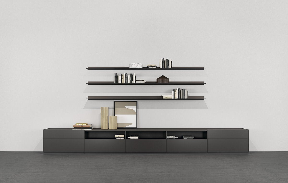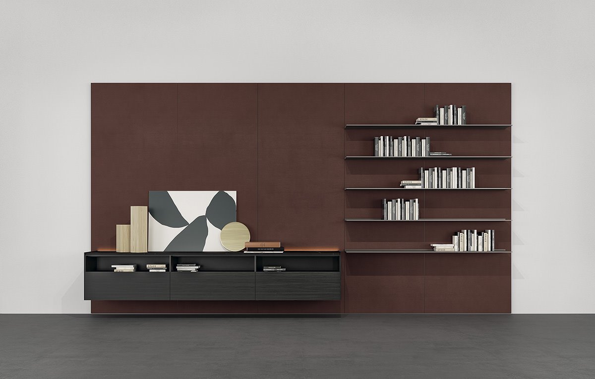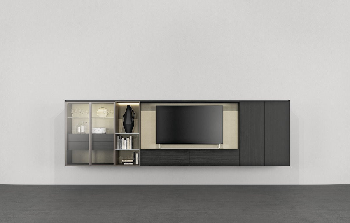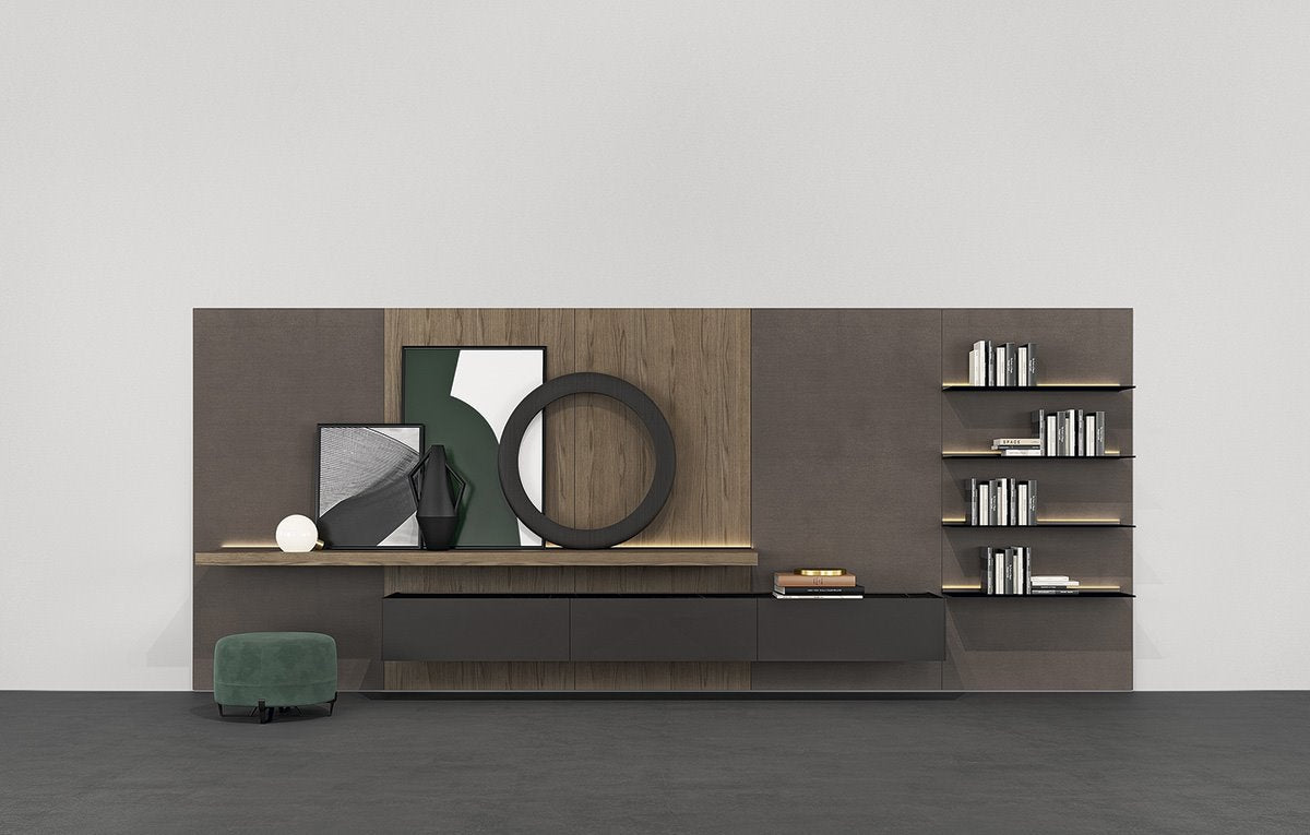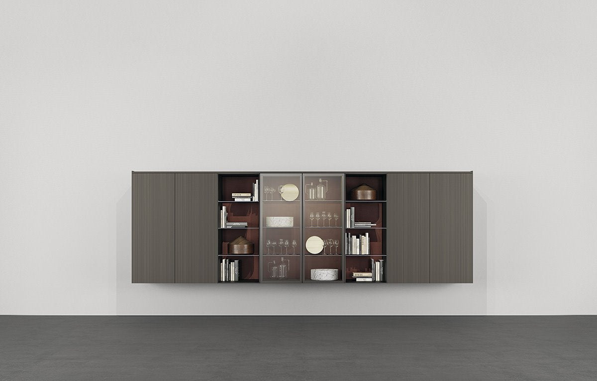 Code is a versatile system that offers unprecedented freedom of design. Conceived for the contemporary living room, it also extends to the night area, where boiseries, suspended containers, and shelves are reinterpreted as standalone elements or in combination with wardrobes and walk-in closets.To complete the system, a collection of sideboards to be freely configured – choosing between open compartments, showcases, drawers, hinged or flap doors. The versatility of the system is also expressed through the variety of finishes, to customize down to the individual component.