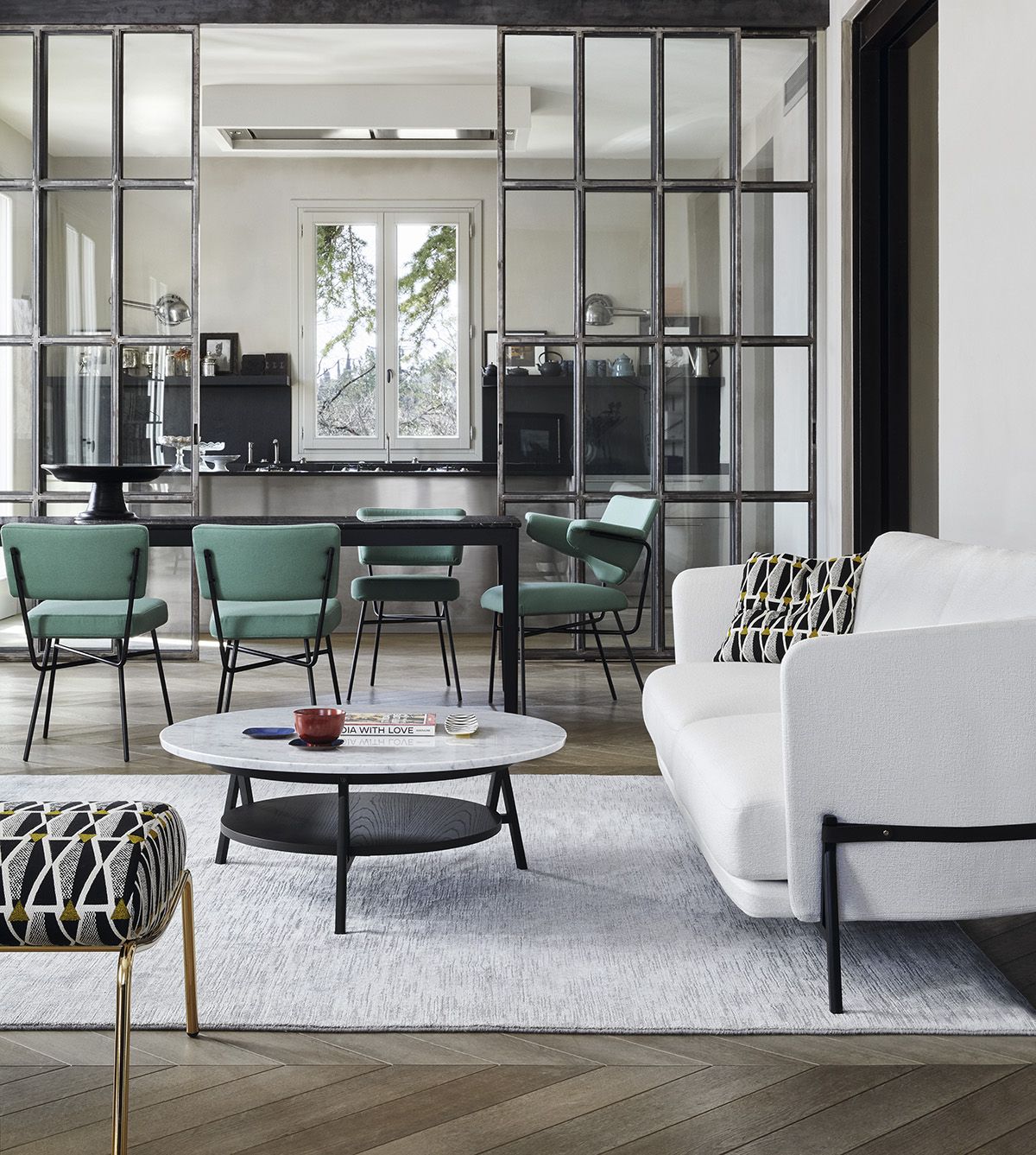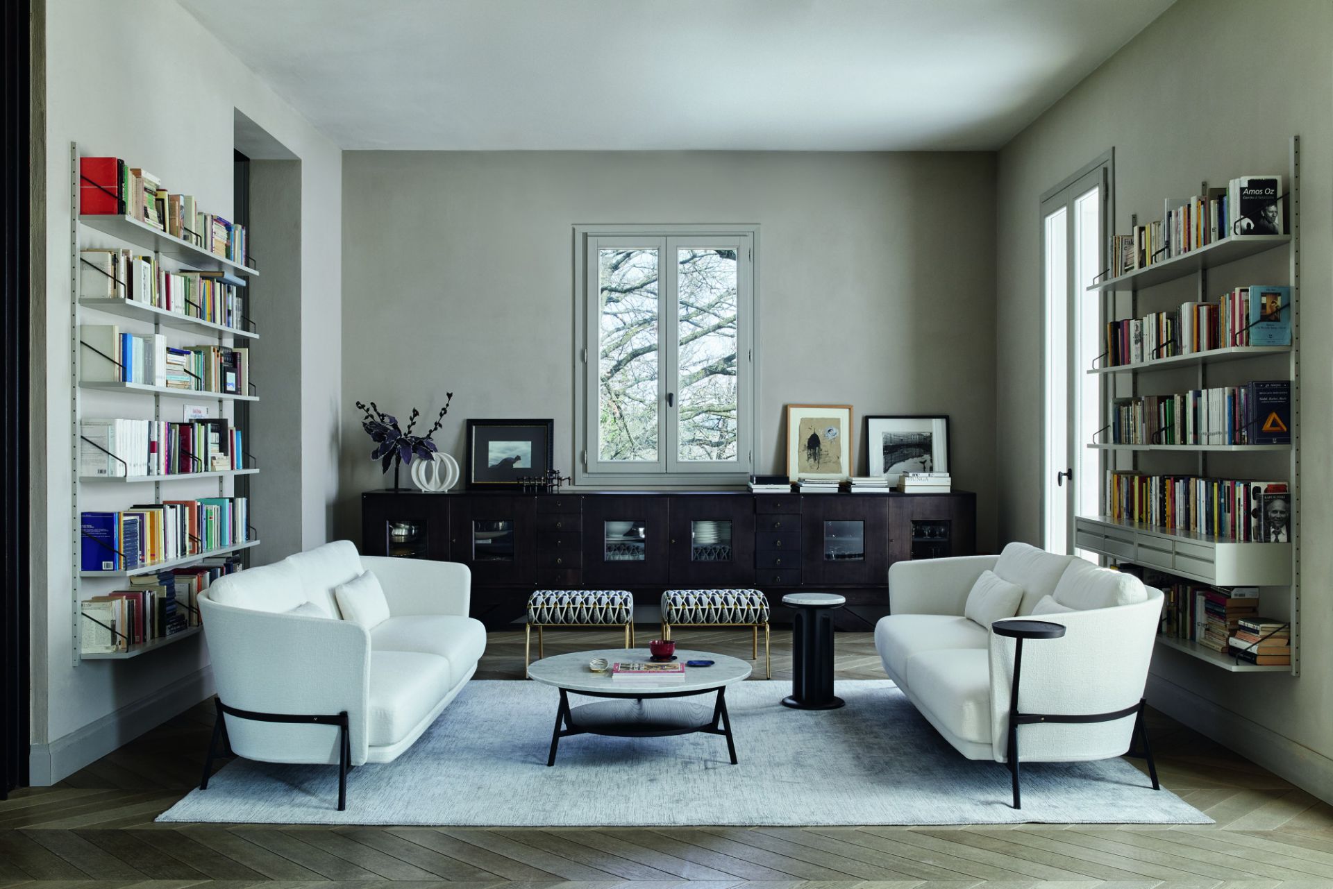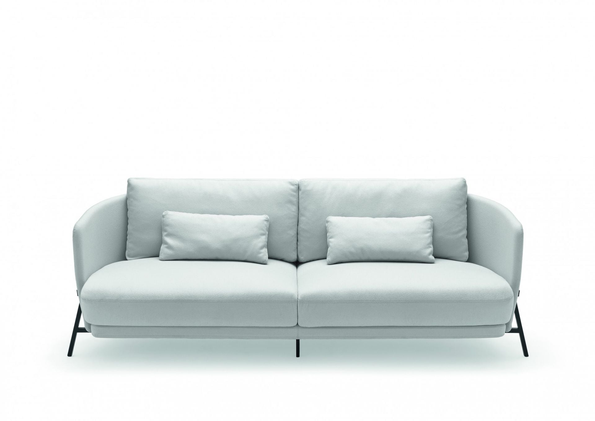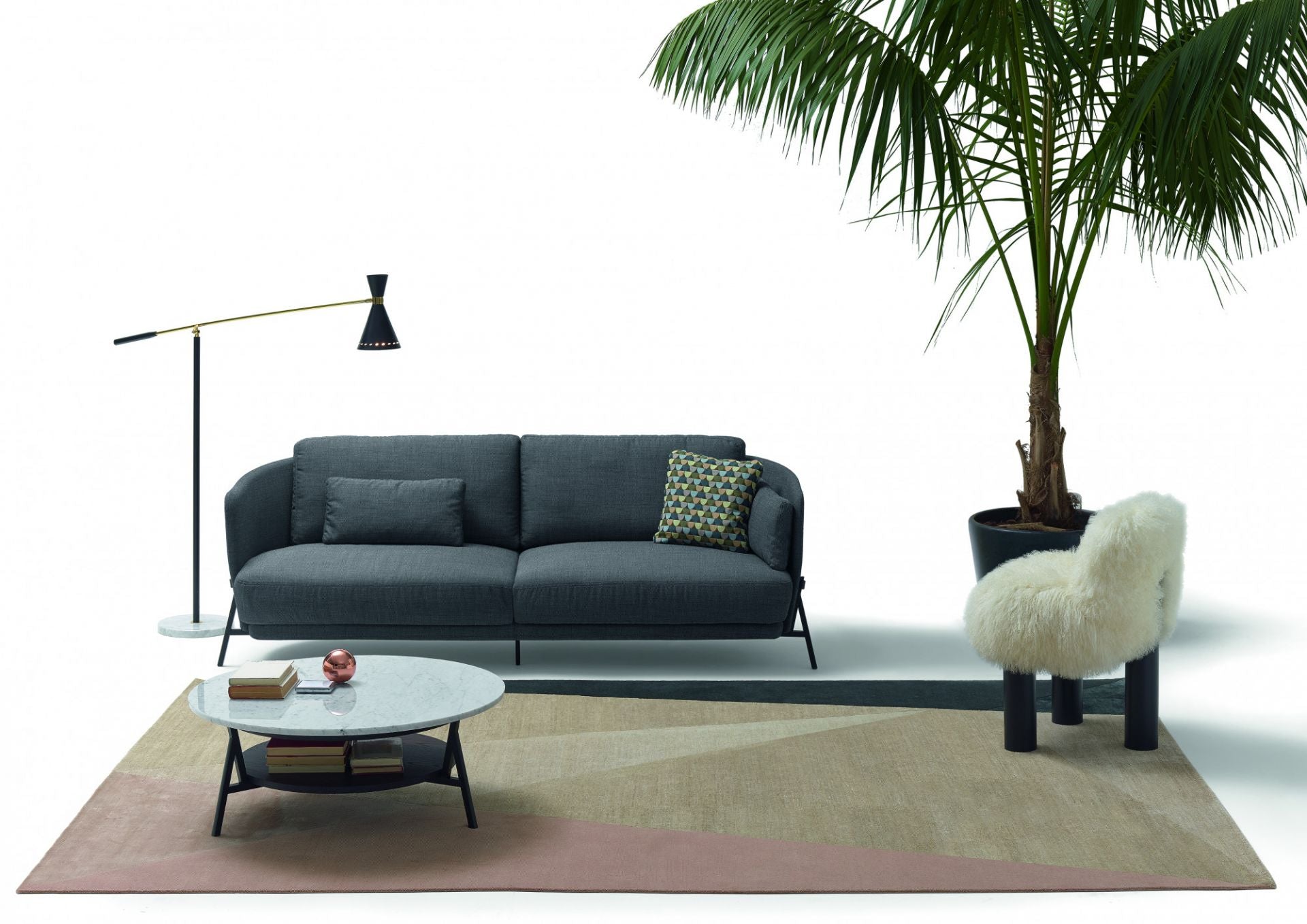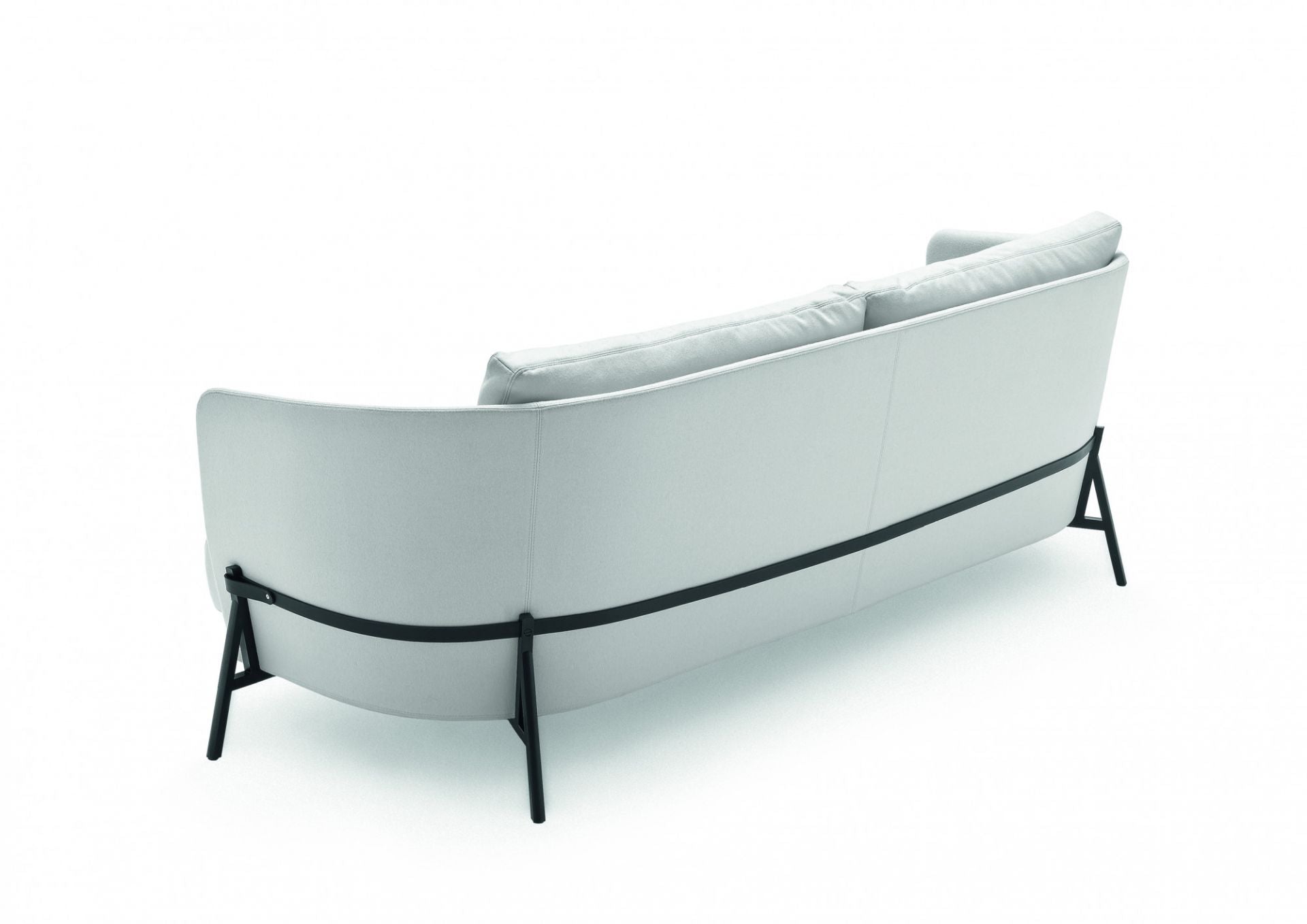 arflex presents Cradle family, a system composed of armchair and sofa. Their characteristic is based on the structure: a classic triangular construction, that is repeated several times around the models, so that you can admire it from each point of view. The cow-hide strap that rolls up around the rigid frame covered by fabric, which holds soft cushions, is fixed between the steel structure of the feet, creating in this way a cradle, that gives harmony with the contrasts of the materials. The armchair and the sofa draw both from the rich lineage of Italian furniture, known for its bold sculptural shapes, as well as from the modernist sensibility, that demands an honest structural expression. Rather than conceal the framework and attempt to make the models levitate off the ground, the elegant crafted supporting elements themselves become the highlight of the pieces. The frame is realized in moulded polyurethane foam and is places on black lacquered die-cast metal. The strap in leather is available in the colors black or brown testa di moro.