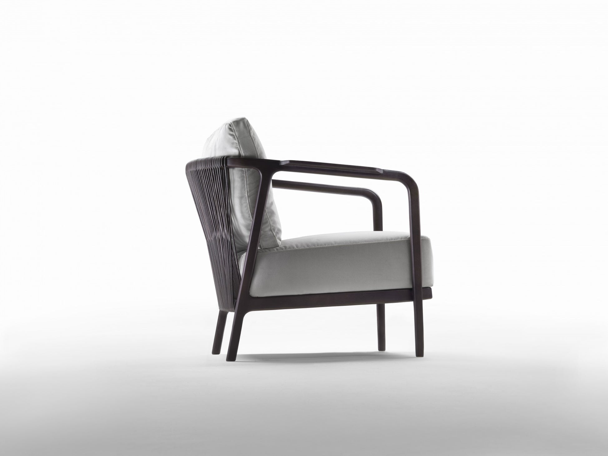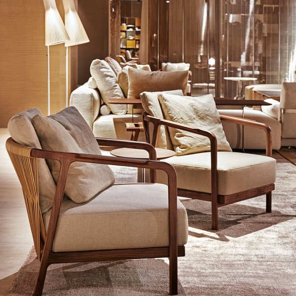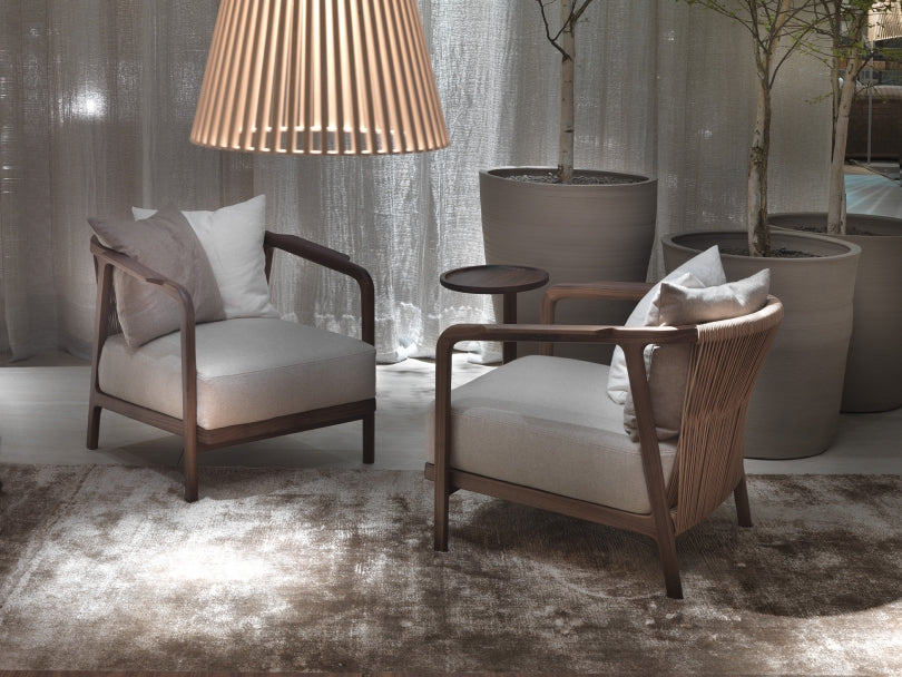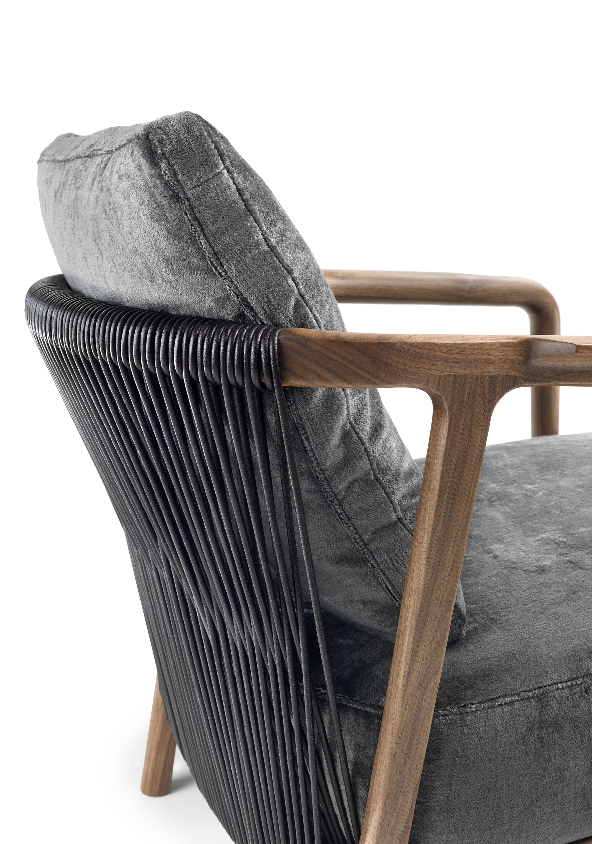 Graceful proportions and a sophisticated design place the Crono armchair in a class of its own. The visually-light but solid wood structure, available in various shades, isplays the kind of workmanship that clearly expresses the company’s flair for embracing the heritage of Italian cabinetmaking tradition as its own. As unique as it is sophisticated, the seat back is entirely hand-woven in a design made from cowhide cord; the seat back is rendered even more comfortable with the addition of a soft, goose-down-filled cushion. The seat is made of polyurethane foam, covered in a laminated fabric and the upholstery – in fabric or leather – is removable.