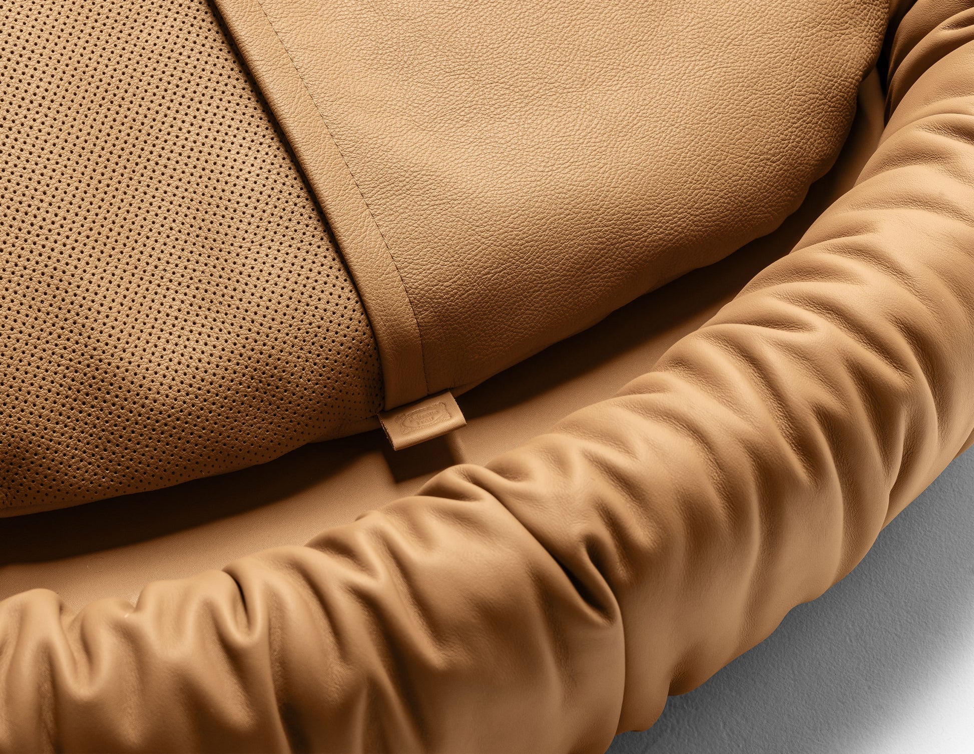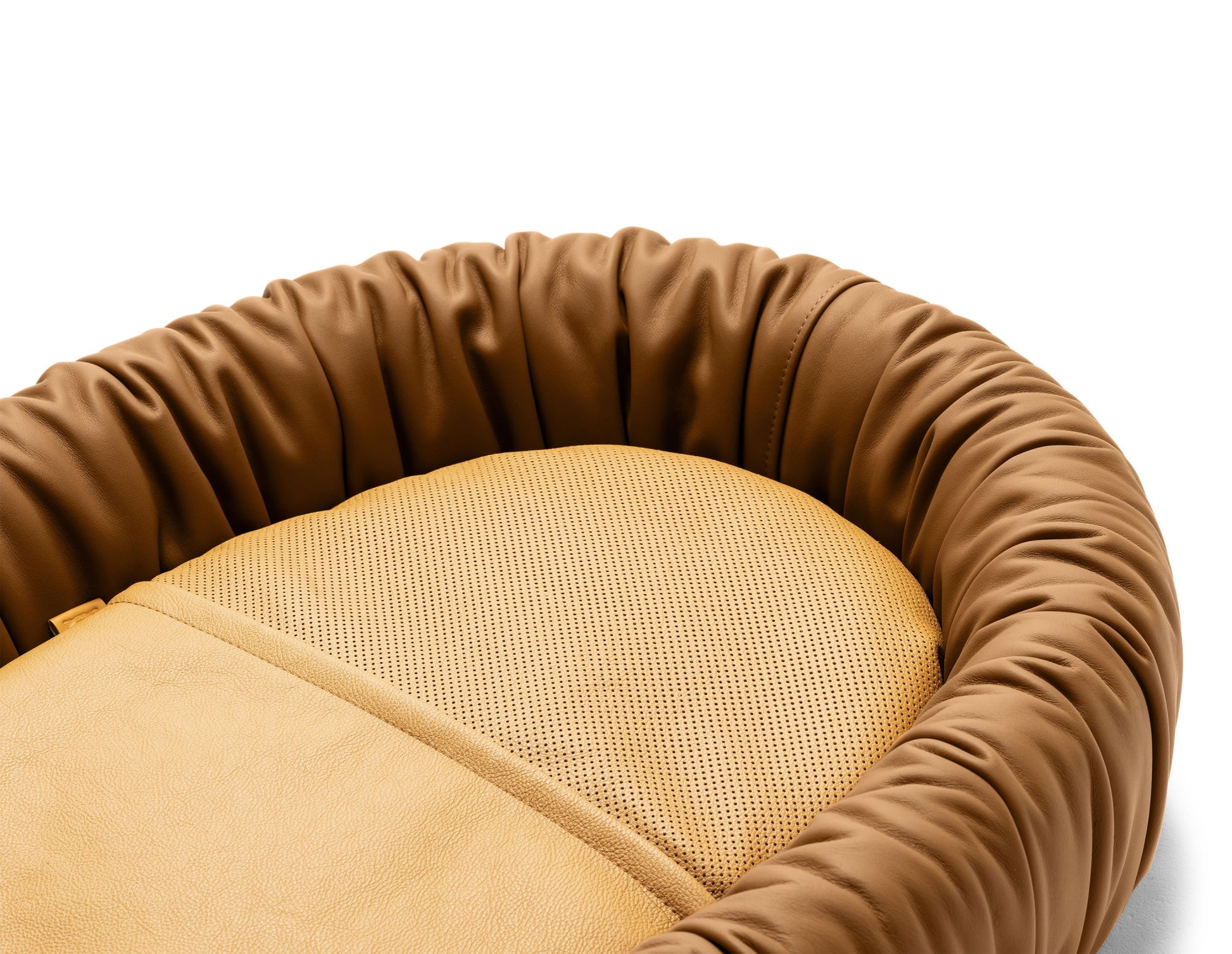 Stylish, comfortable and ergonomic, the dog bed is a high-quality shelter that provides optimal sleep as well as the perfect support for joints. It has an oval shape and is made of fine Pelle Frau® leather. The FSC-certified wood inner frame is combined with flame-resistant padding, while the hypoallergenic foam inner cushion is removable and water-resistant. Built-in feet improve ventilation and thermoregulation.