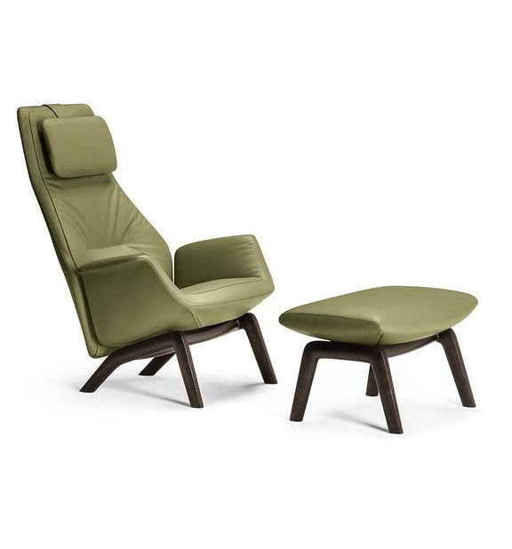 The aerodynamic, slightly reclined contours of the Downtown Lounge armchair invite you to sit back and relax. The differentiated-density padding and headrest cushion ensure exceptional seating comfort. The structure is available in a fixed version, with a solid wood base in various finishes, or a swivel version, with a four-spoke die-cast aluminum base. The base features a “Return” mechanism, allowing for 360° rotation and automatic return to the original position. In both versions, the Downtown Lounge armchair can be fully upholstered in either Pelle Frau®