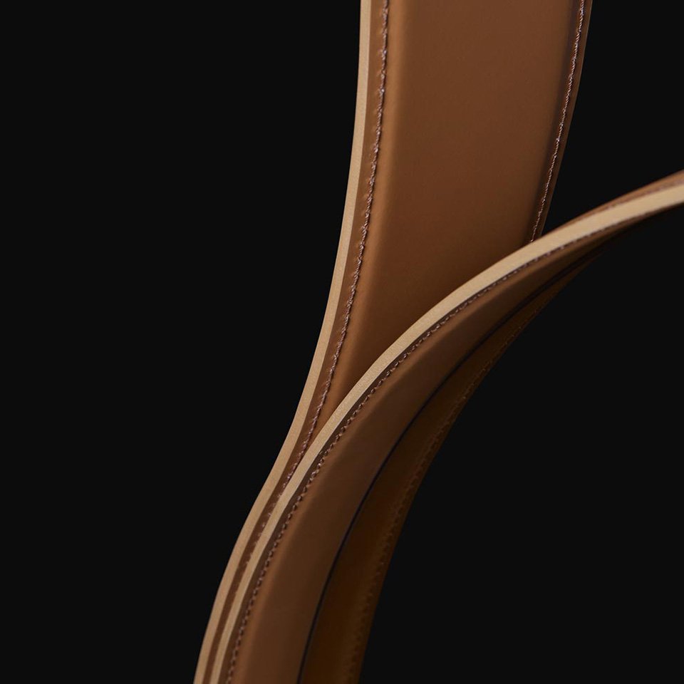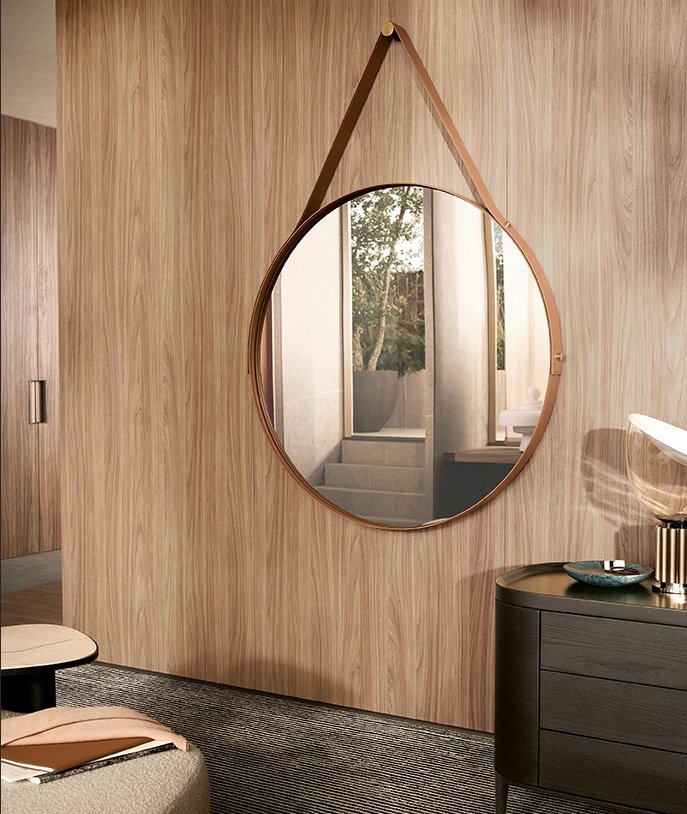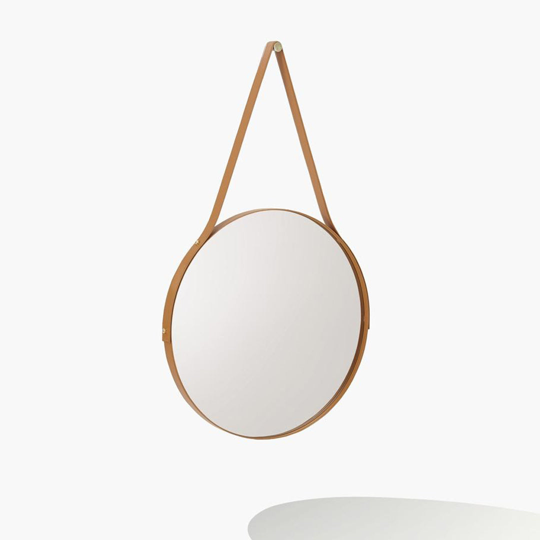Elegant and precious, Drop is a generously sized round mirror. It features a leather frame that incorporates the strap used to hang it on the wall.
