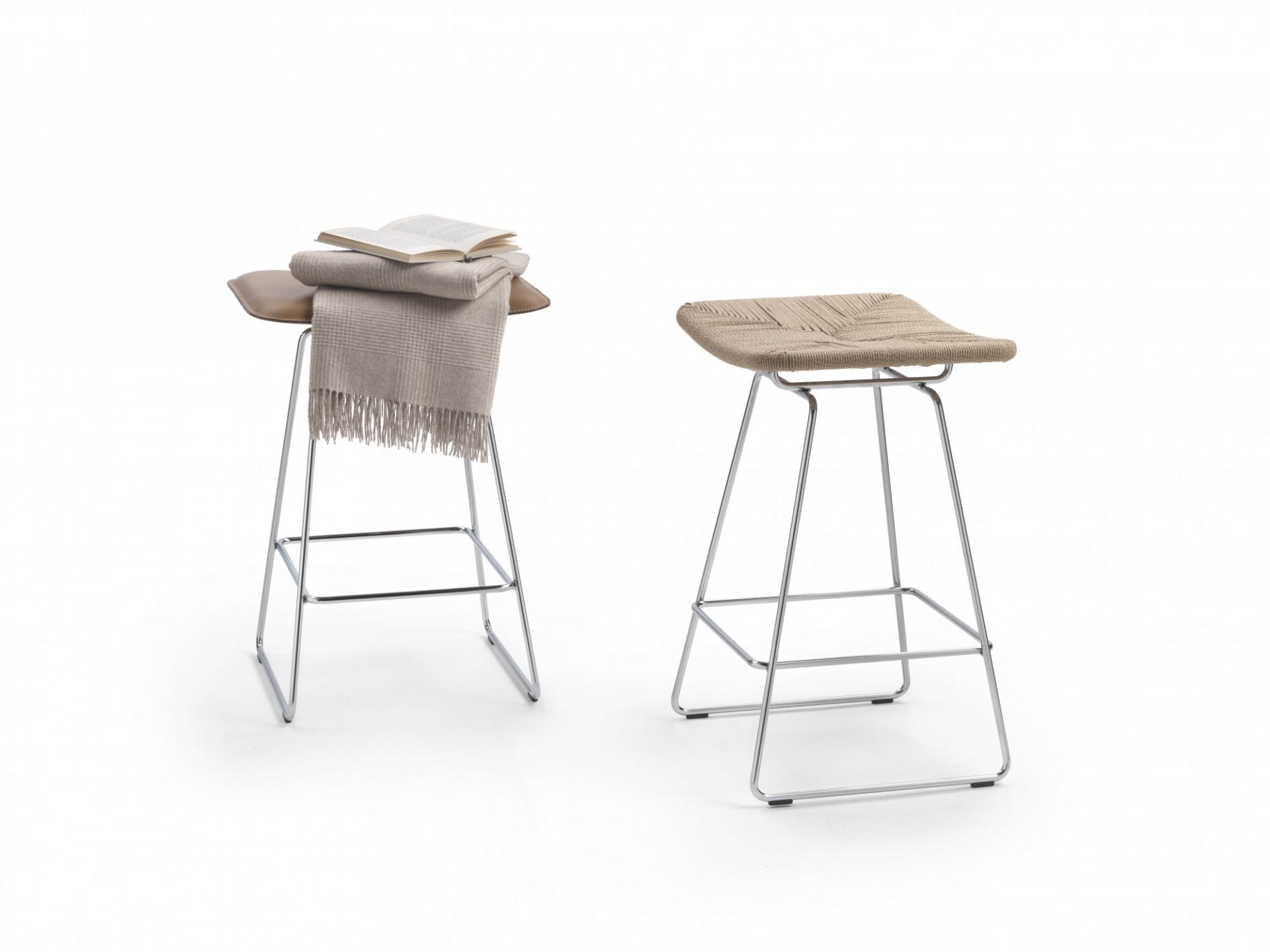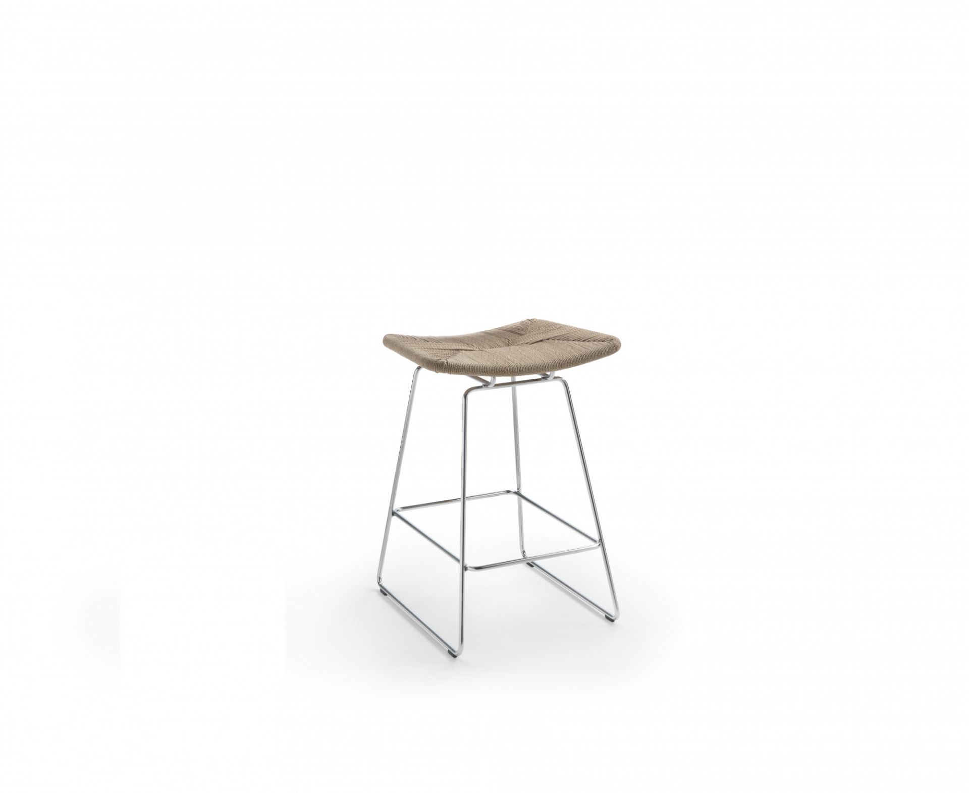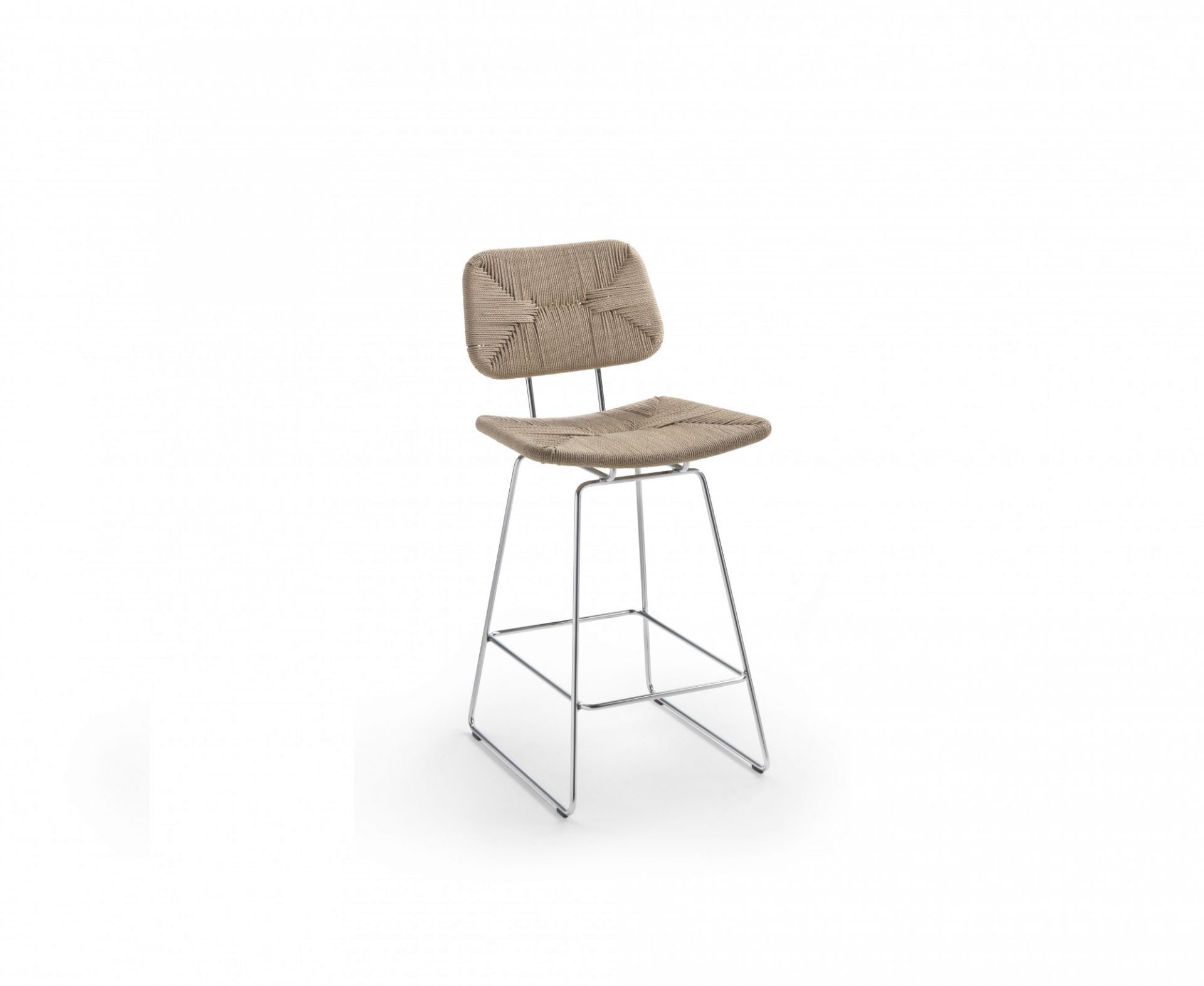The sleek metal structure contrasts with the pliable seat and backrest made of fine woven paper cord or paper rush cord. This seemingly simple process is actually quite complex and still today performed entirely by hand.