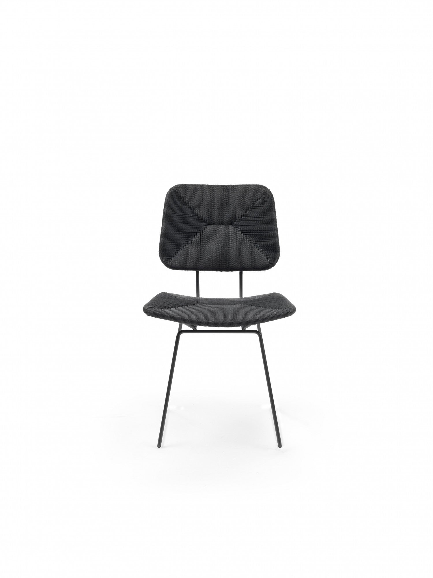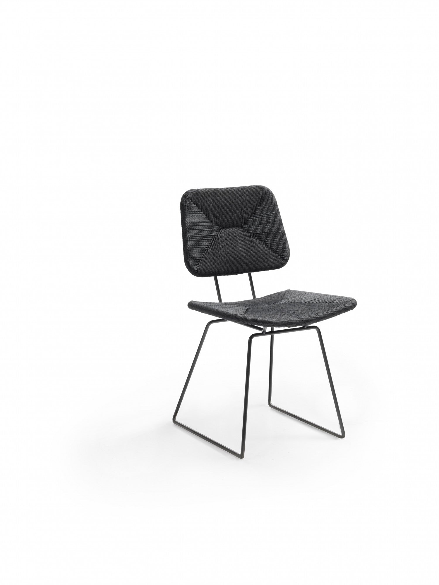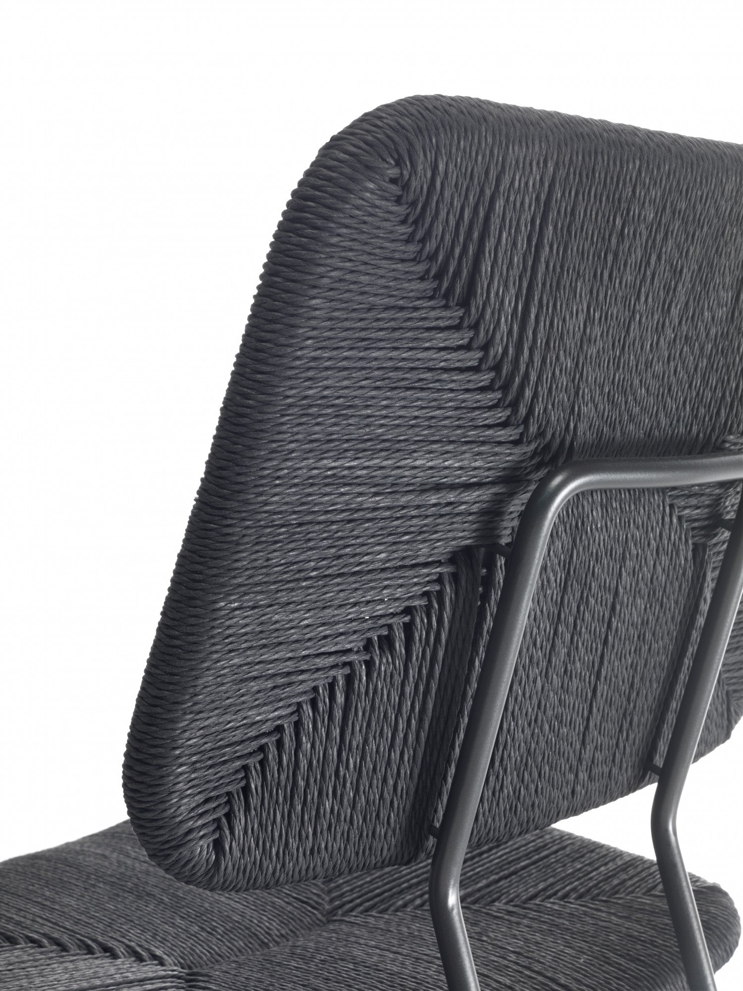 Its construction displays a bold material contrast: the structure is in sleek metal while the seat and backrest are made of fine woven paper or paper rush cord – complex craftsmanship reminiscent of traditional methods and still performed entirely by hand.