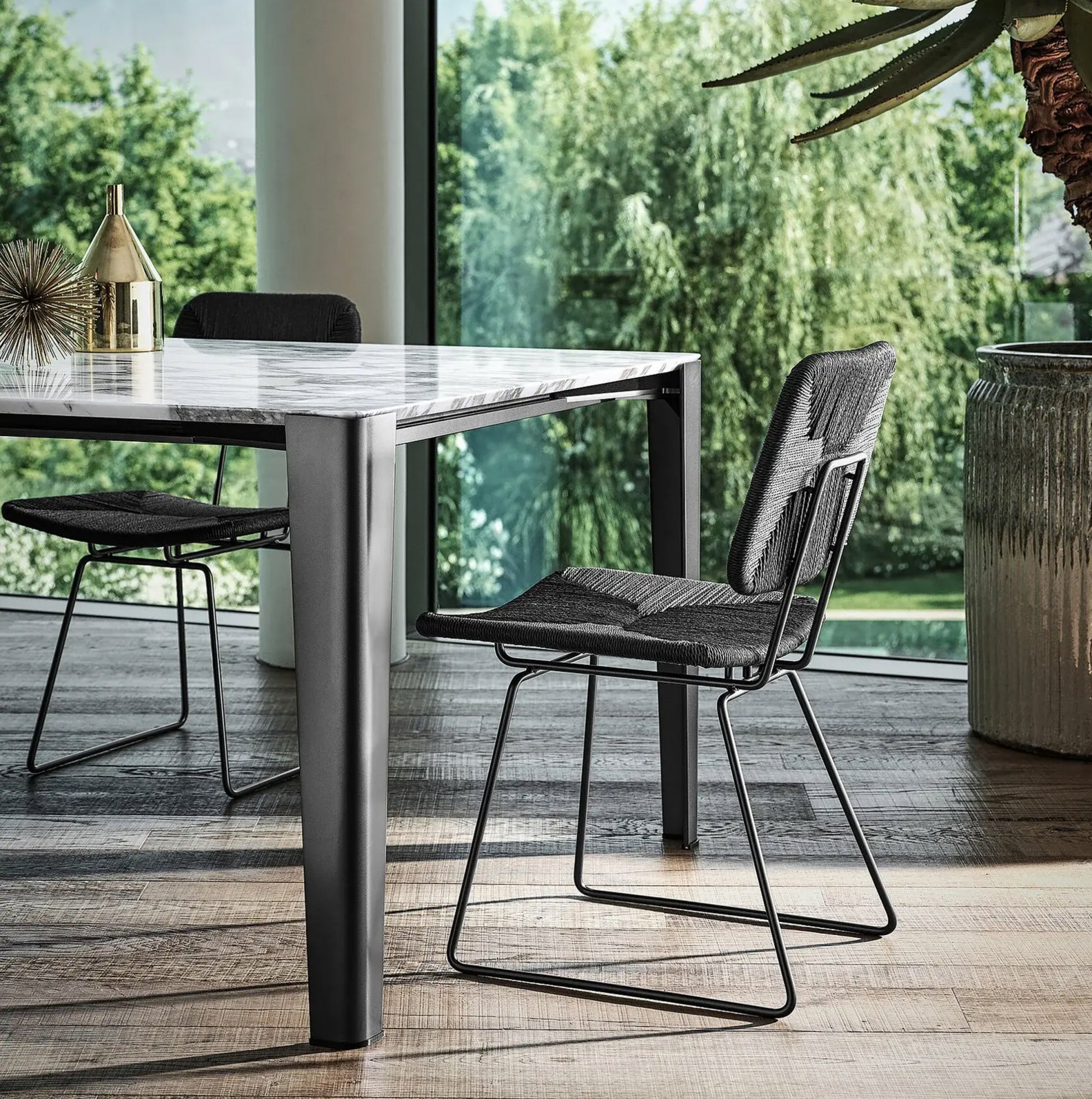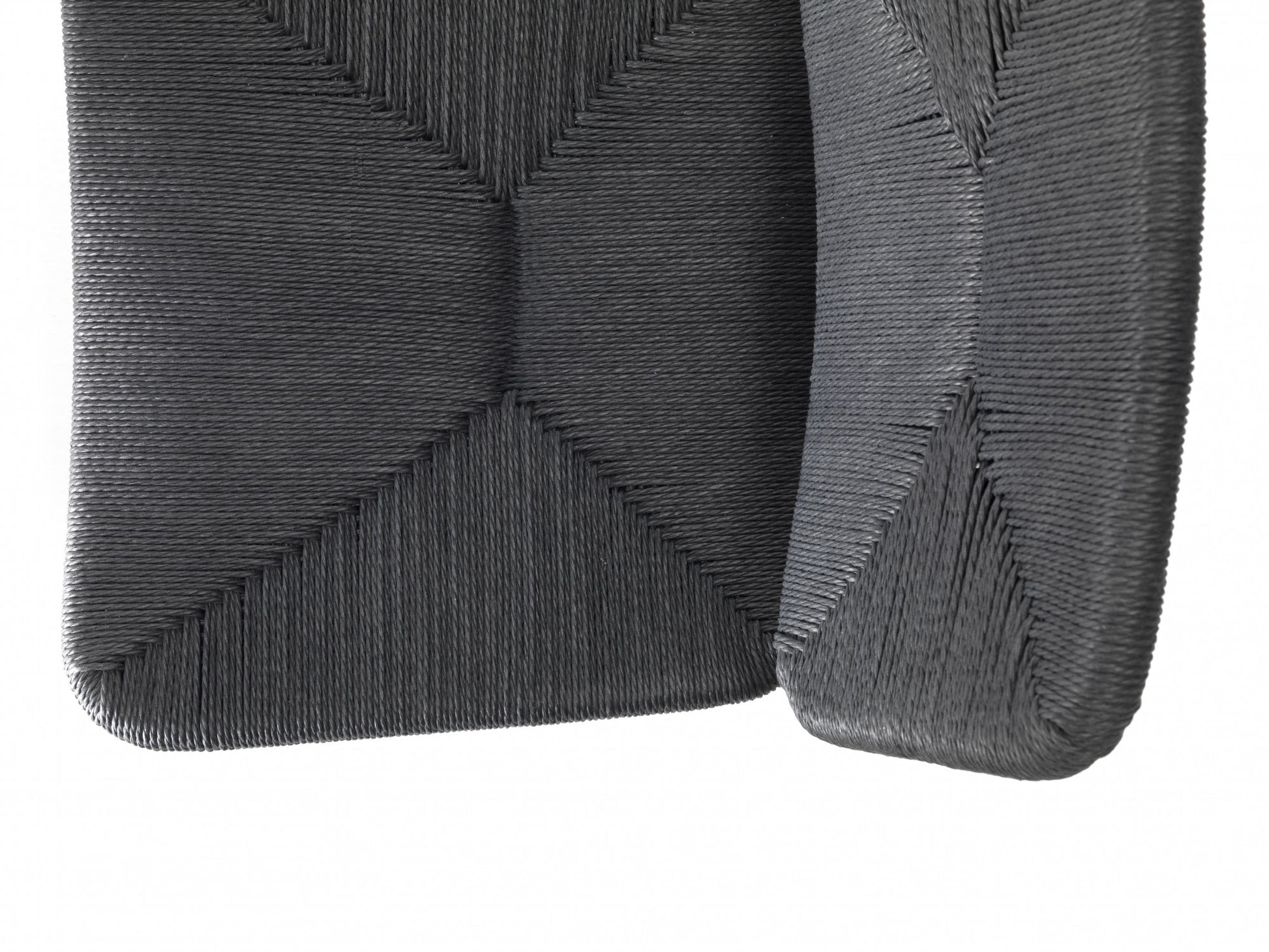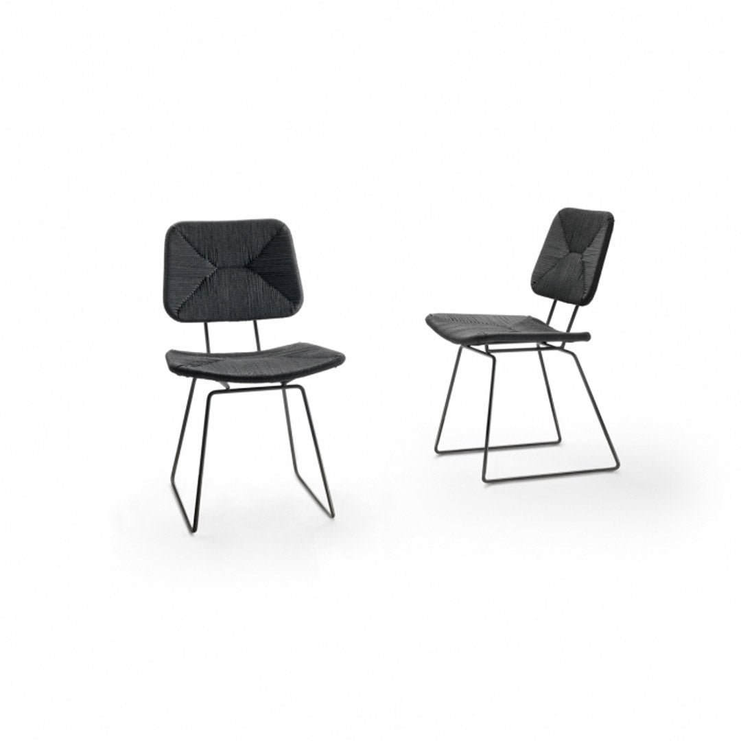 Its construction displays a bold material contrast: the structure is in sleek metal while the seat and backrest are made of fine woven paper or paper rush cord – complex craftsmanship reminiscent of traditional methods and still performed entirely by hand.