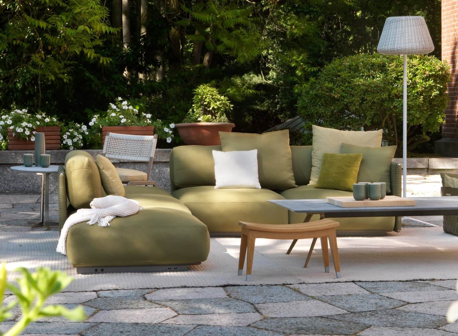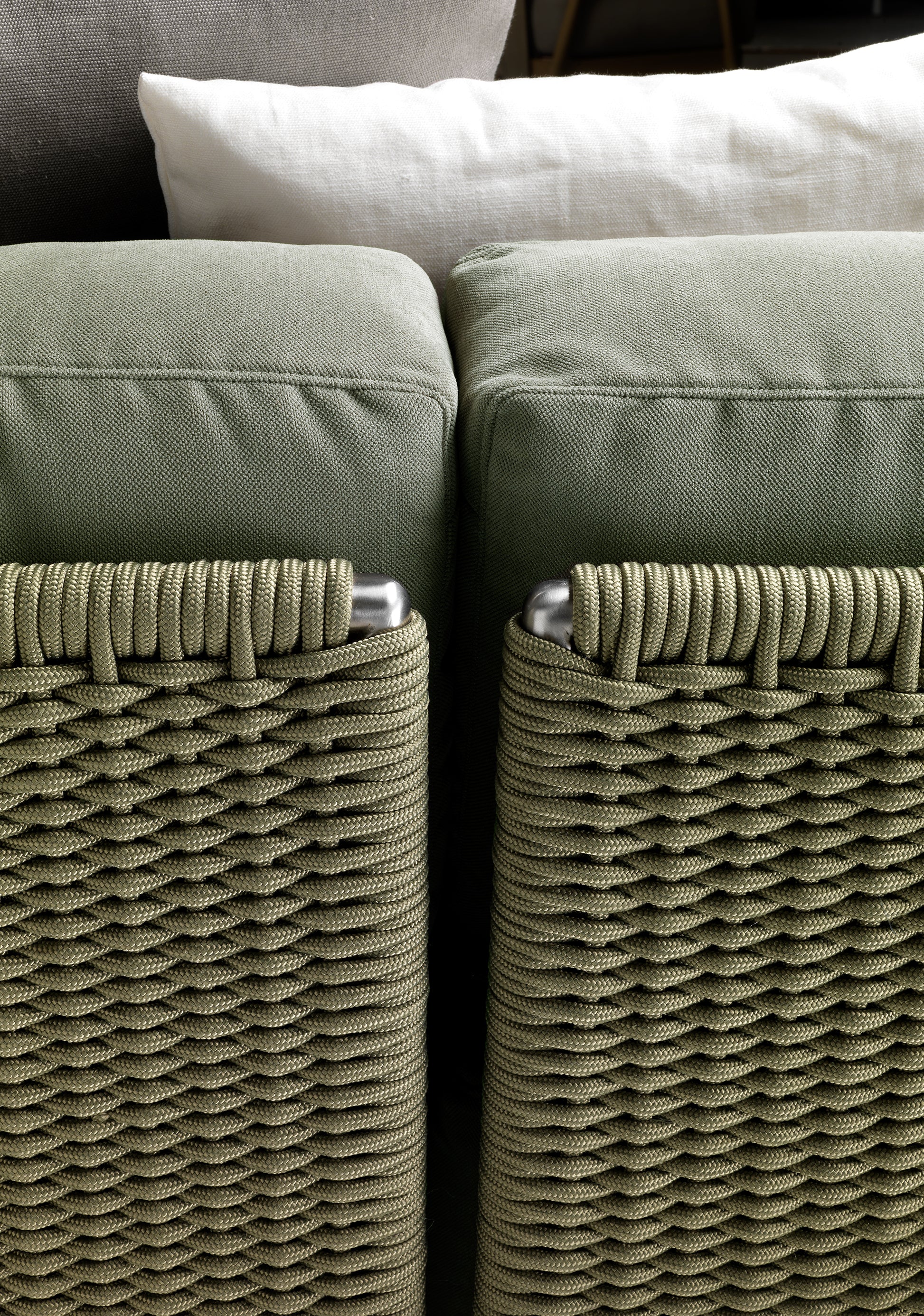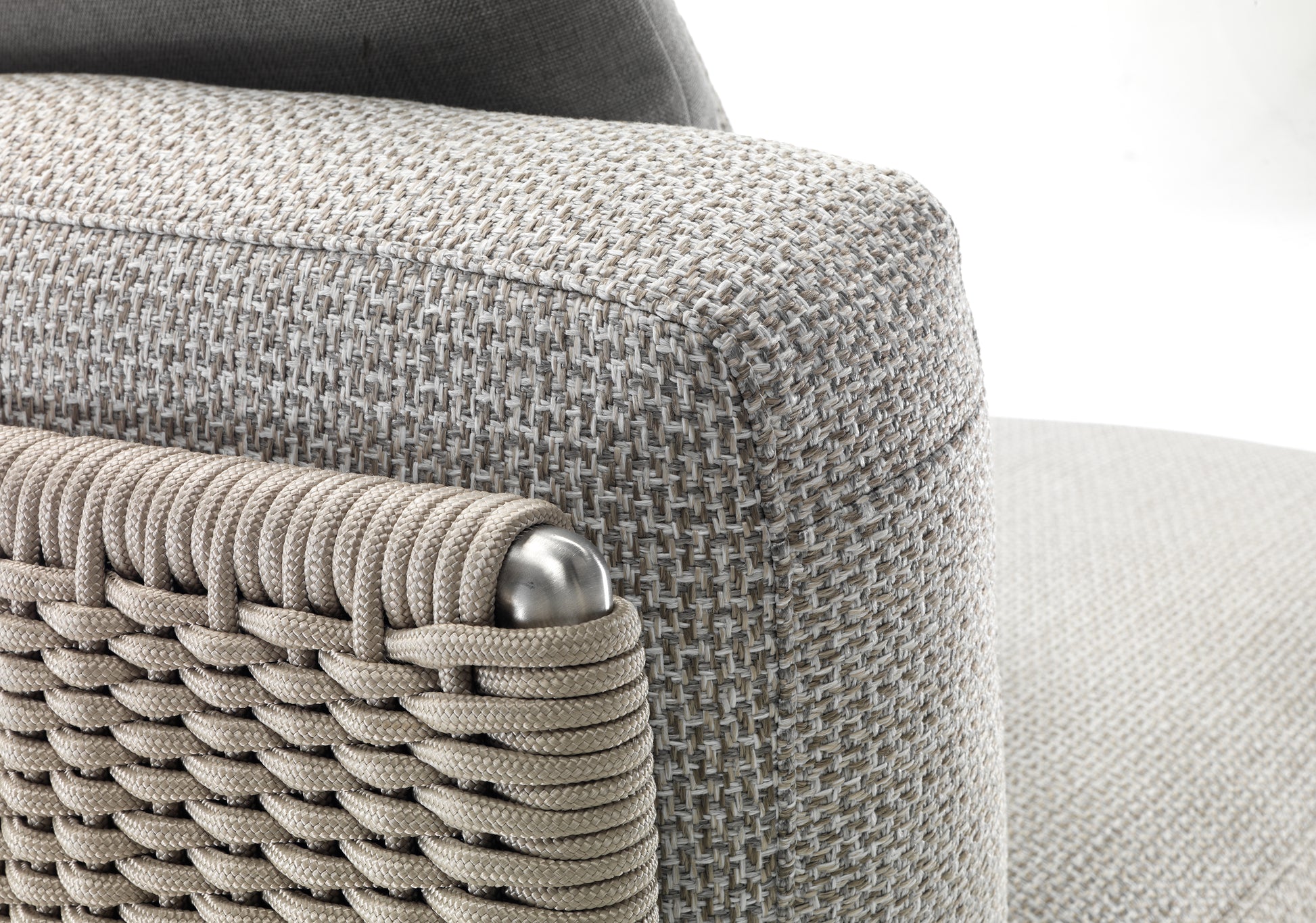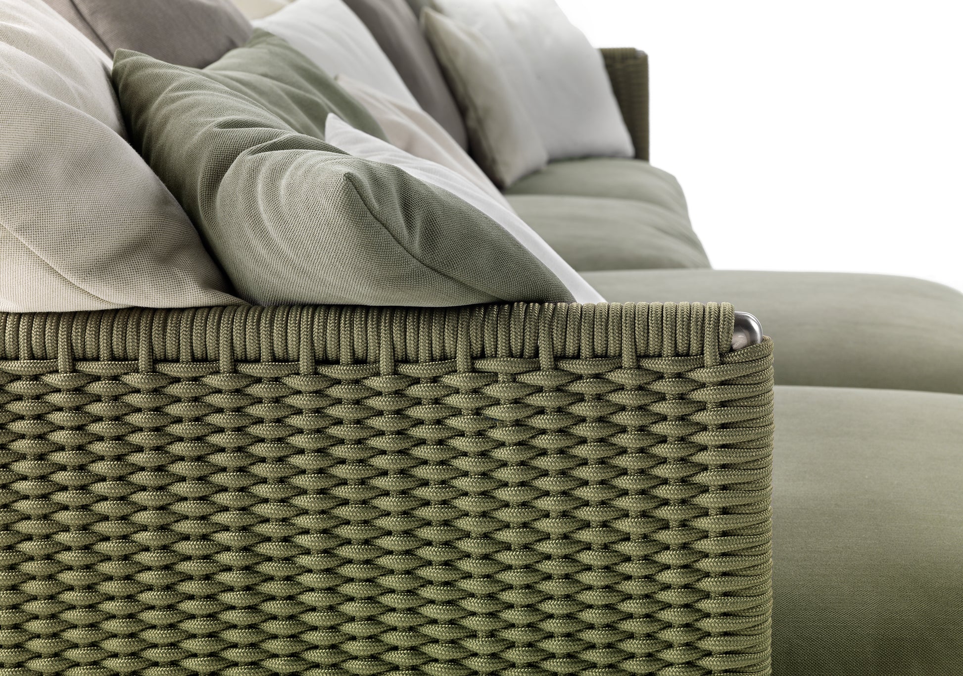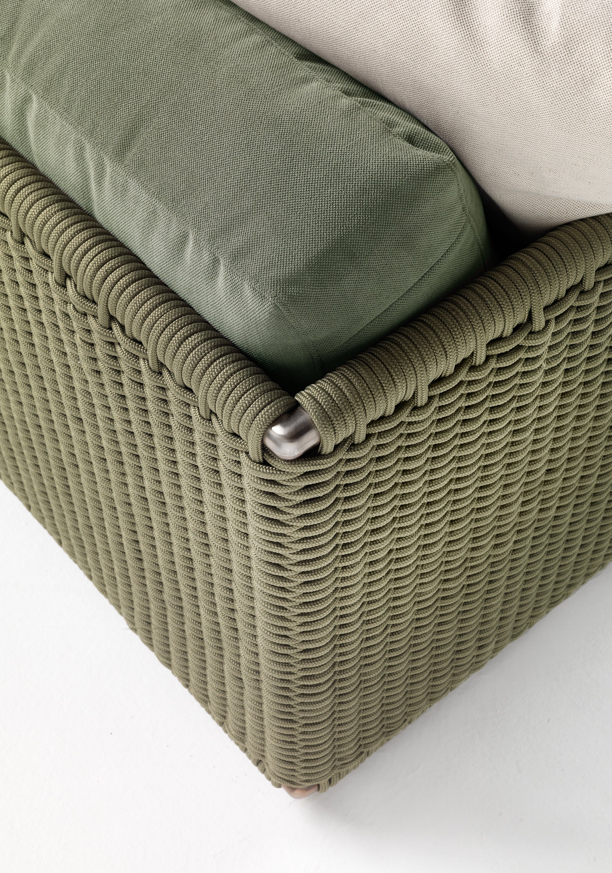 The visual lightness of the woven structure contrasts with the generously padded seat and backrest cushions. To ensure optimal outdoor performance, all the upholstered pieces are encased in a special lining made of breathable water-repellent fabric, while the vast collection of outdoor textiles guarantees excellent resistance not only to the effects of weather and the sun but also to chlorine and salt water.