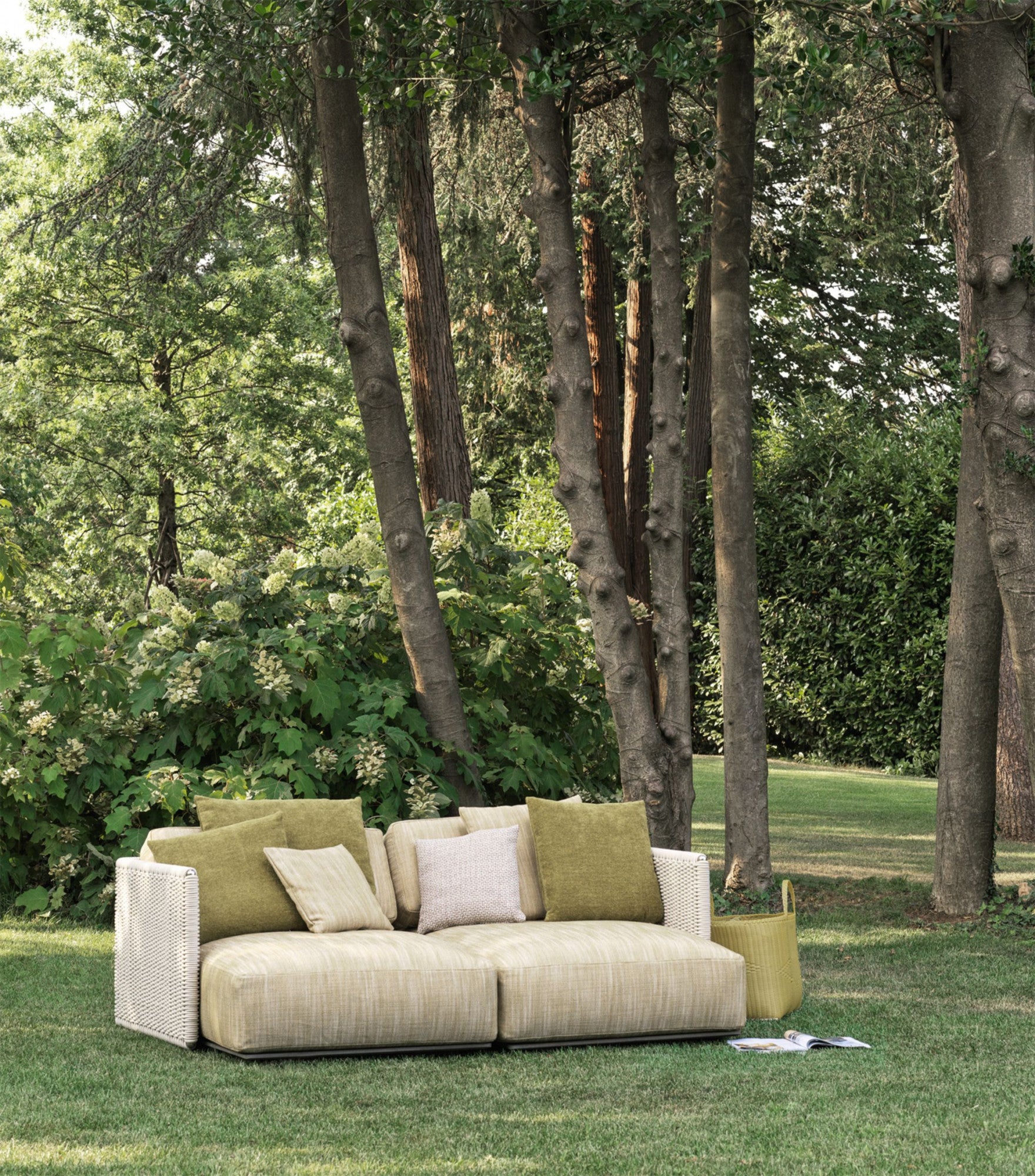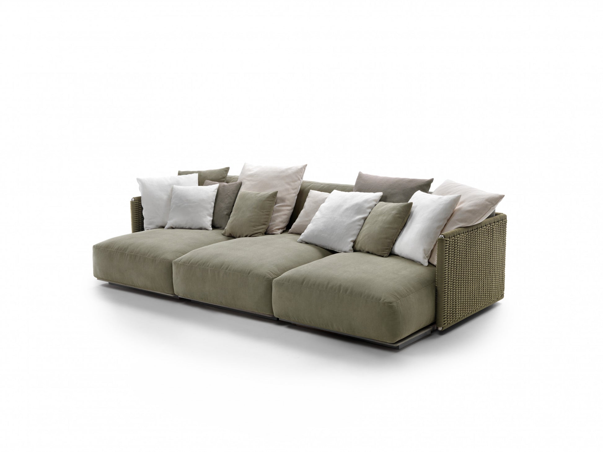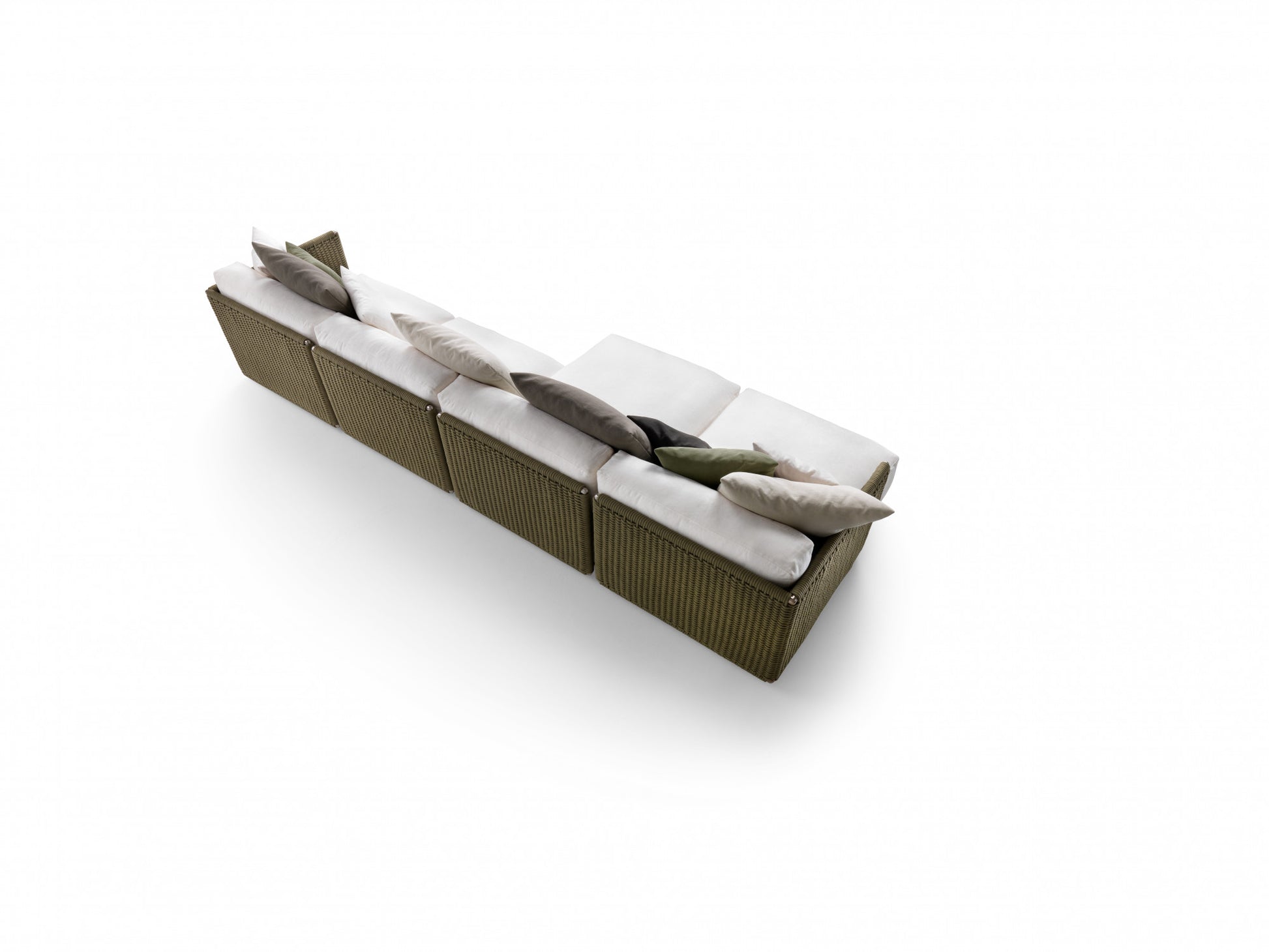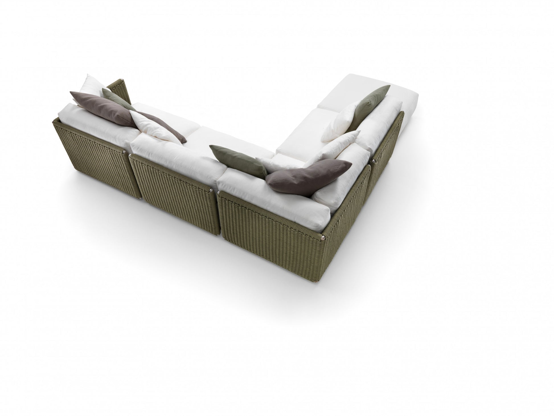 The visual lightness of the woven structure contrasts with the generously padded seat and backrest cushions. To ensure optimal outdoor performance, all the upholstered pieces are encased in a special lining made of breathable water-repellent fabric, while the vast collection of outdoor textiles guarantees excellent resistance not only to the effects of weather and the sun but also to chlorine and salt water.