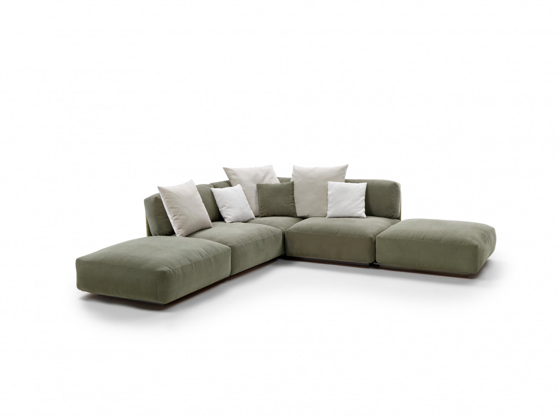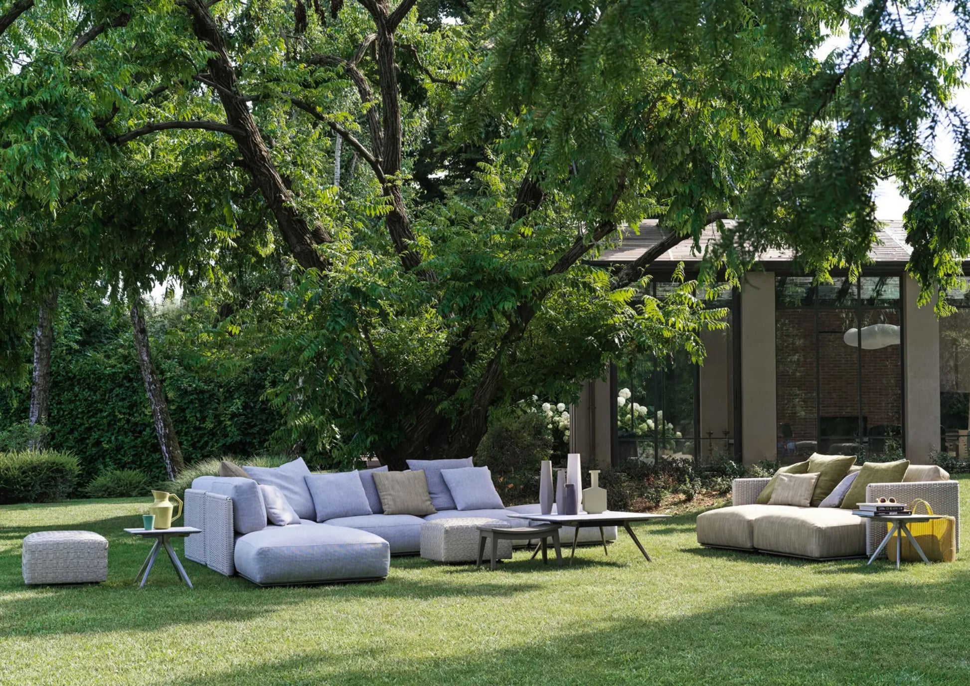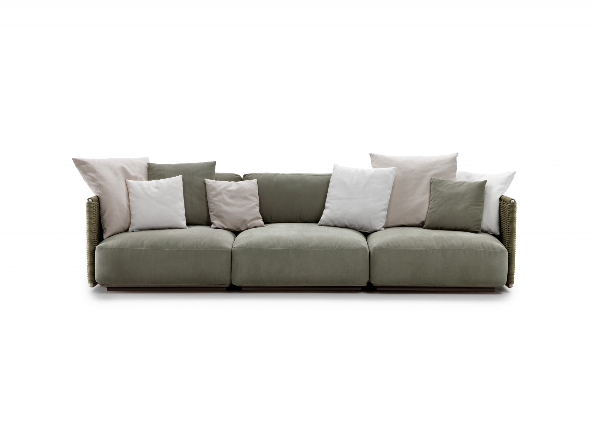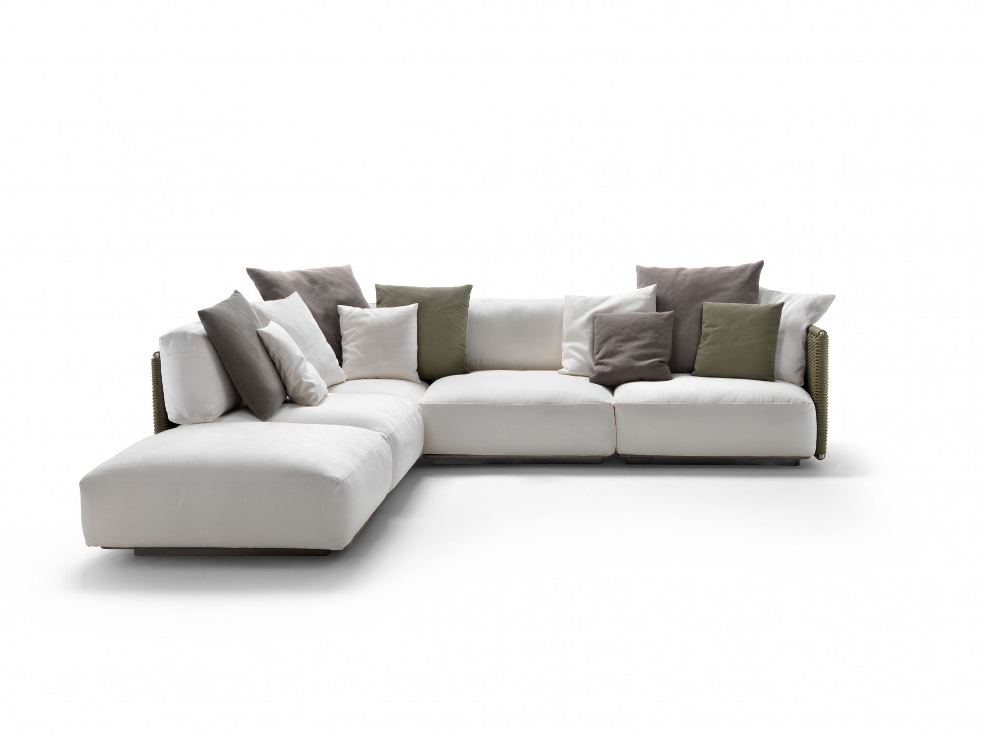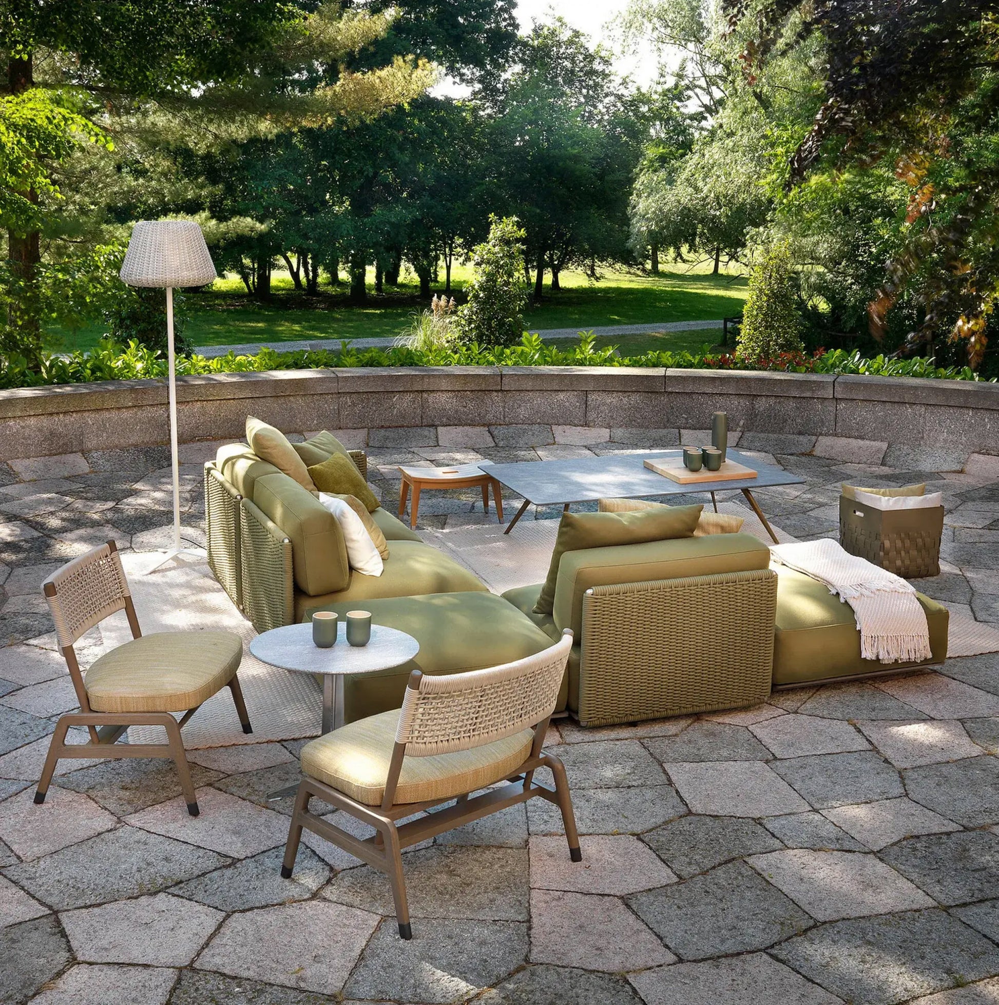 The visual lightness of the woven structure contrasts with the generously padded seat and backrest cushions. To ensure optimal outdoor performance, all the upholstered pieces are encased in a special lining made of breathable water-repellent fabric, while the vast collection of outdoor textiles guarantees excellent resistance not only to the effects of weather and the sun but also to chlorine and salt water.