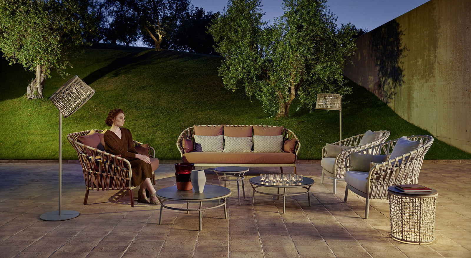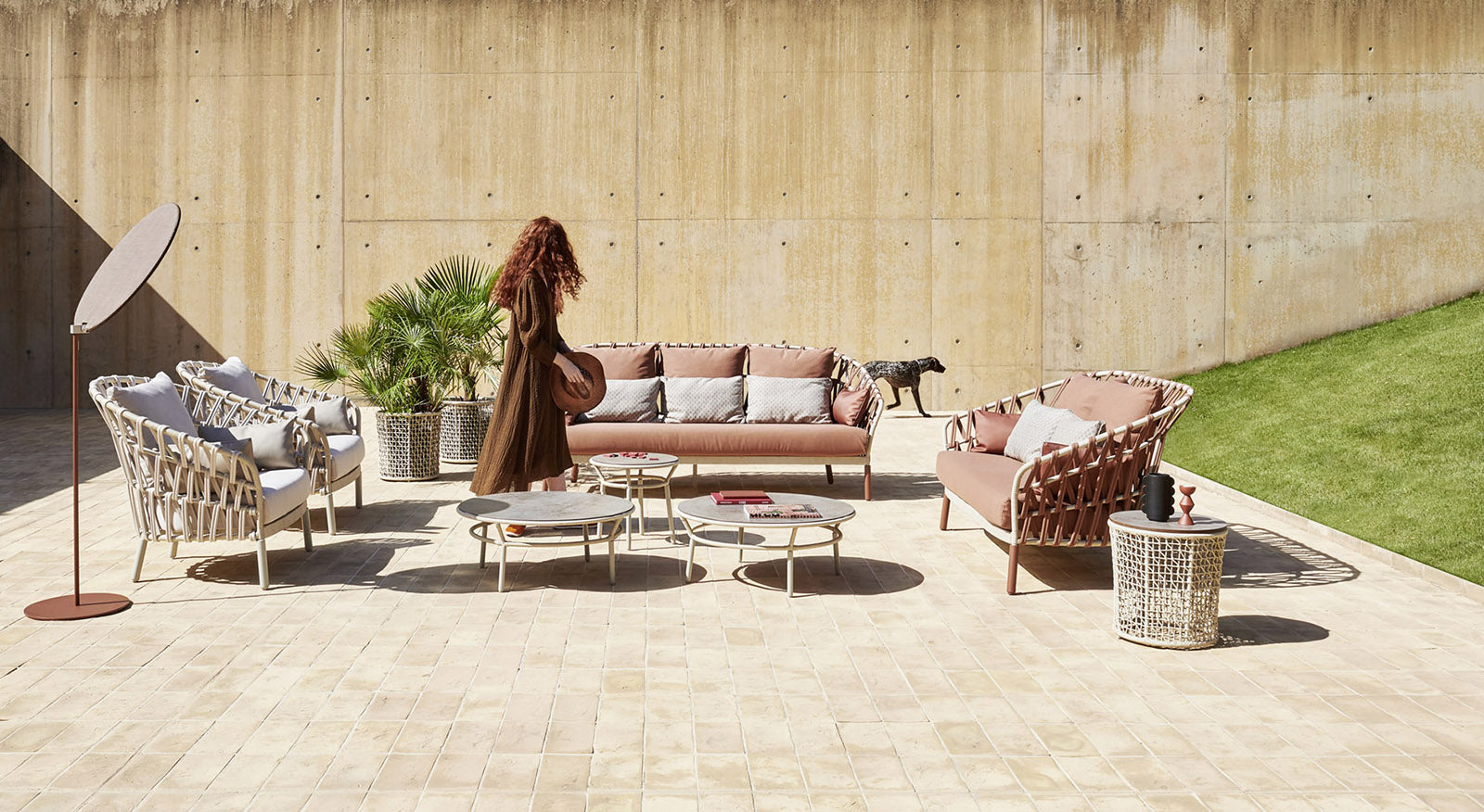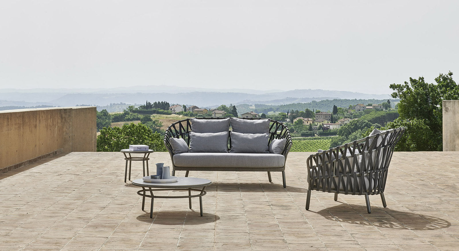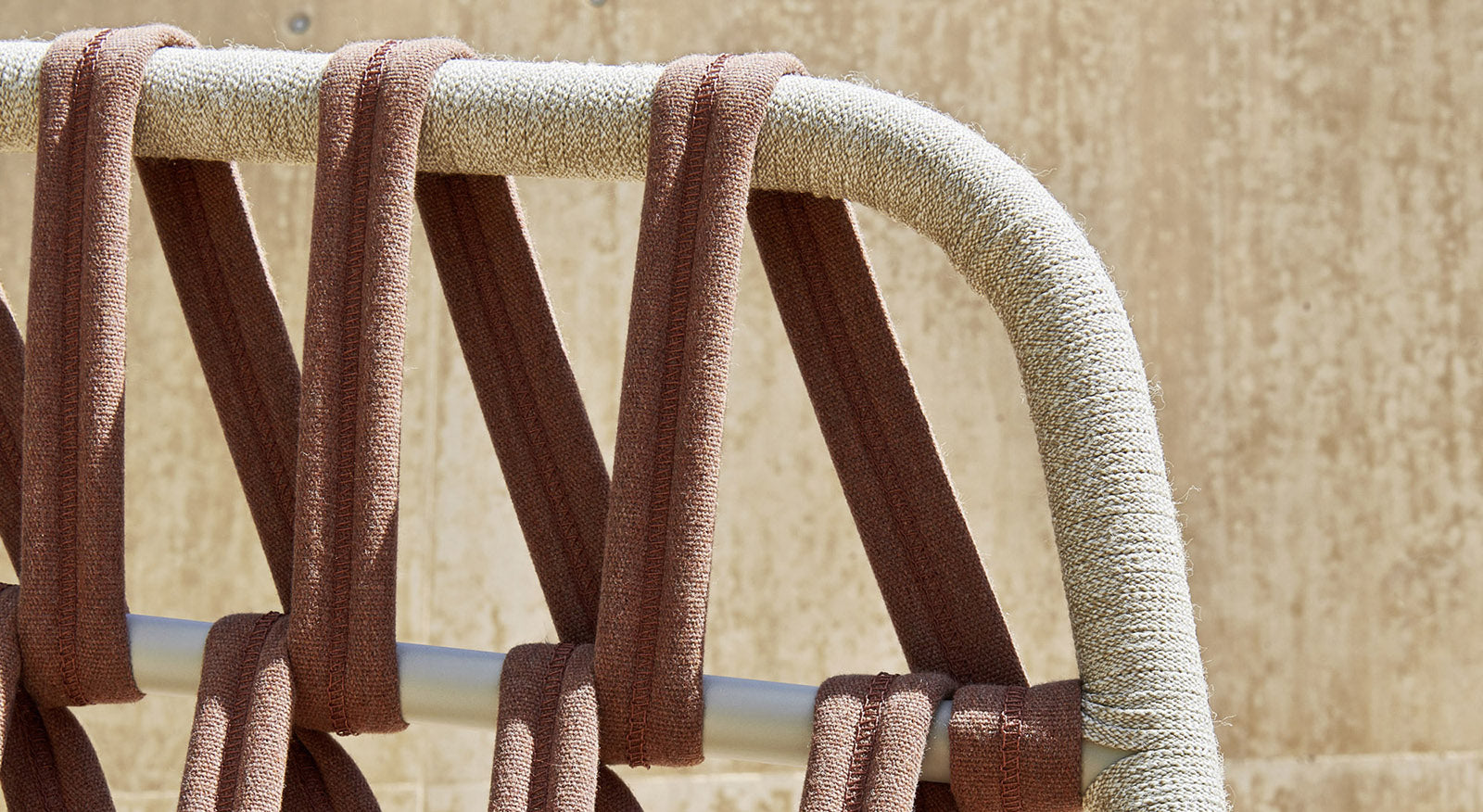 The handmade weaving, in acrylic fabric Band, redesigns, with the complicity of the solid and enveloping structure in powder-coated aluminium, the concept of the sofa, projecting it into a dimension of fresh formal lightness ideal for outdoor spaces. The seat cushion is in fabric padded with rubber Dryfeel® for outdoor use.