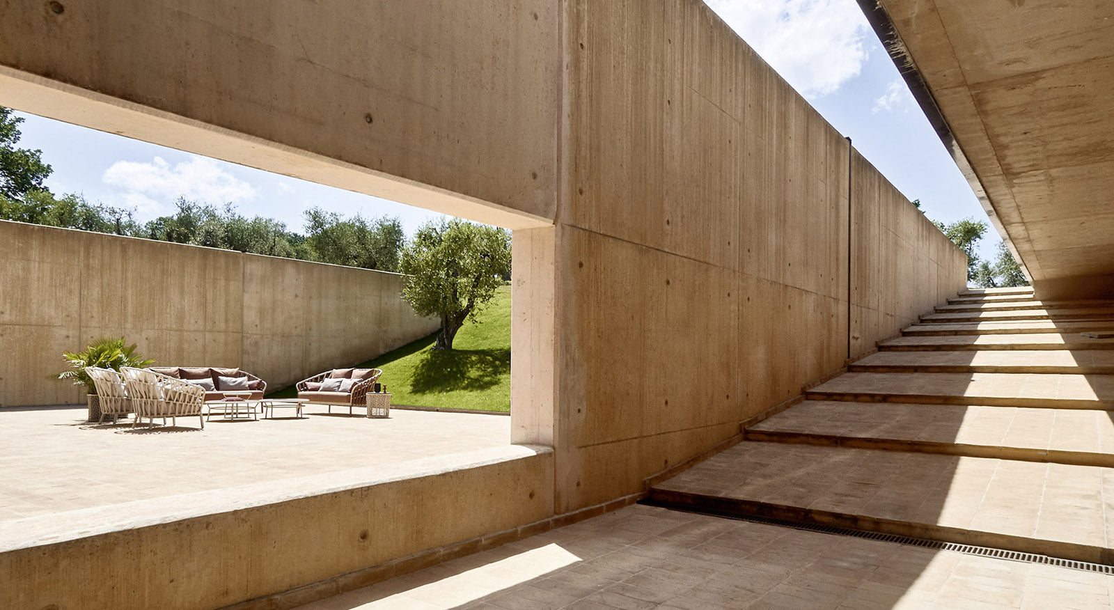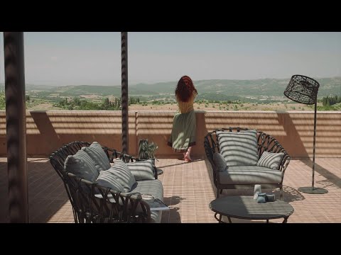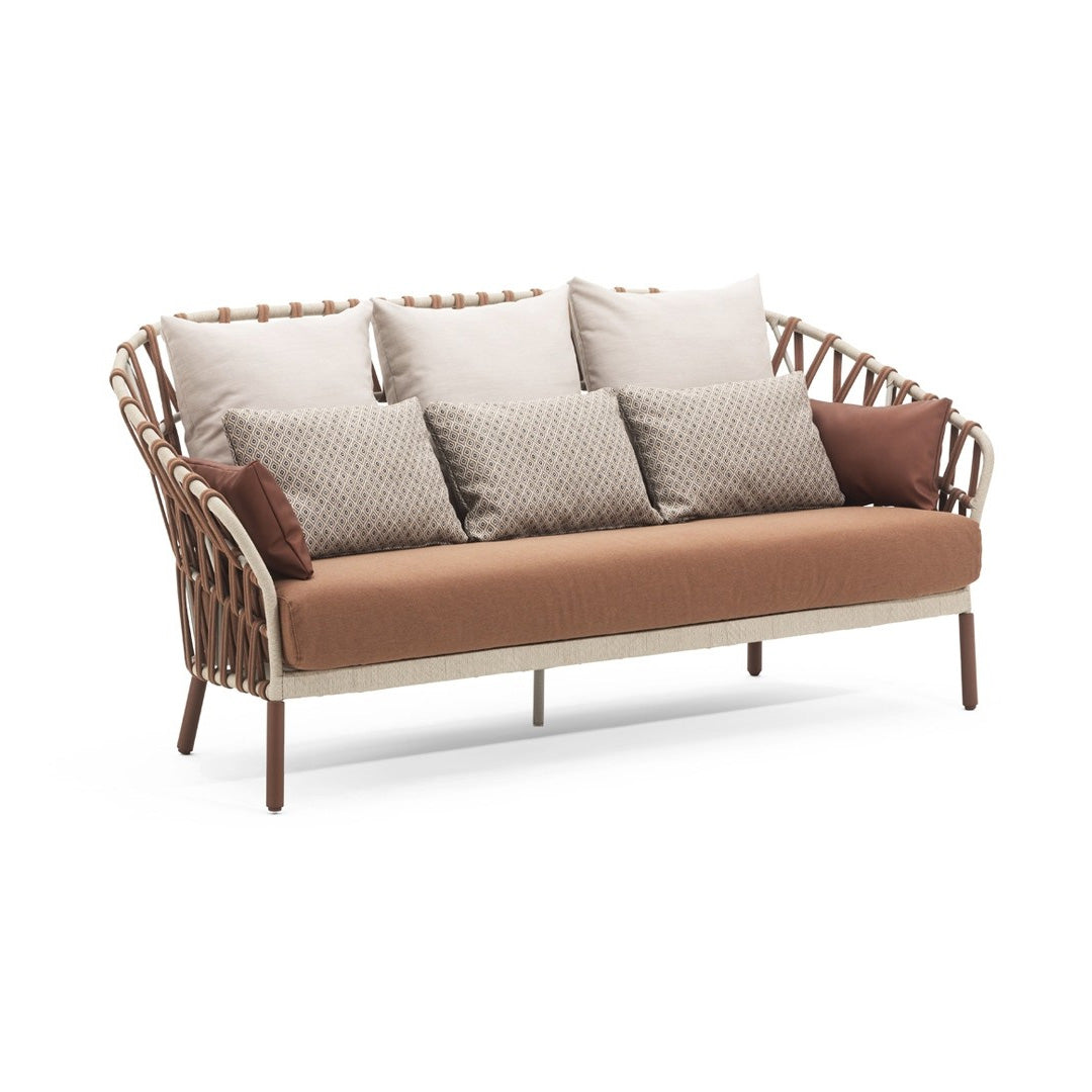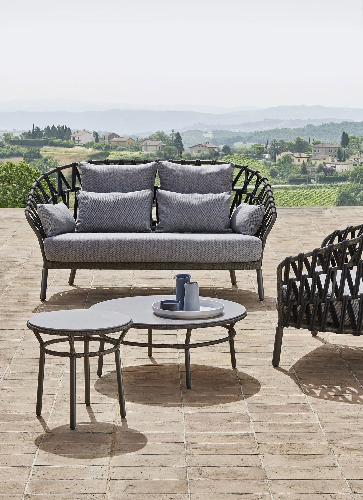 The handmade weaving, in acrylic fabric Band, redesigns, with the complicity of the solid and enveloping structure in powder-coated aluminium, the concept of the sofa, projecting it into a dimension of fresh formal lightness ideal for outdoor spaces. The seat cushion is in fabric padded with rubber Dryfeel® for outdoor use.