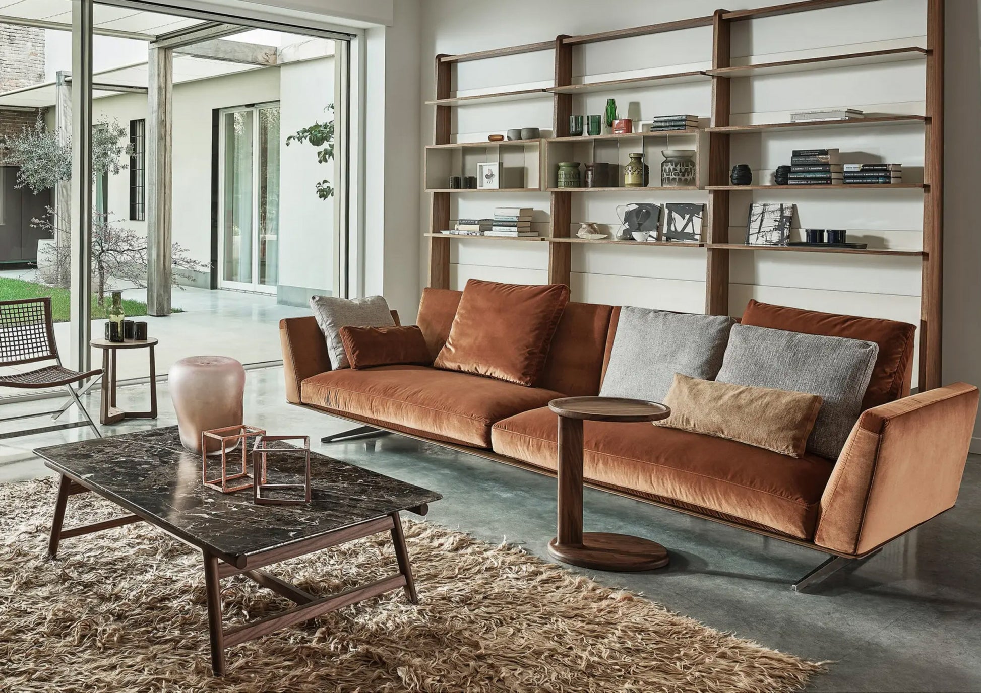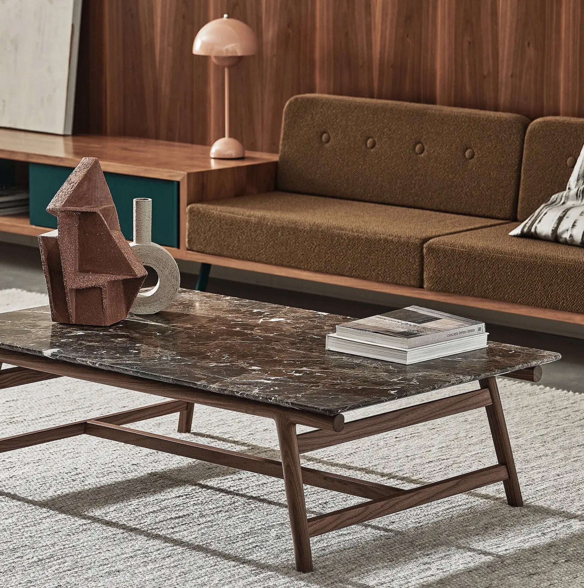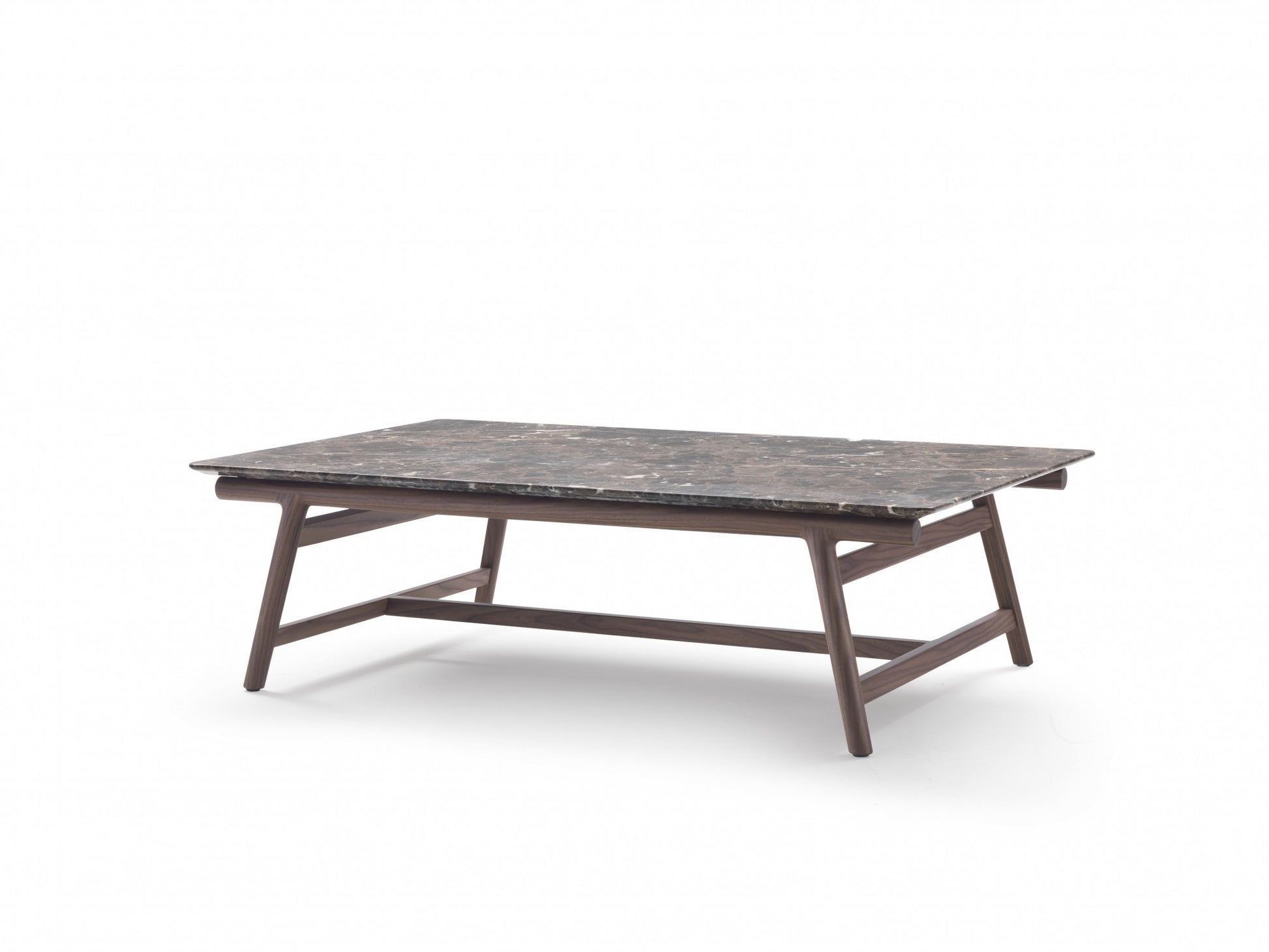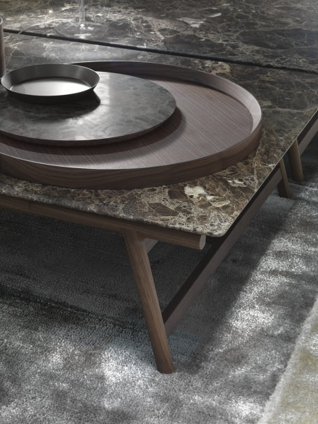 The exquisite materials employed set this family of coffee tables, side tables, consoles and ottomans in a class of its own. The aesthetic integrity of the design is enhanced by craftsmanship skills steeped in the cabinetmaking tradition. The elegantly-flared lines of the table base – made of solid wood, available in an array of stains – lend the tables and console an exceptional air of visual lightness. The top can also be crafted in wood, for dramatic textural effect or, if marble is the material of choice, to create an interplay of contrasts. If the Giano coffee table finds its natural habitat in front of a sofa, the console can be used behind the sofa, as a convenient table-top surface, as a stand-alone piece in an entry, or to complete the living room decor.