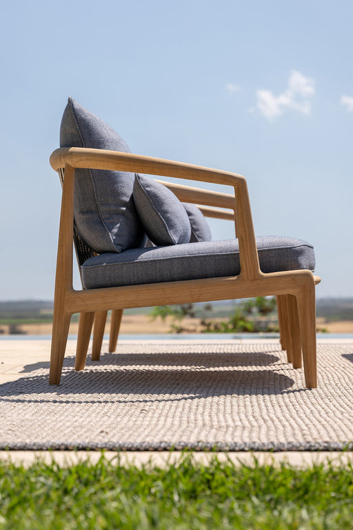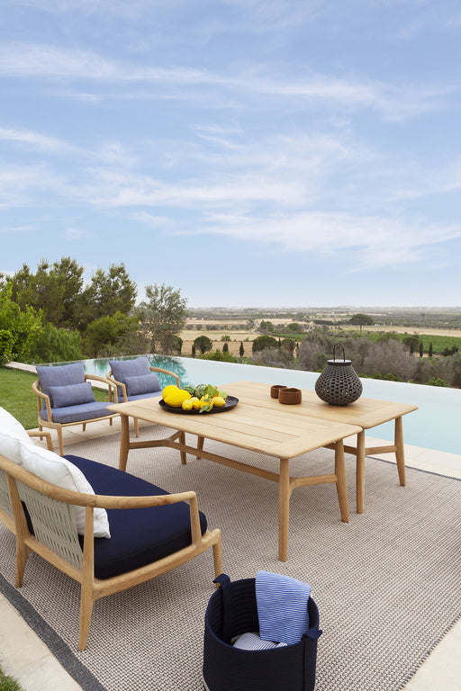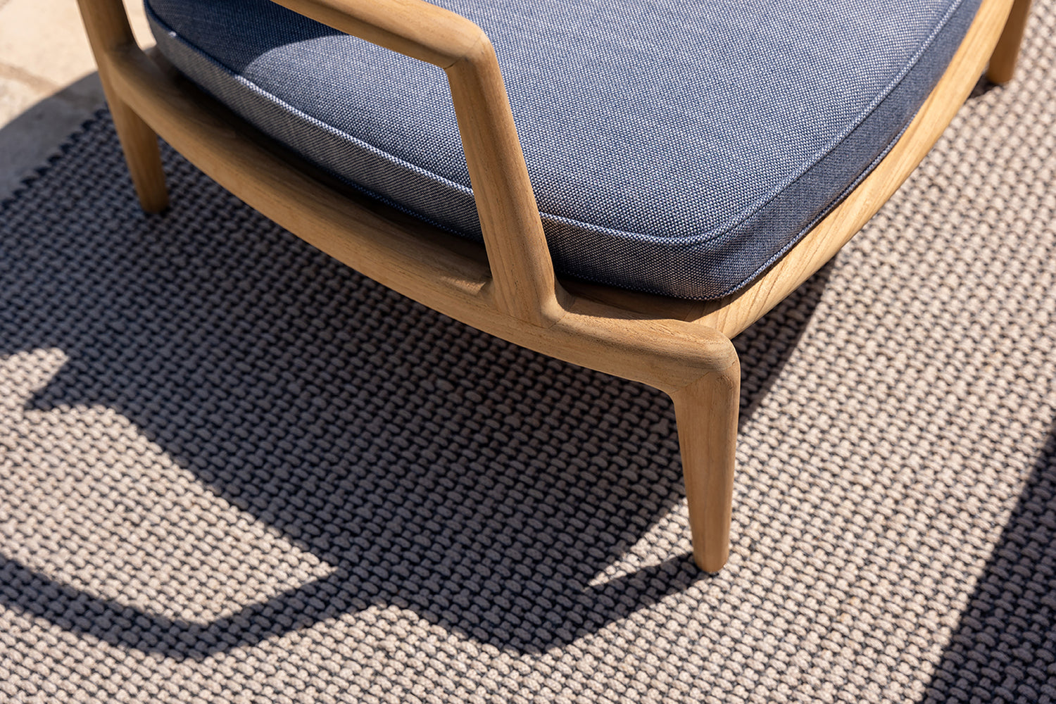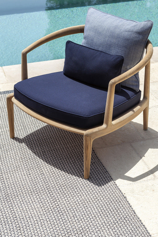With their distinctive personality and high-performance materials, Grand Vizier's outdoor rugs complement the living areas of open-air spaces with style and design, decorating gardens, terraces and verandas, as well as poolside areas and the decks of yachts and ships. The hand-woven rugs are made of a propylene yarn in two colour variants - light grey and dark grey - with a luxurious, three-dimensional pattern that makes use of two colours and alternating patterns and backgrounds. Resistant to wear and tear and weathering, they have an unprecedented soft touch. They are part of the Poltrona Frau Boundless Living Outdoor Collections.