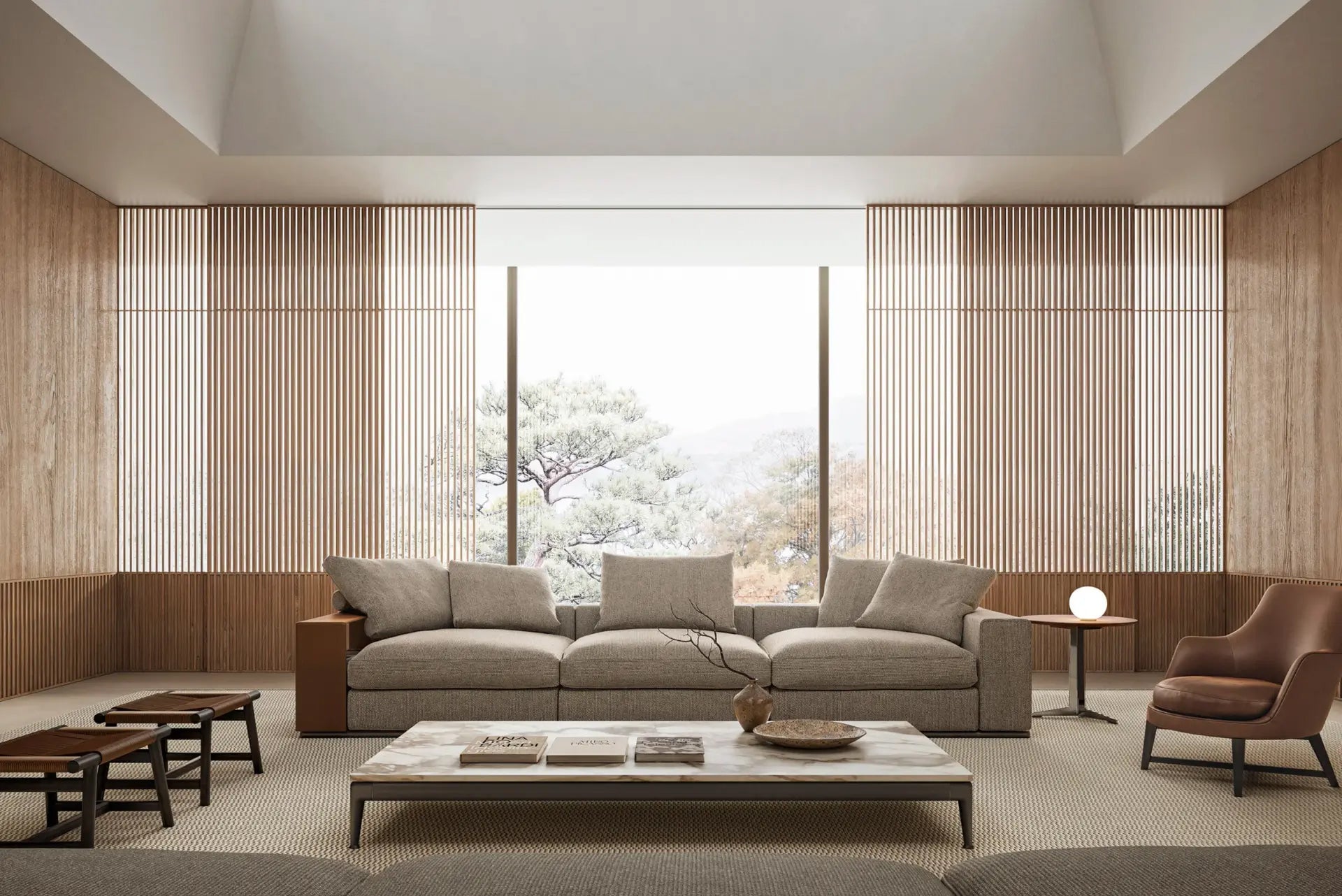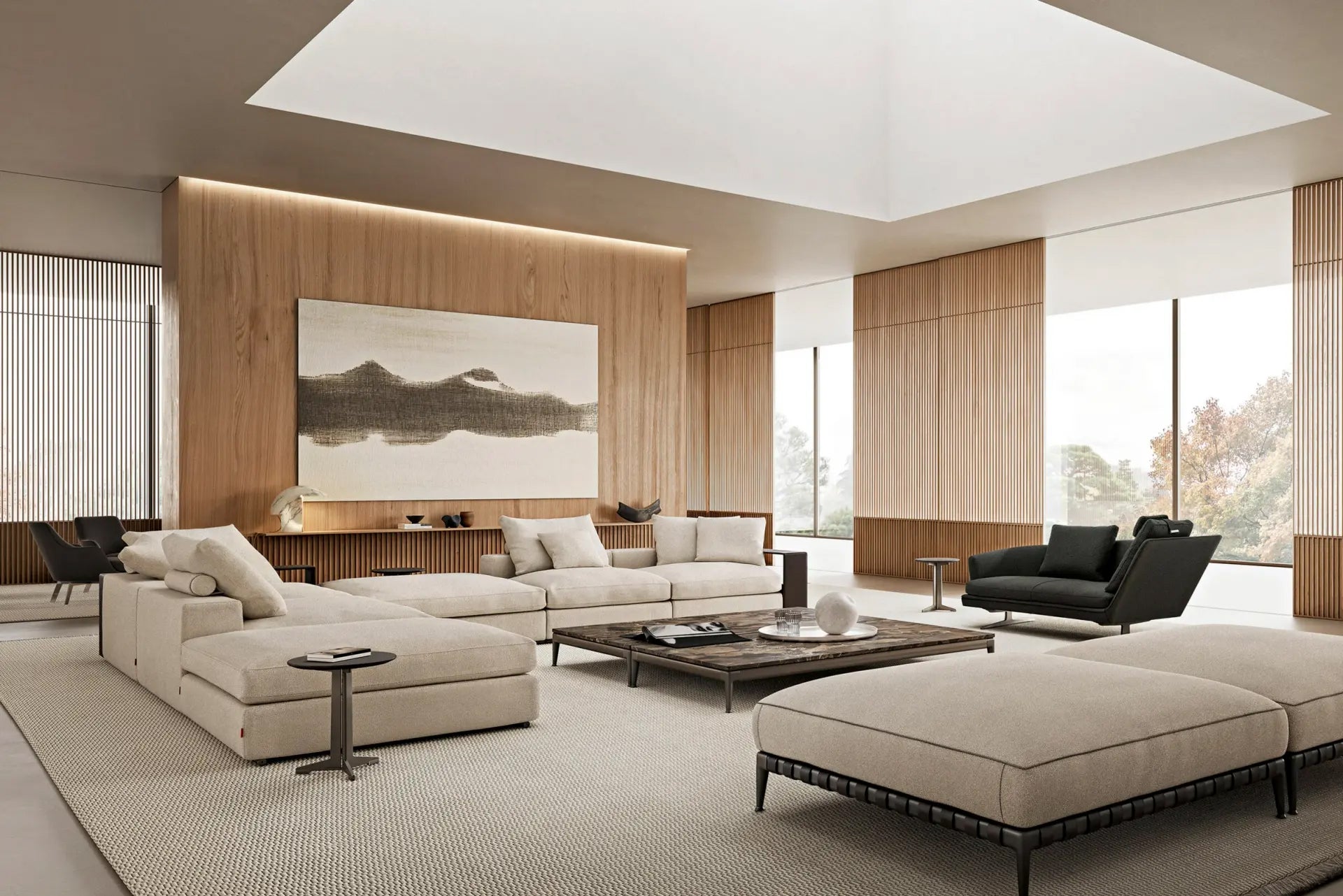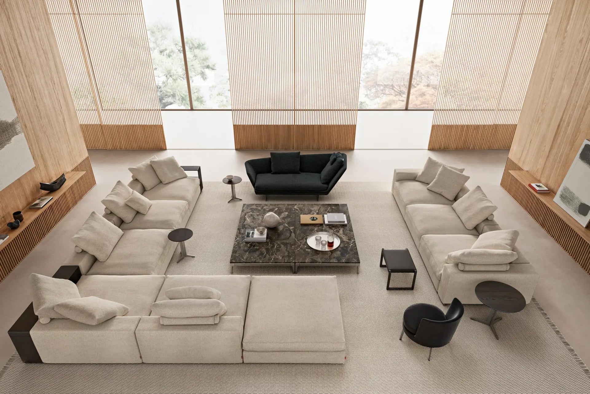 An undeniable best-seller from the Flexform collection, Groundpiece has transformed the very concept of the sofa, introducing several innovations. First of all, it is a deconstructed line with new proportions – the Groundpiece sofa is low and deep, designed as a more relaxed and casual approach to seating. Groundpiece embodies the quintessence of Flexform comfort and is exceptionally inviting, thanks to the amply-sized goose-down cushions. Groundpiece also allows for the utmost personalization of the padded elements that can be crafted in goose down, in the premium version, or in Dacron.