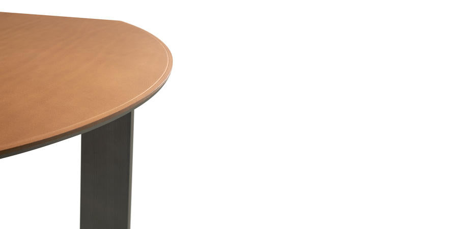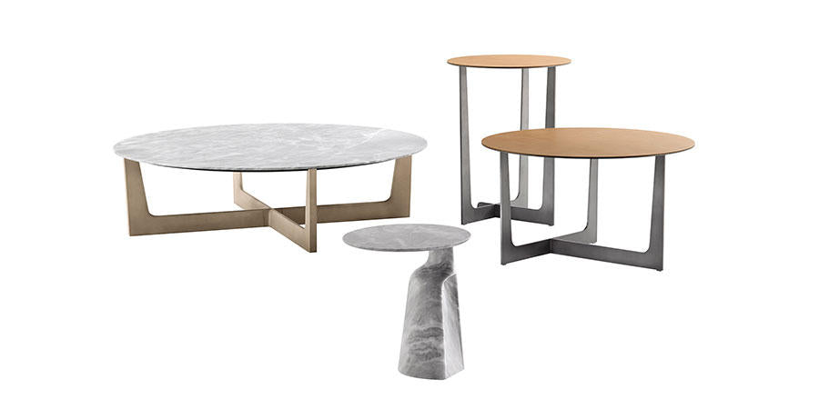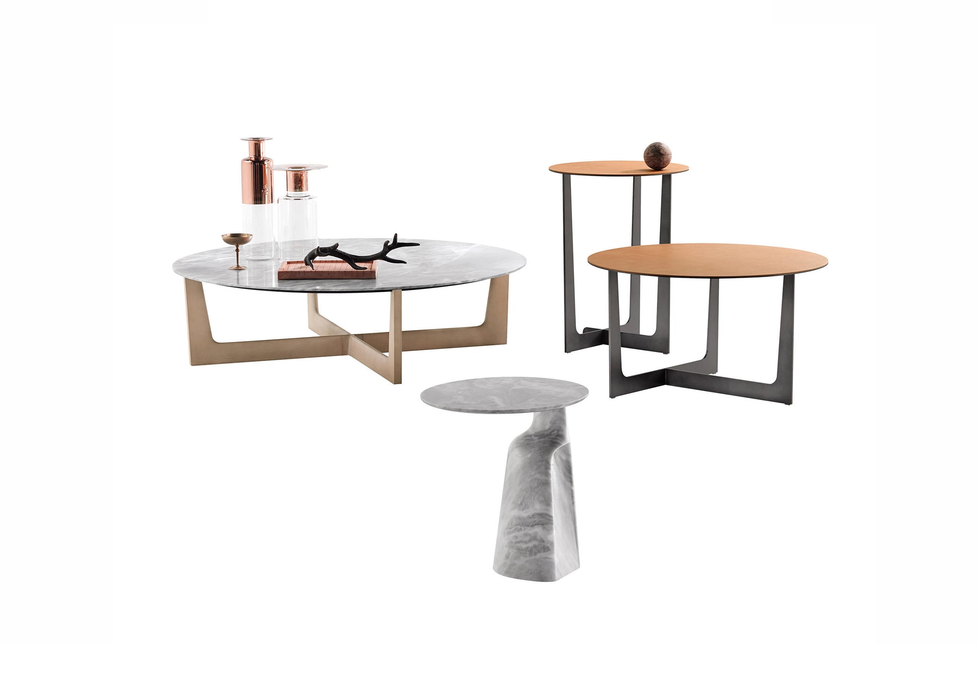 A range of five side tables of different heights, shapes and constructions. A mixture of finishes and materials, to create different effects and combinations.The two large and low side tables, available in rectangular or round versions, feature a solid ash base in a Havana brown finish and a semi-glossy Grigio Roma marble top. The lower shelf is in black painted birch plywood.Material variations in the two smaller and taller round side tables. The brushed burnished steel base combines elegantly with the top upholstered in Cuoio Saddle Extra leather. The lower table is also available with a Grigio Roma marble top. The lower shelf is in black painted steel. Sculpted entirely from Grigio Roma marble with a semi-glossy finish, the monolithic side table completes the collection. The top is round and the support is characterised by a striking handle-groove that makes it easy to move the side table. An invisible steel frame unites the two elements.