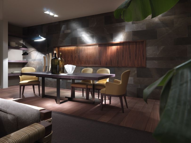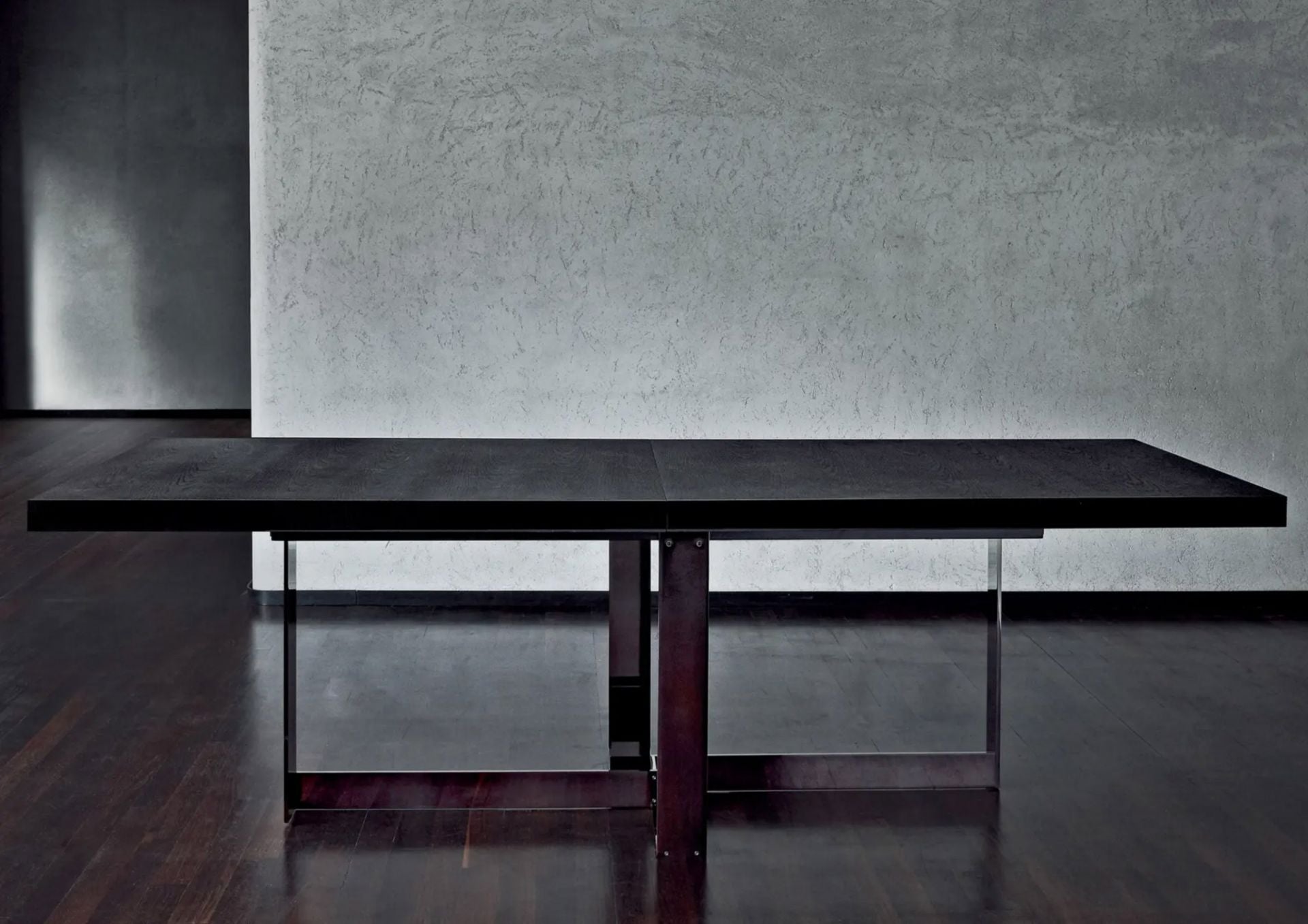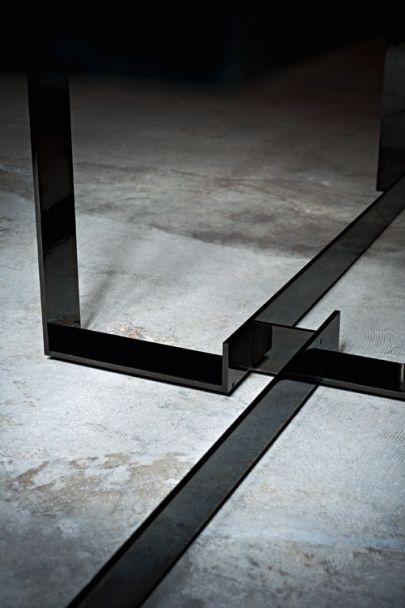 A geometric design for large and small tables with an original metal structure. The top is in solid wood for the dining table, and in marble for the square and rectangular small tables. The particular metal base with flat-section posts forms a sort of overlapped cross on the floor that becomes a very striking, distinctive feature. The combination of metal/wood and metal/marble is a refined and always timely touch, playing with the contrast between cool and warm materials.