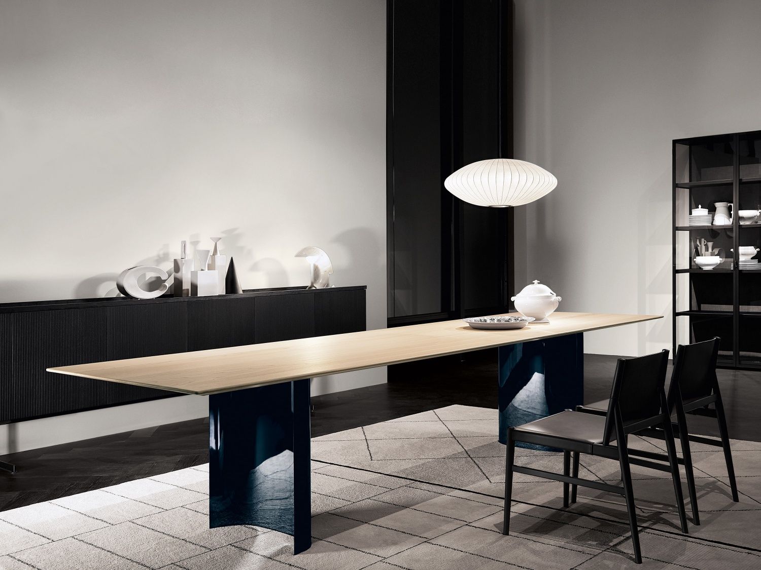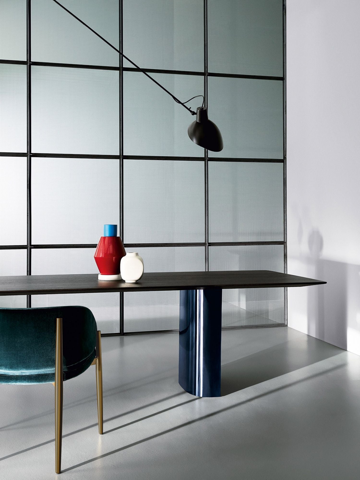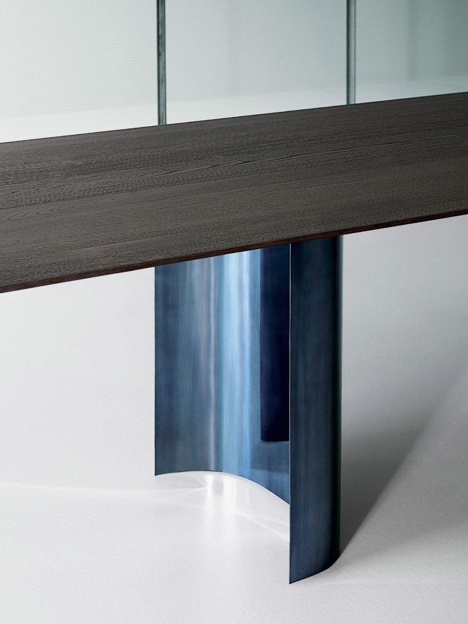 Jeff, the table designed by Oscar and Gabriele Buratti, plays with the fascinated reaction between mirrored surfaces: an intriguing theme which is typical of diverse contemporary artistic paths swaying between minimalism and maximalism. The streamlined solid chestnut top appears to be suspended on two metal central bases, whose particular geometry - an open semi-curve in blue pigmented glossy aluminum - is finished by hand, thus triggering ever changing reflection effects. The top, made of selected slats of natural or black stained solid chestnut, features the customized design of a tapered edge that gives extreme lightness to the very thick top. A further rounding on the entire perimeter softens the edges creating a small sphere on each of the four corners.