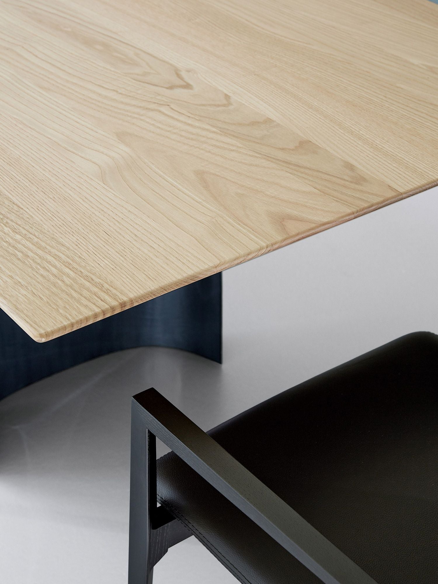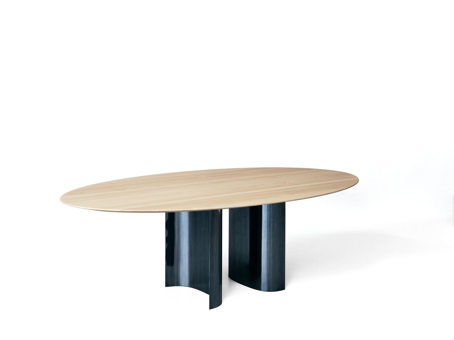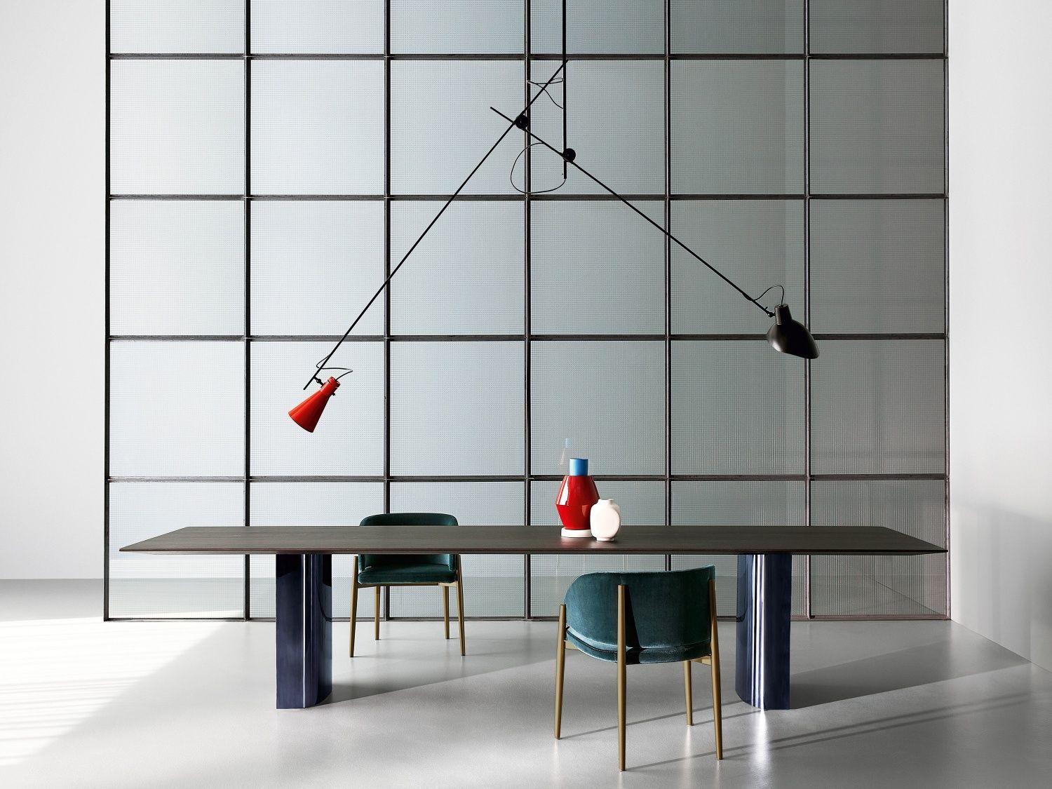 Jeff, the table designed by Oscar and Gabriele Buratti, plays with the fascinated reaction between mirrored surfaces: an intriguing theme which is typical of diverse contemporary artistic paths swaying between minimalism and maximalism. The streamlined solid chestnut top appears to be suspended on two metal central bases, whose particular geometry - an open semi-curve in blue pigmented glossy aluminum - is finished by hand, thus triggering ever changing reflection effects. The top, made of selected slats of natural or black stained solid chestnut, features the customized design of a tapered edge that gives extreme lightness to the very thick top. A further rounding on the entire perimeter softens the edges creating a small sphere on each of the four corners.