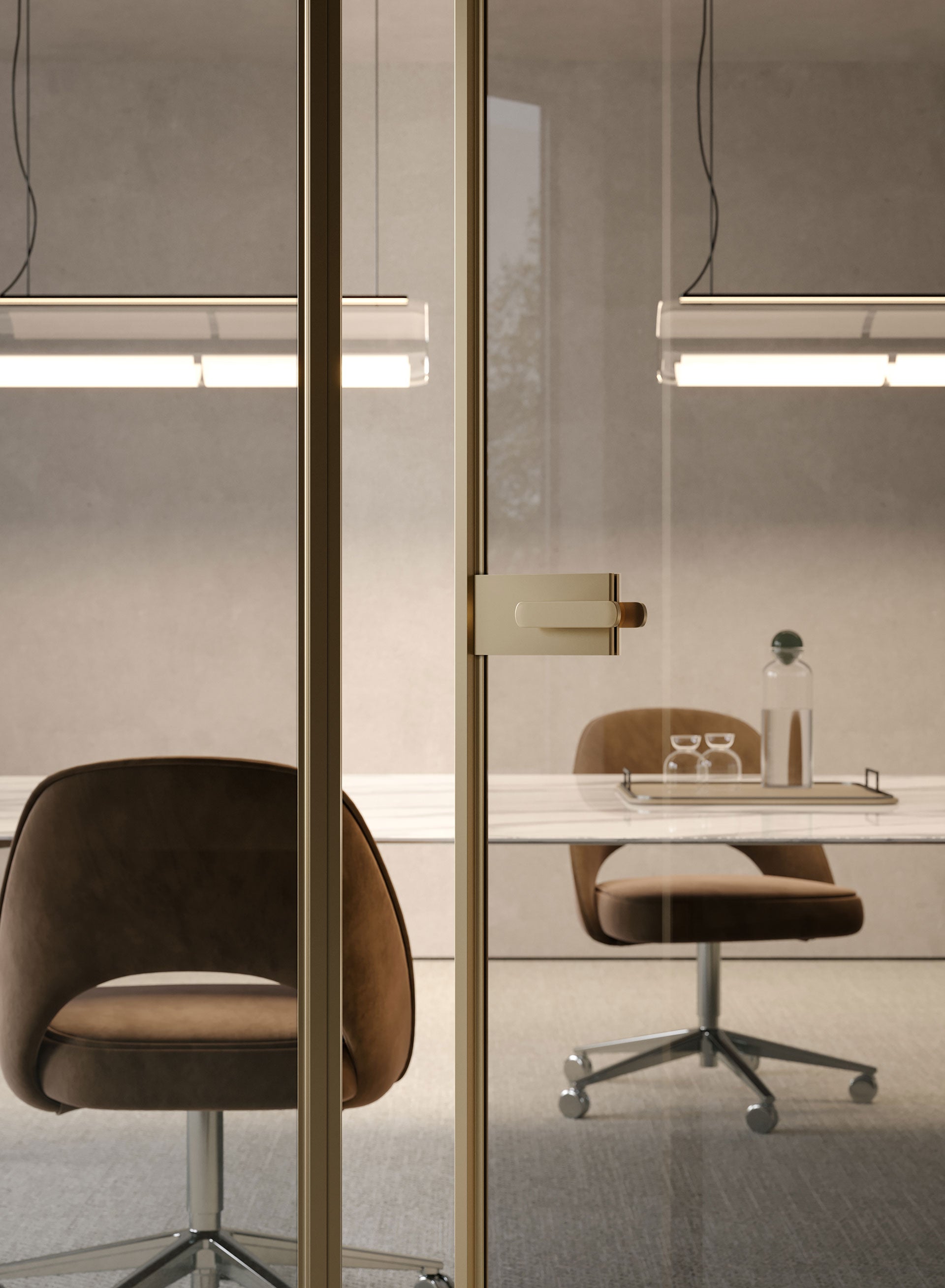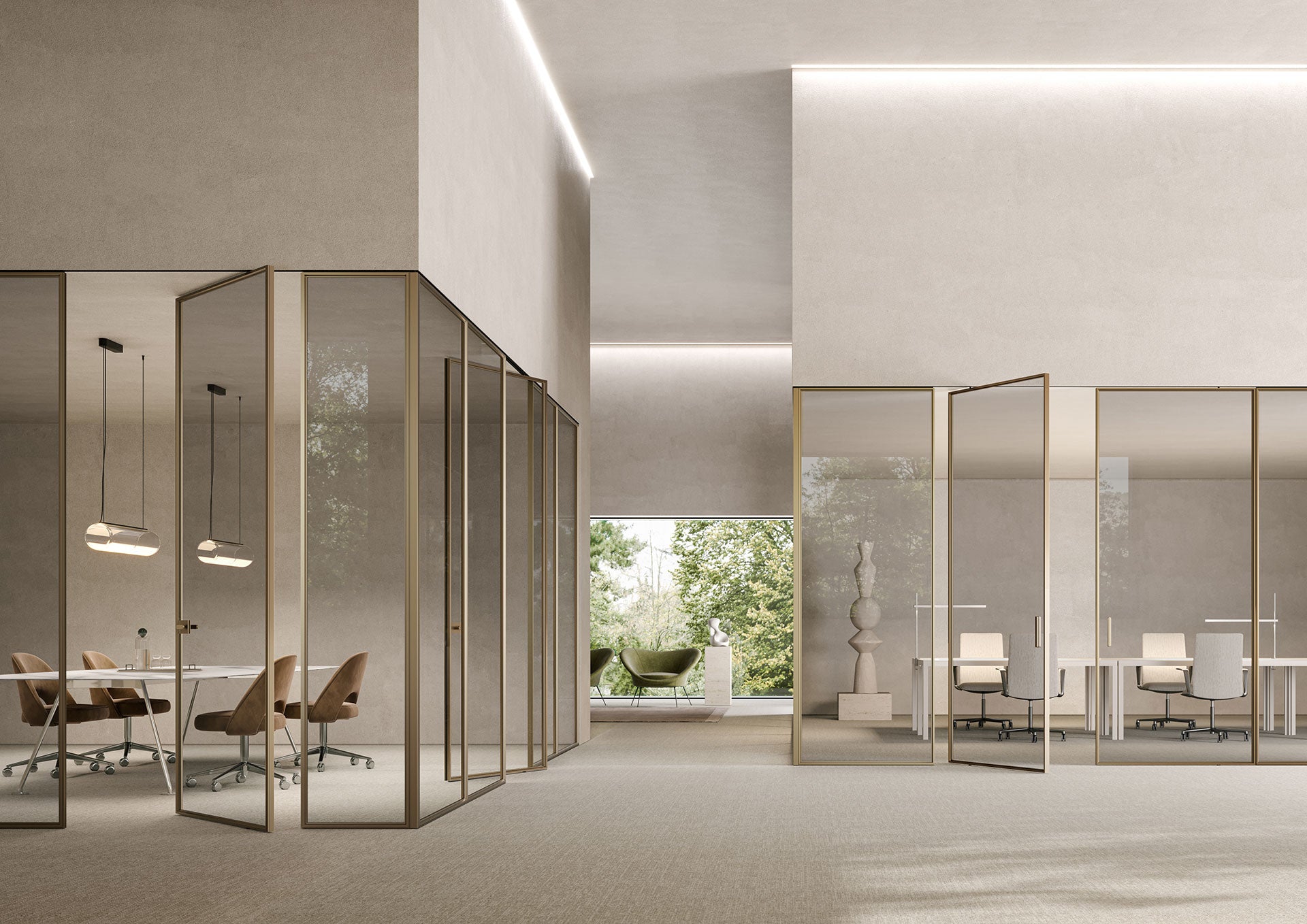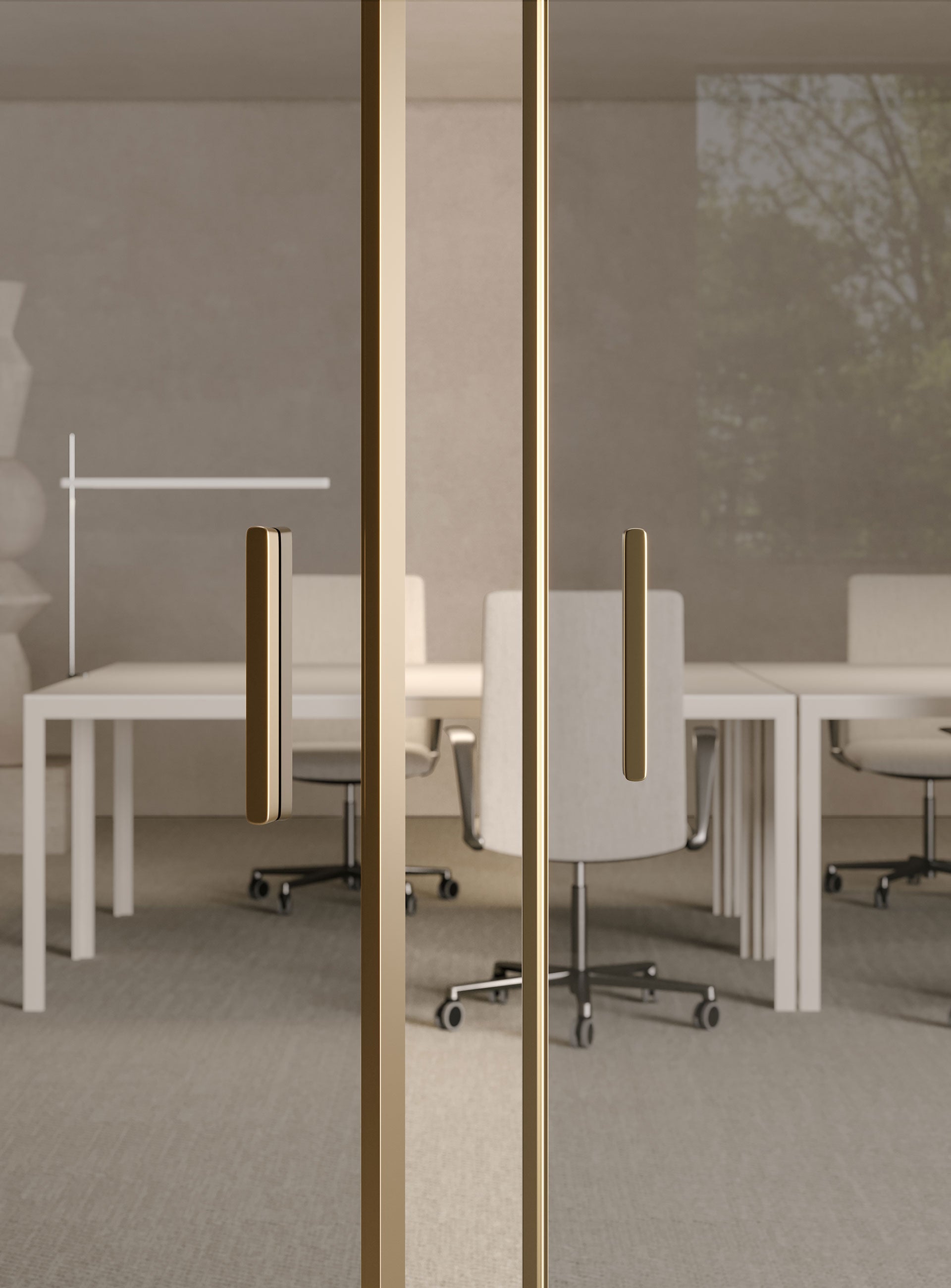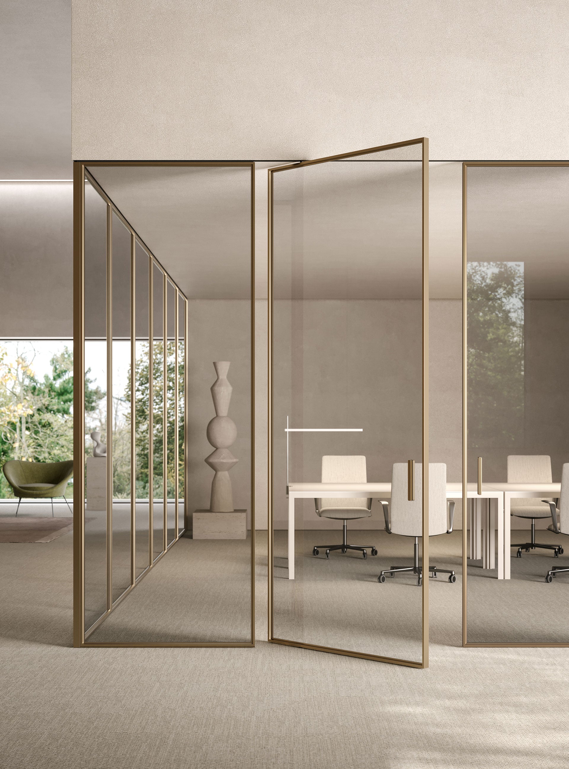 L7 Pivot joins the L7 family, designed by Piero Lissoni for Lualdi, which includes hinged doors and sliding partition systems. The pivoting version keeps the geometric purity of the parent collection, thanks to the minimal style of the aluminium frame and the glass doors, available in many finishes.