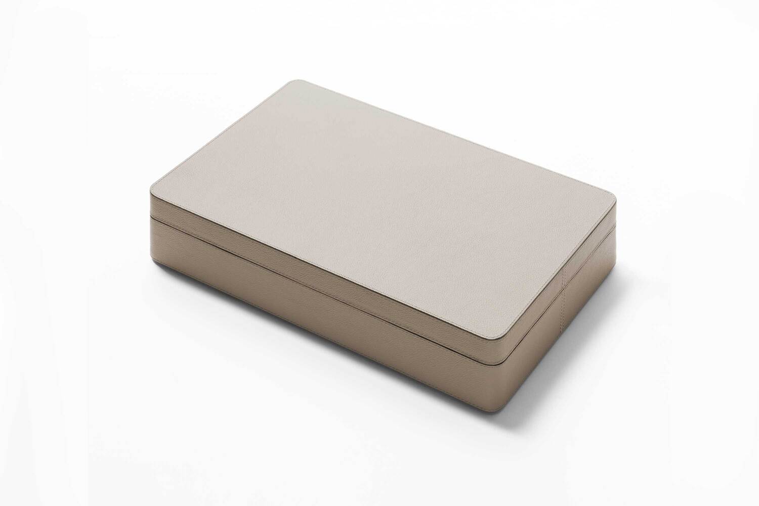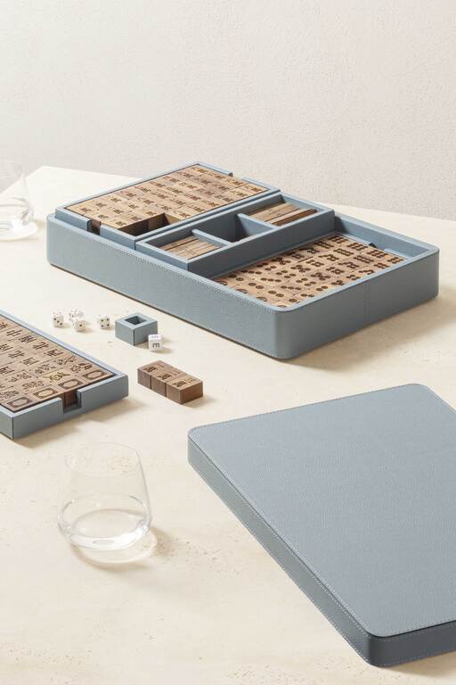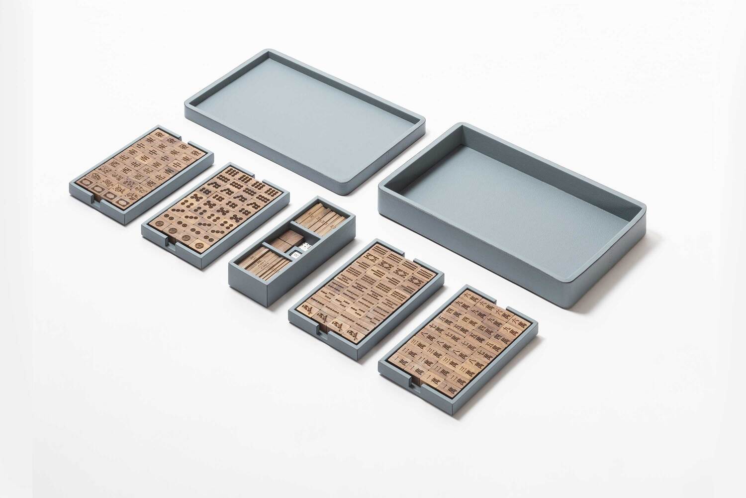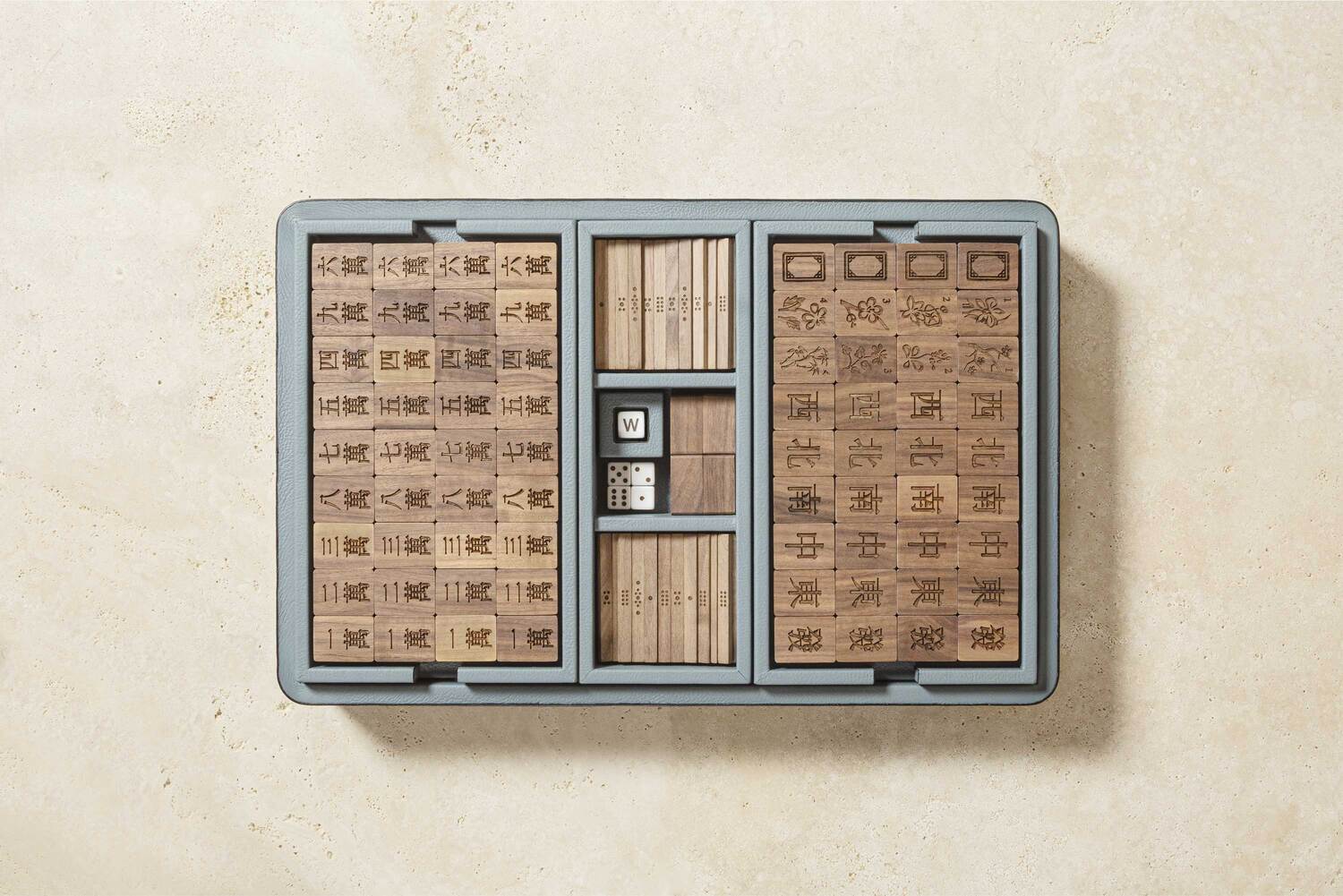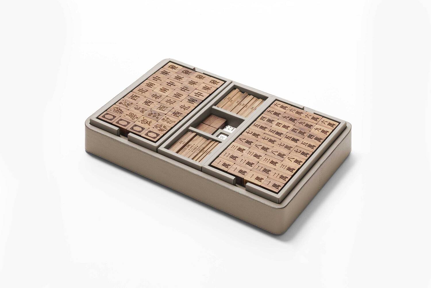 The mahjong game is housed inside a precious wooden box covered in Pelle Frau® leather, inside of which are 148 walnut wood tiles, 244 walnut wood sticks, 4 standard opaque plexiglass dice, 1 opaque plexiglass dice (with initials of the cardinal points on its faces), 4 trays to contain the tiles and 1 tray to contain the dice and sticks.