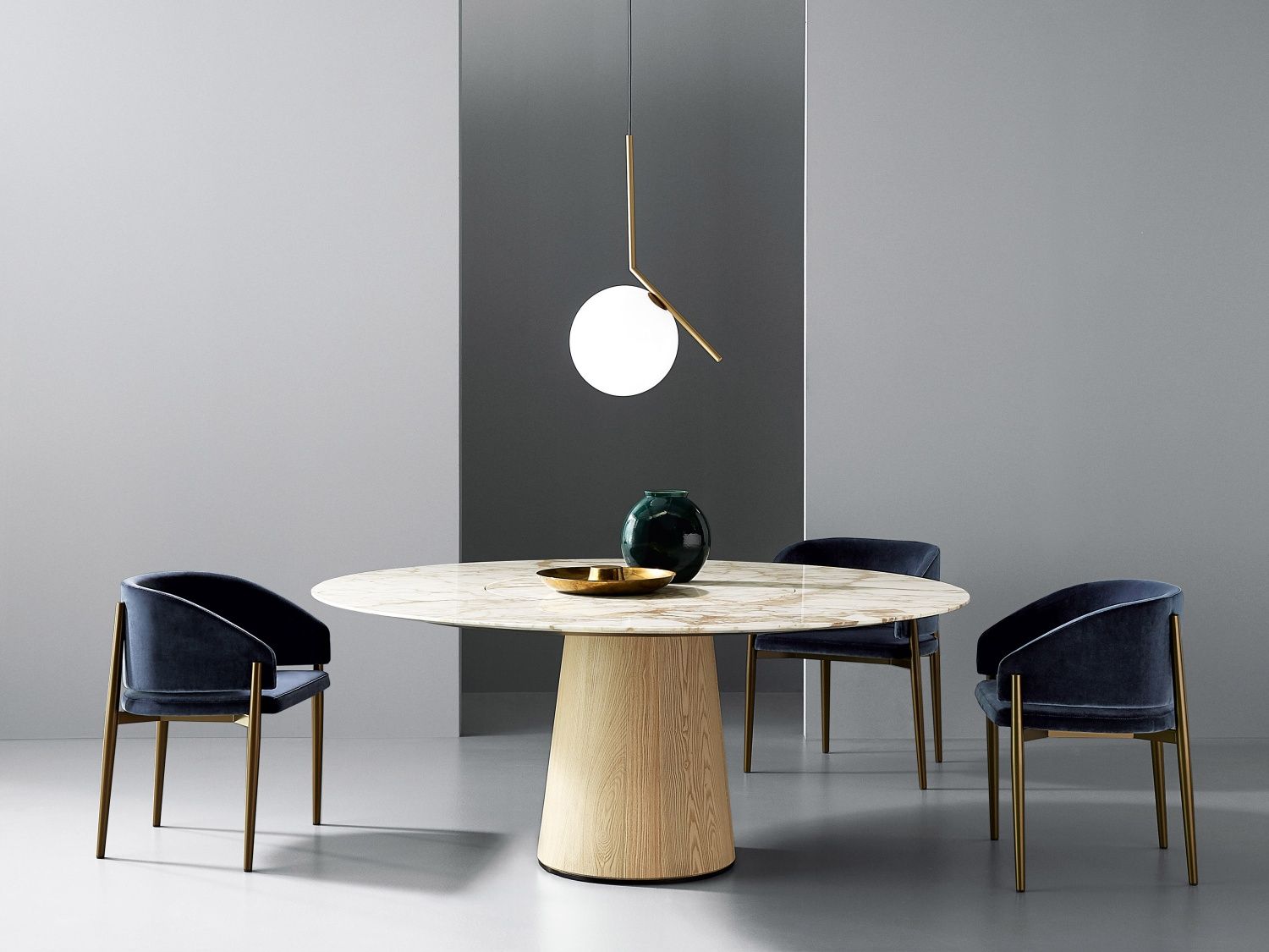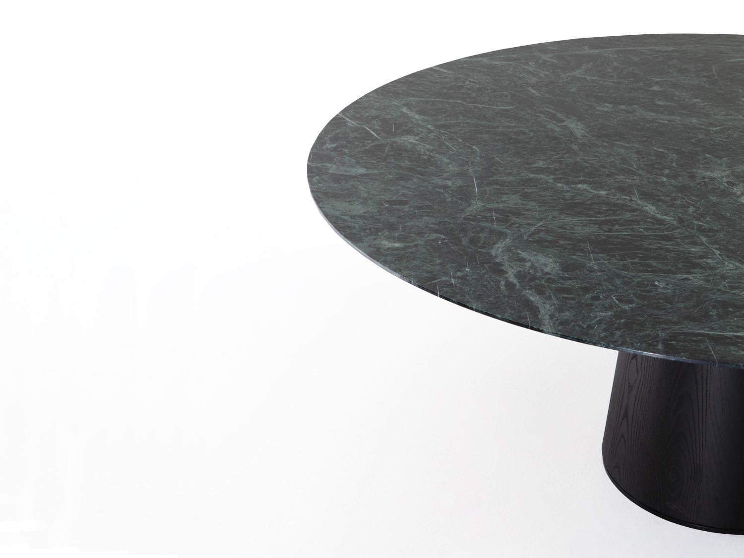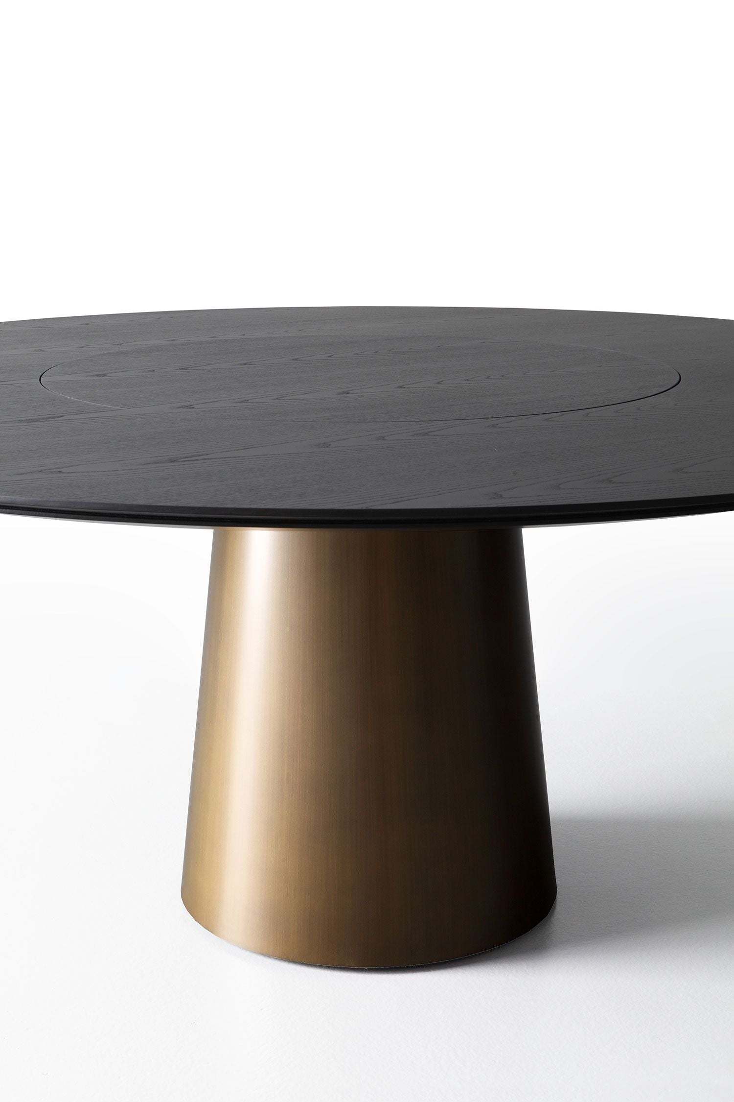 The top in marble, available in fine nuances ranging from verde rameggiato to the more traditional white Carrara marble or in all the wood essences of our collection. The table top can also feature a rotating tray in the middle. The base is made up of 12 solid ash boards that are turned and connected to one another with finger joints so as to obtain a perfect truncated cone with a distinct wood grain, available in natural, black stained, bruno stained, verde inglese stained azuki stained brushed ash.