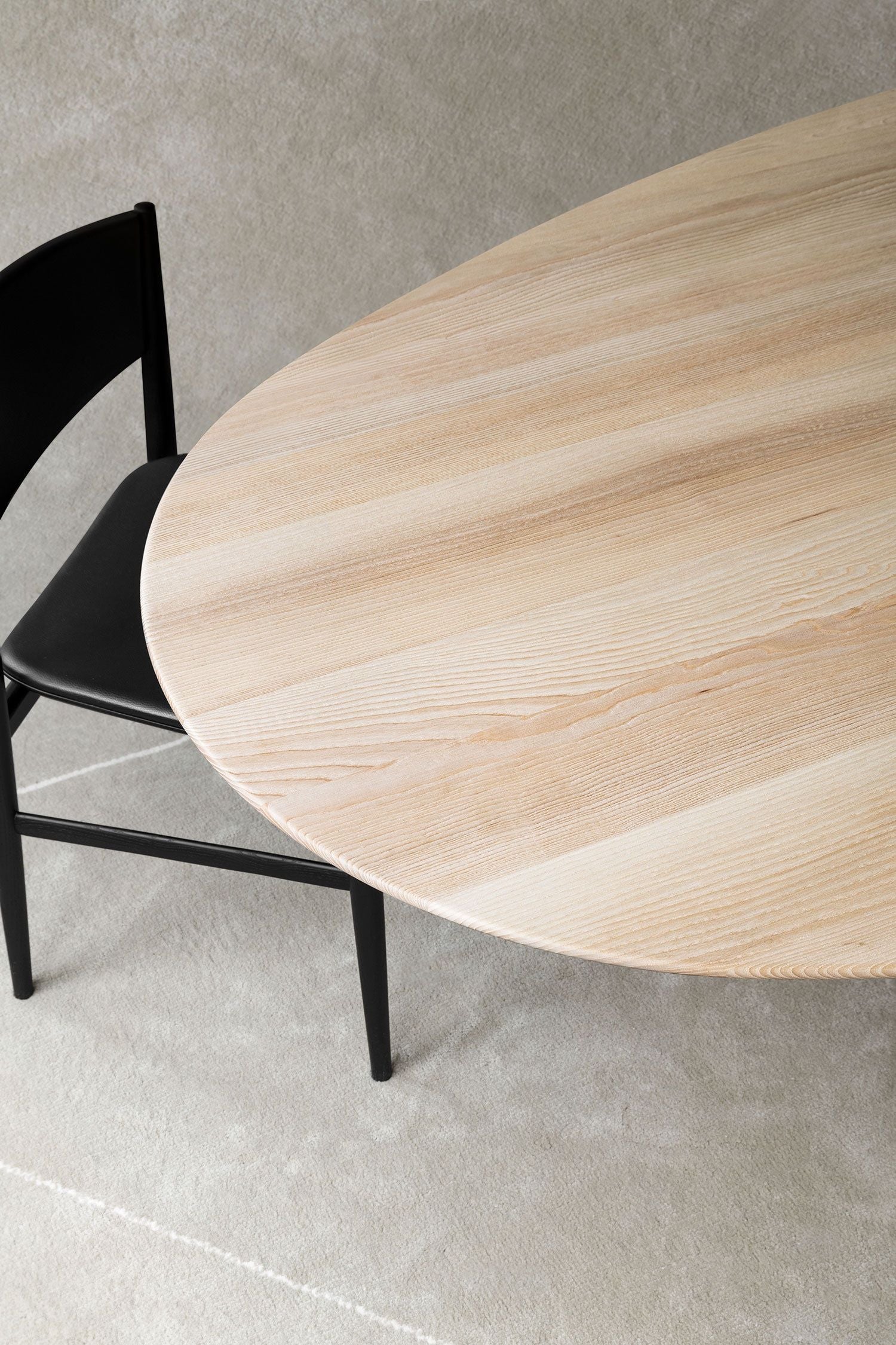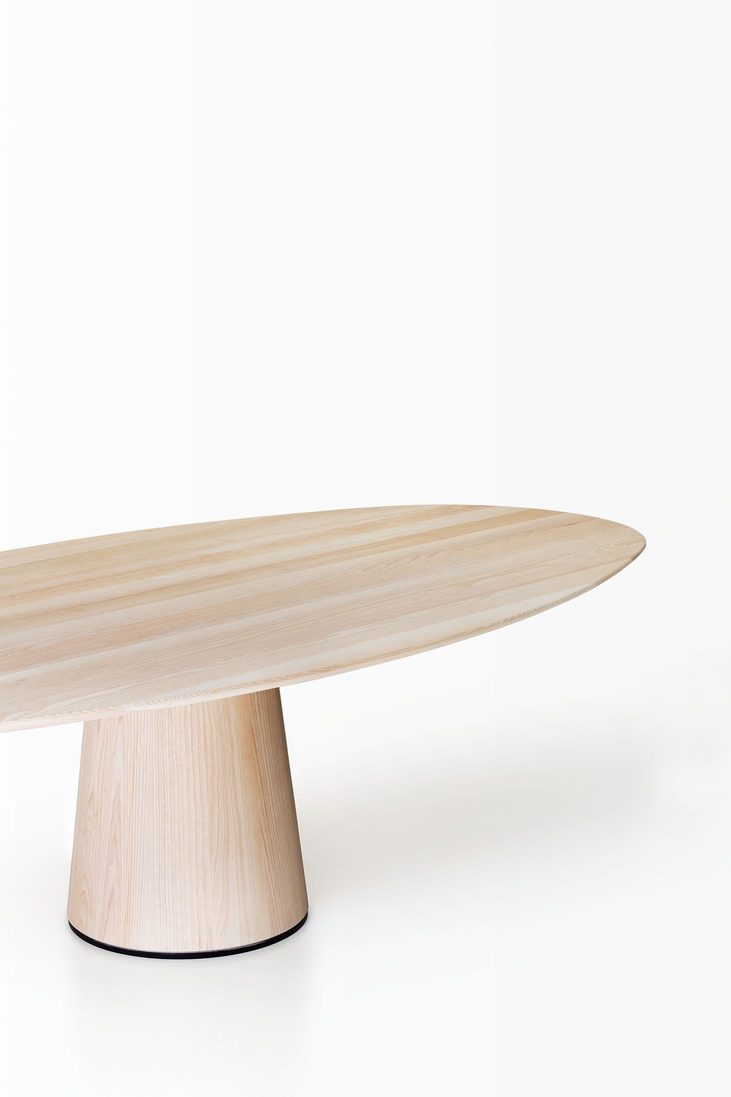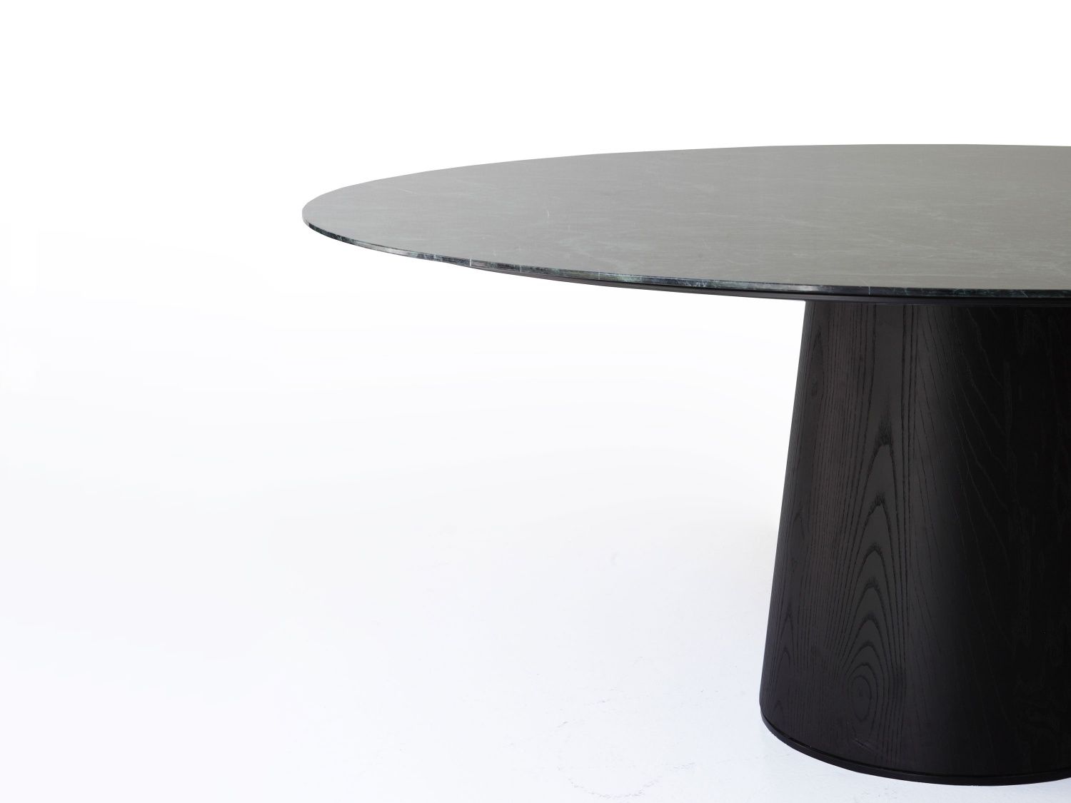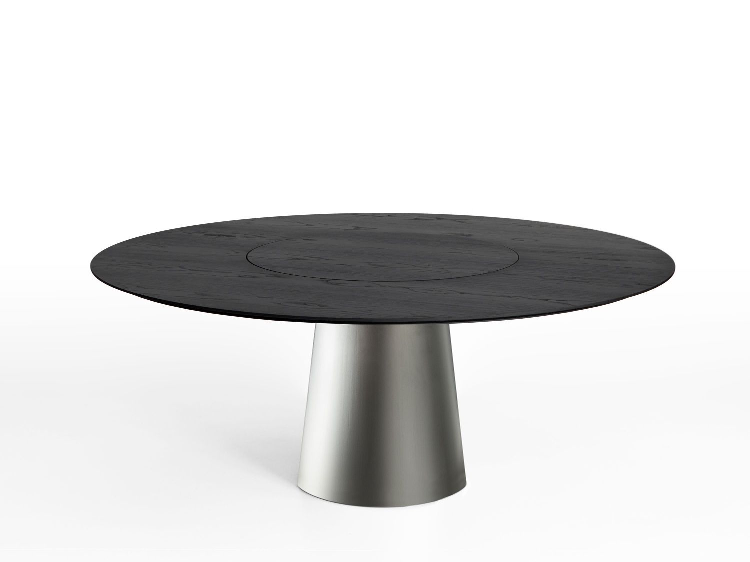The top in marble, available in fine nuances ranging from verde rameggiato to the more traditional white Carrara marble or in all the wood essences of our collection. The table top can also feature a rotating tray in the middle. The base is made up of 12 solid ash boards that are turned and connected to one another with finger joints so as to obtain a perfect truncated cone with a distinct wood grain, available in natural, black stained, bruno stained, verde inglese stained azuki stained brushed ash.