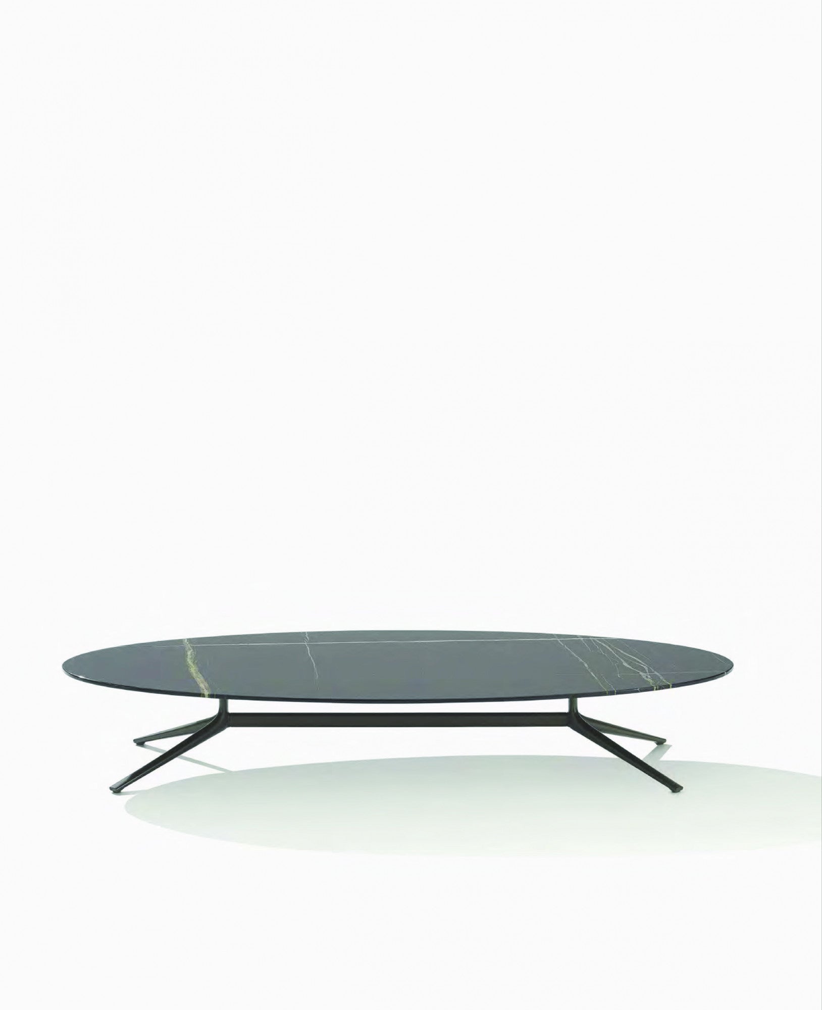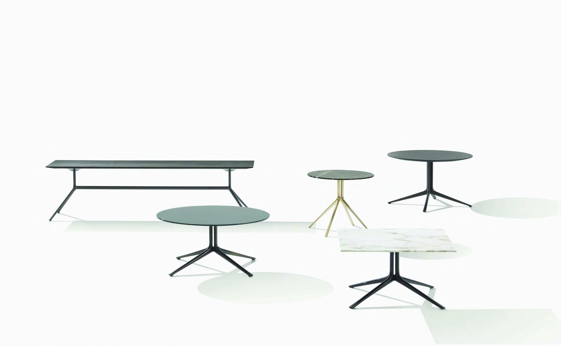 A collection with an elegant and light image, with thin tops made of wood, marble, or glossy and mat lacquered finishes. Available in two heights and different shapes to facilitate the combination of several elements, these tables are easy to include in the living area and perfect in combination with the sofa system of the same name.