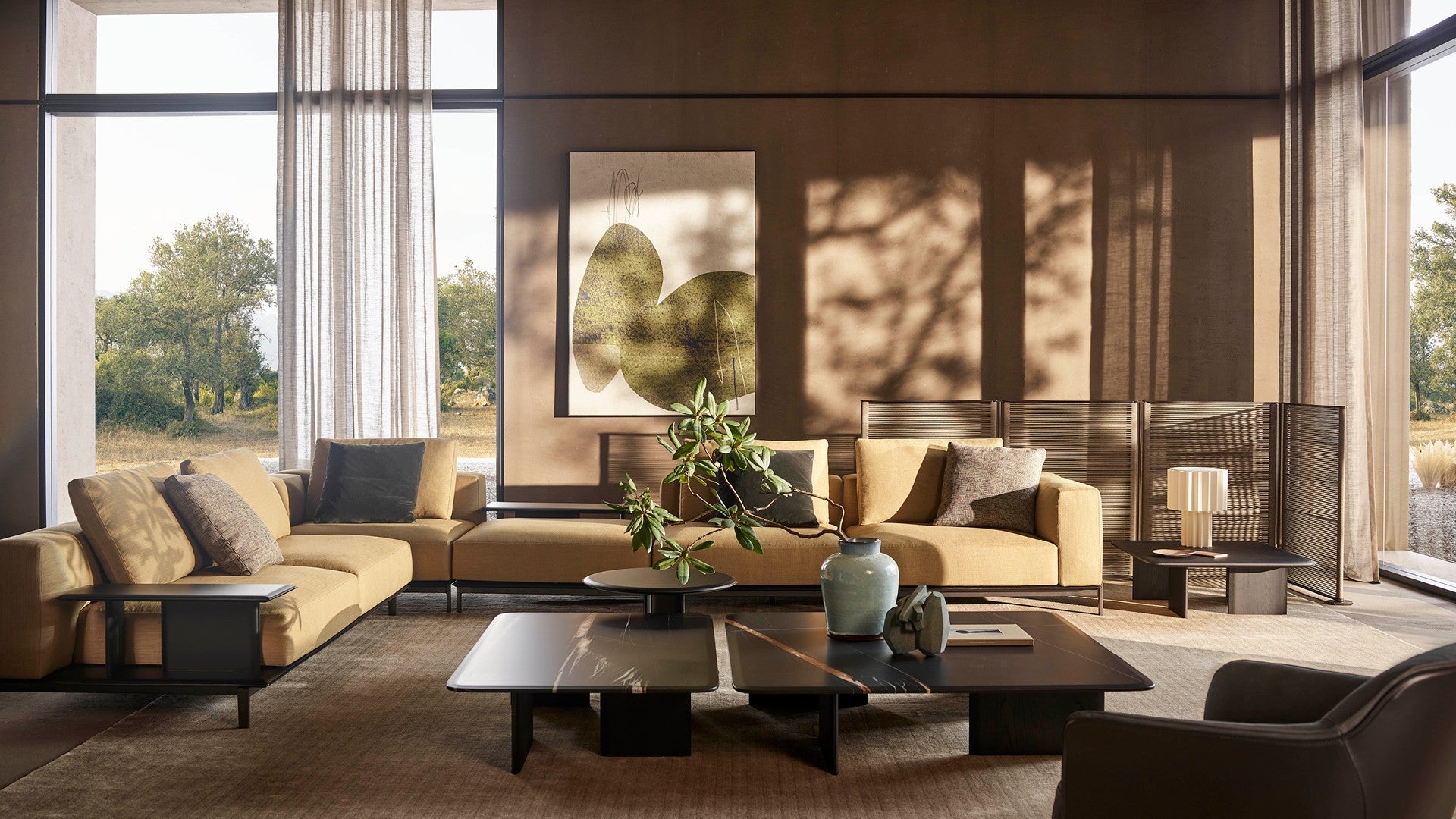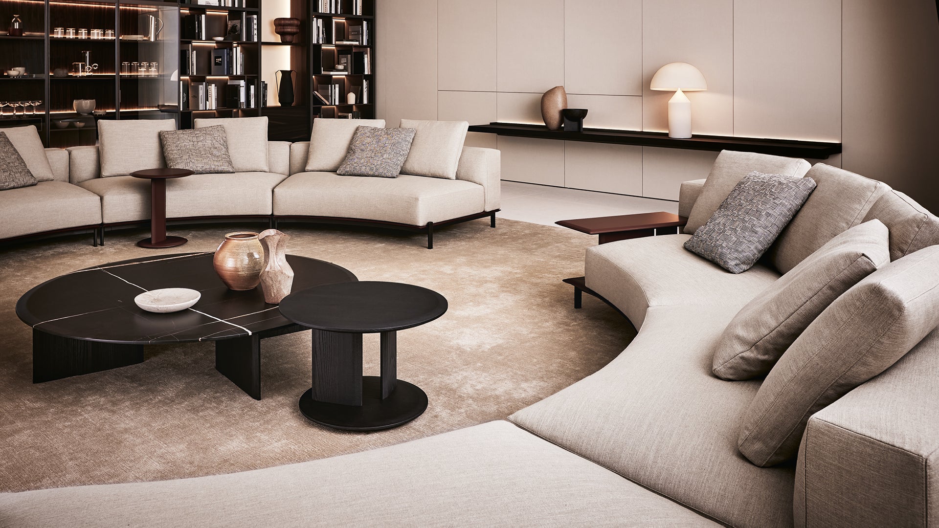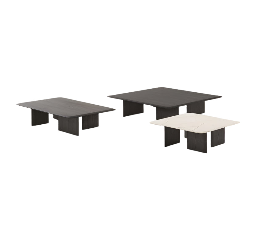With a choice of a square or rectangular top with rounded corners or a round top, it comes in different heights and sizes. In the olmo nero version, the thickness of the tabletop is the result of hand crafting. The round and tall version of the coffee table, which is ideal for placing next to the Brera sofa, is also available completely covered in leather.