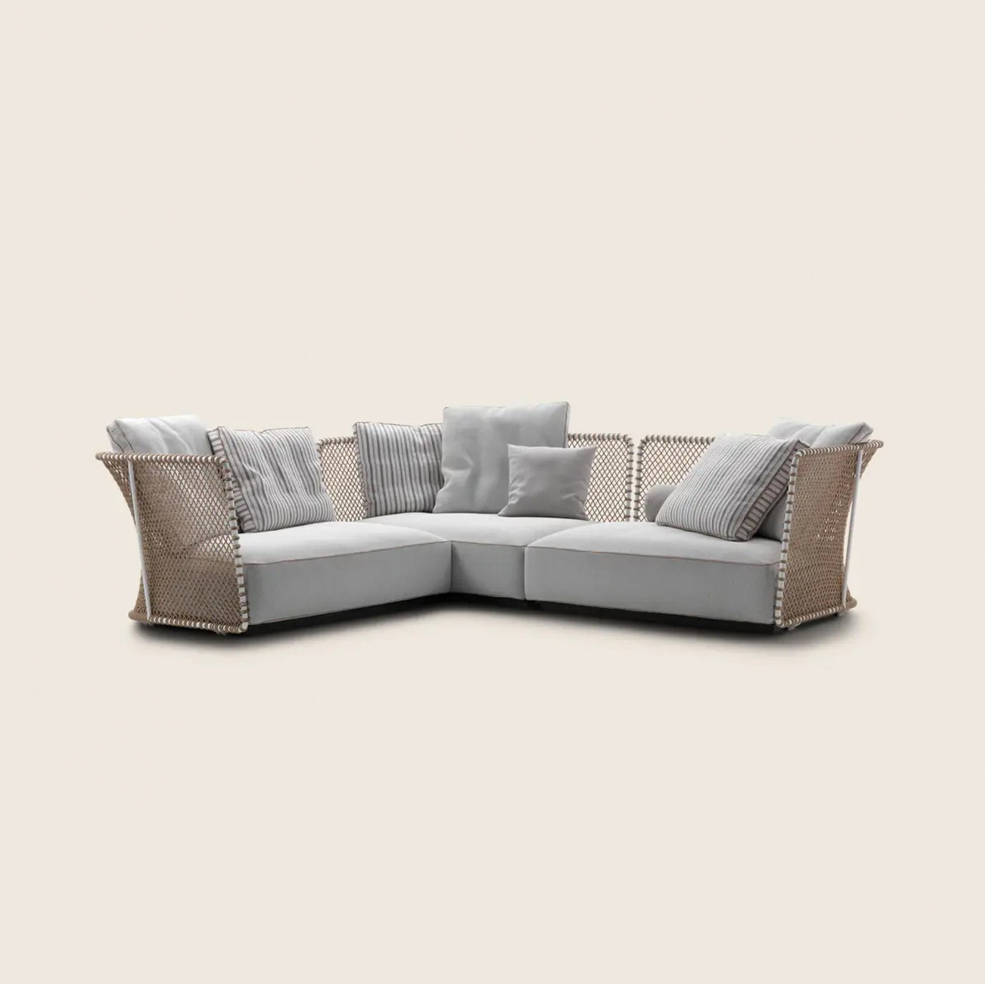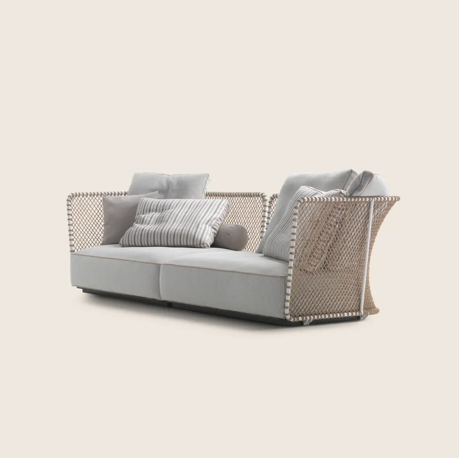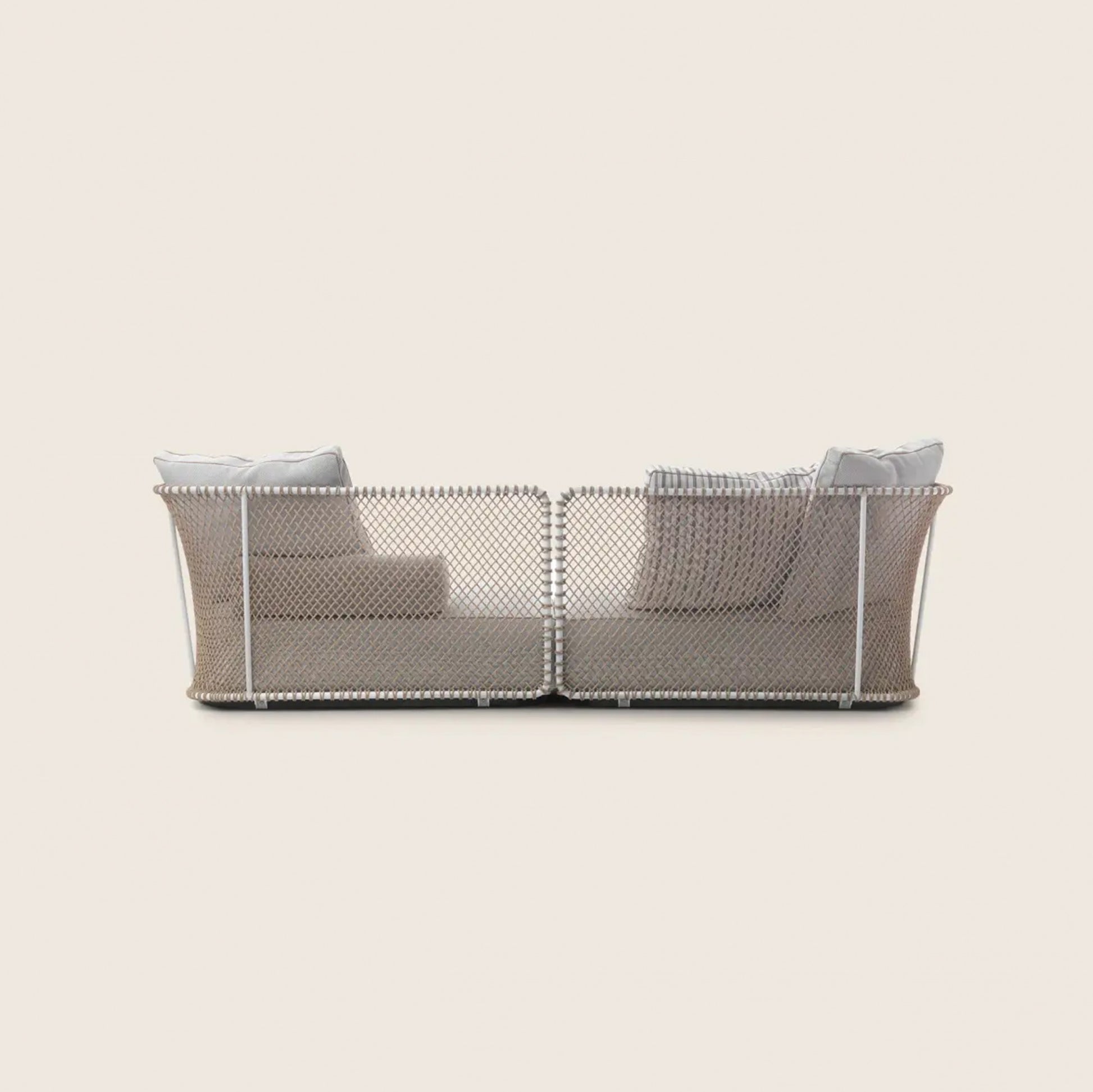 The structure is in epoxy powder-coated tubular metal accompanied by entirely hand-woven polypropylene or rubber cord. Visually, the effect is that of a spacious basket that welcomes soft seat and backrest cushions – an invitation to abandon oneself to relaxation.