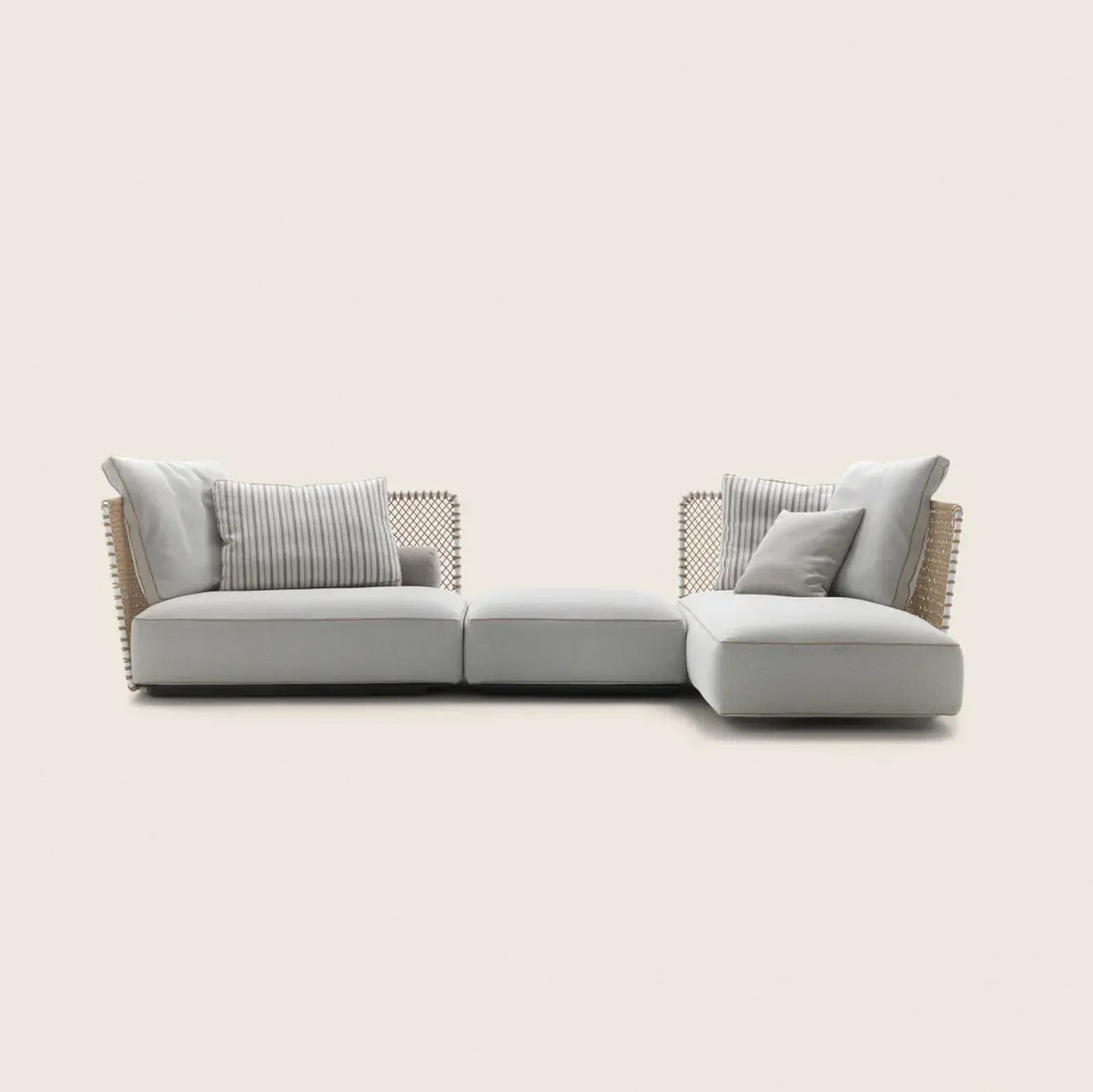 Its generous woven cord-and-metal backrest with a mesh-like pattern forms the aesthetic motif that lends bold personality to the Oasis sofa.