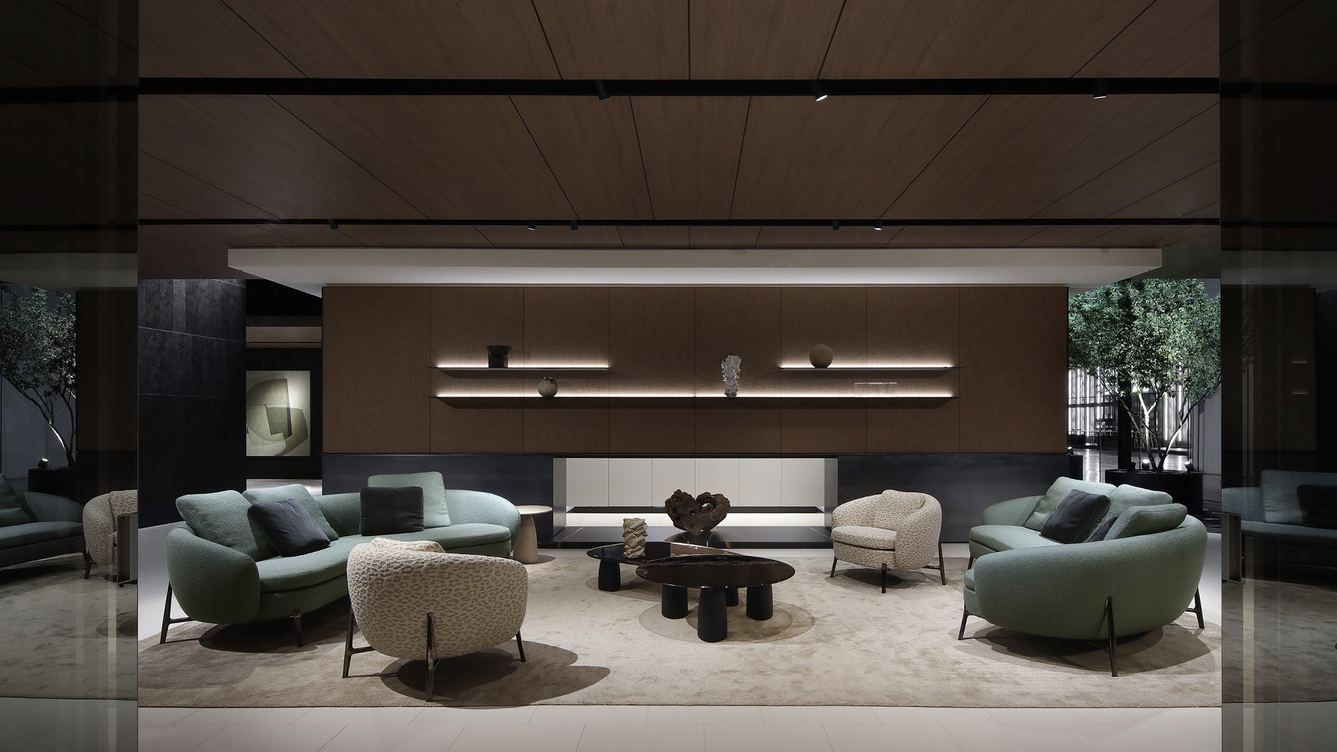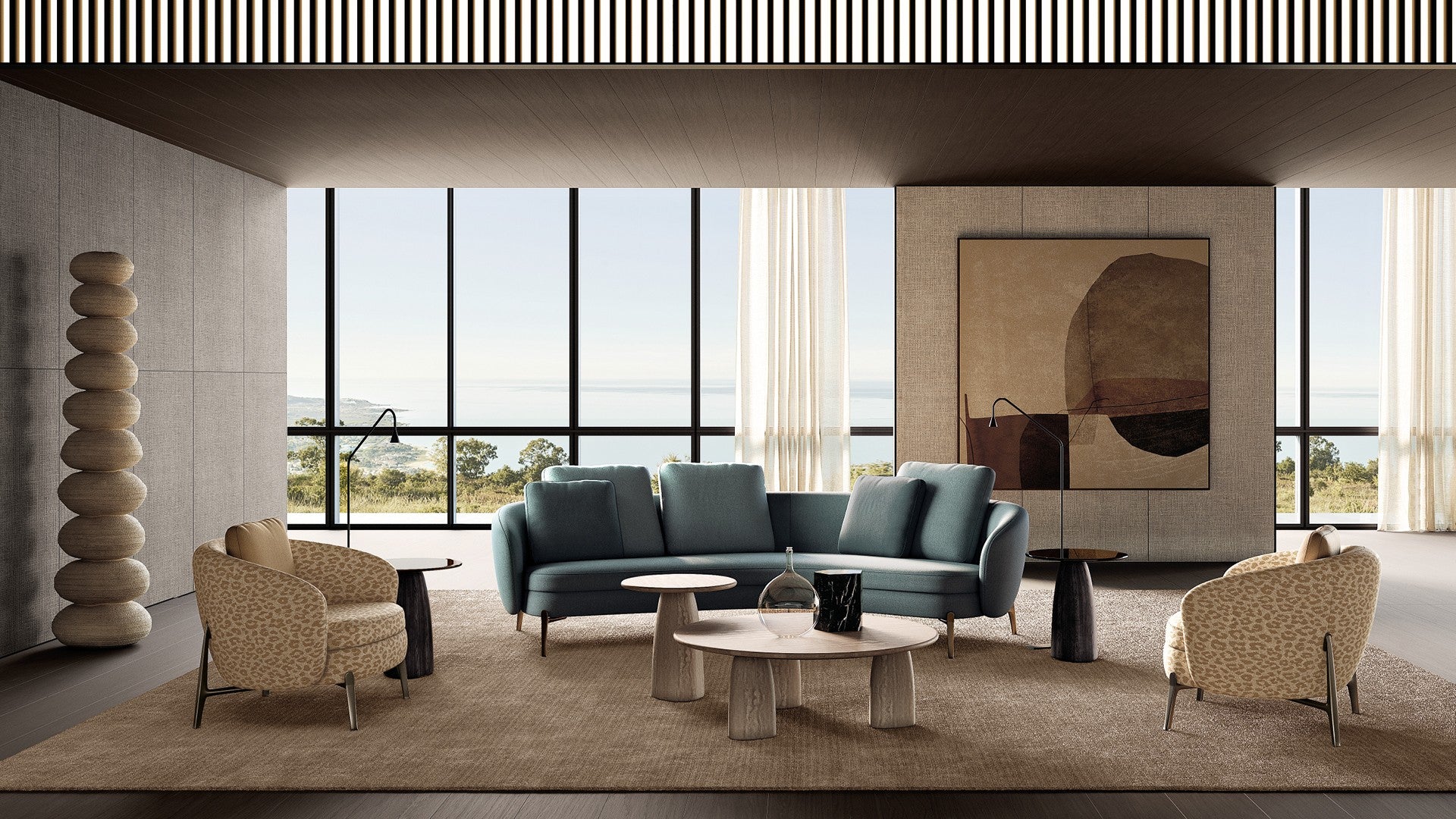 a perfect synthesis of modern design and contemporary technology. In both the sofas and the armchair, the seat, raised off the ground by a thin leg inspired by jewelry workmanship,