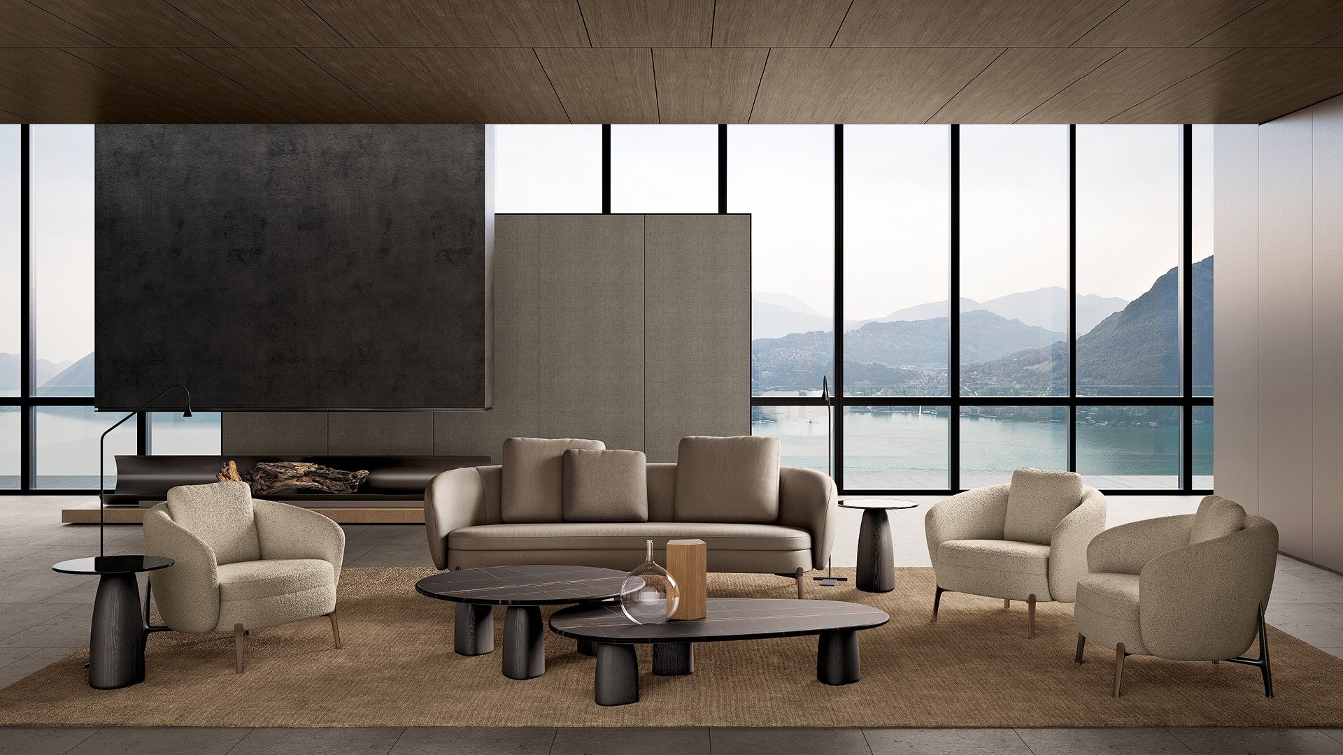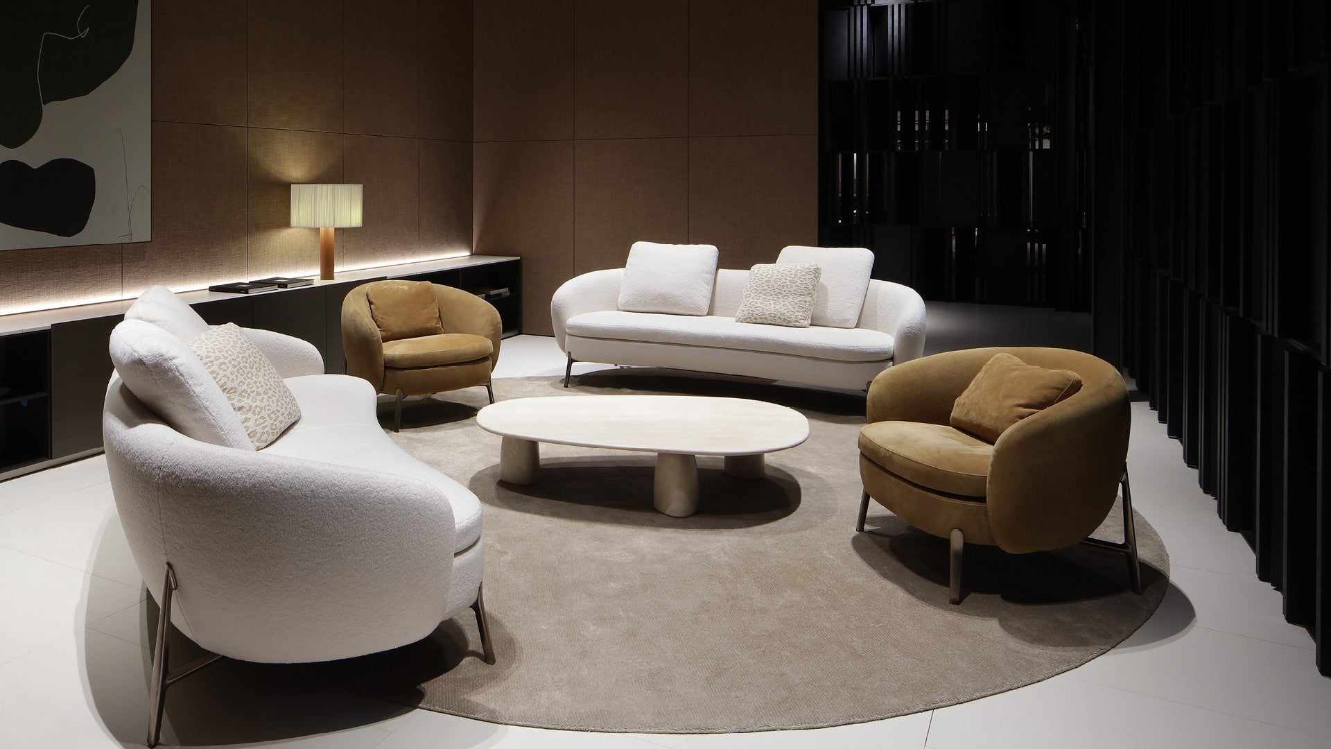 With its curved lines and soft forms, Orbis designs an intimate and cosy space within the living room. The collection consists of two sofas and an armchair with an enveloping backrest,
