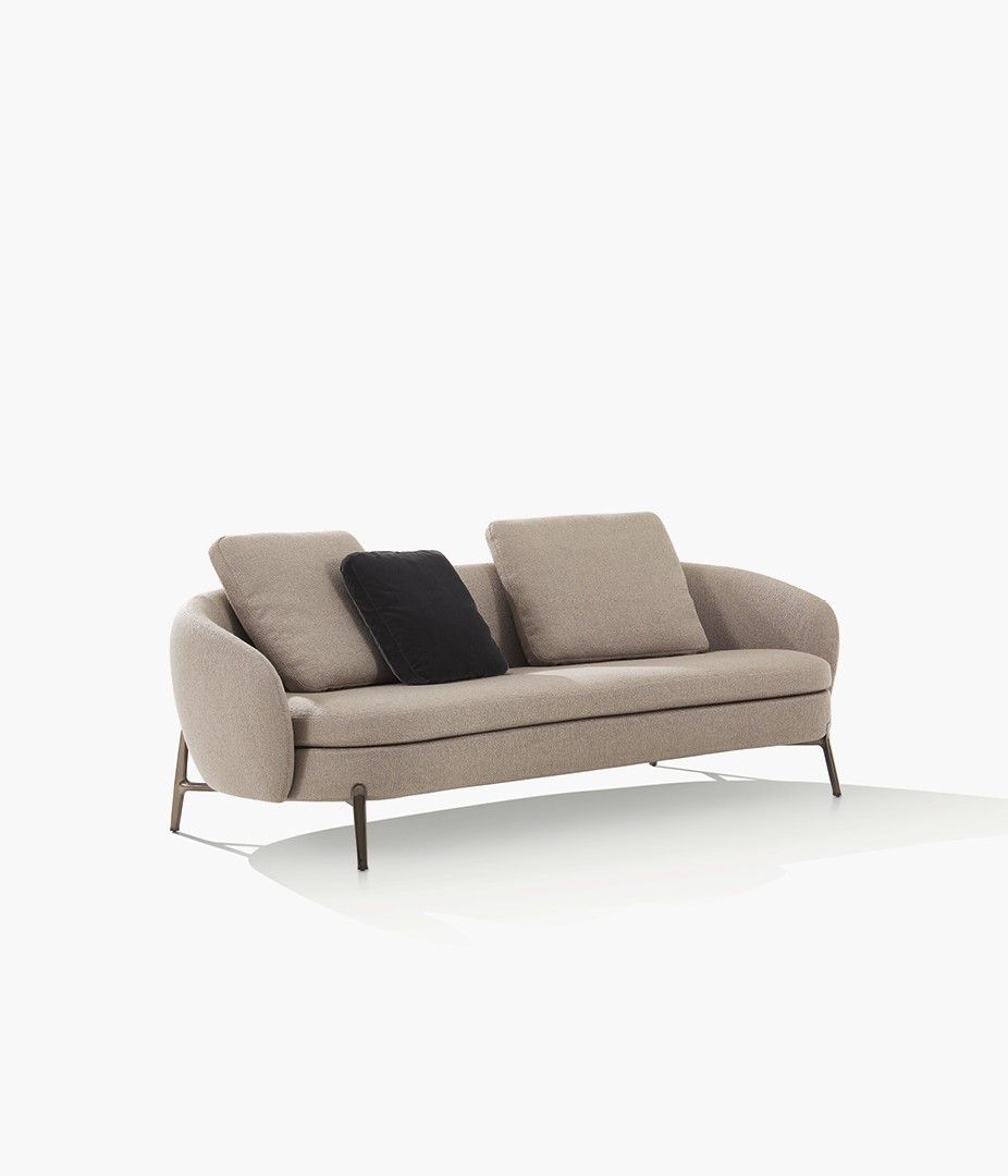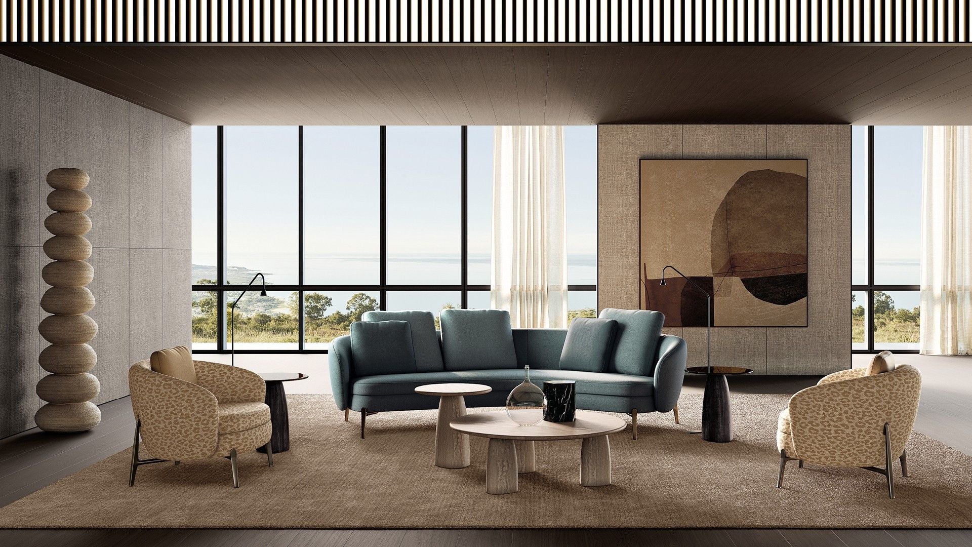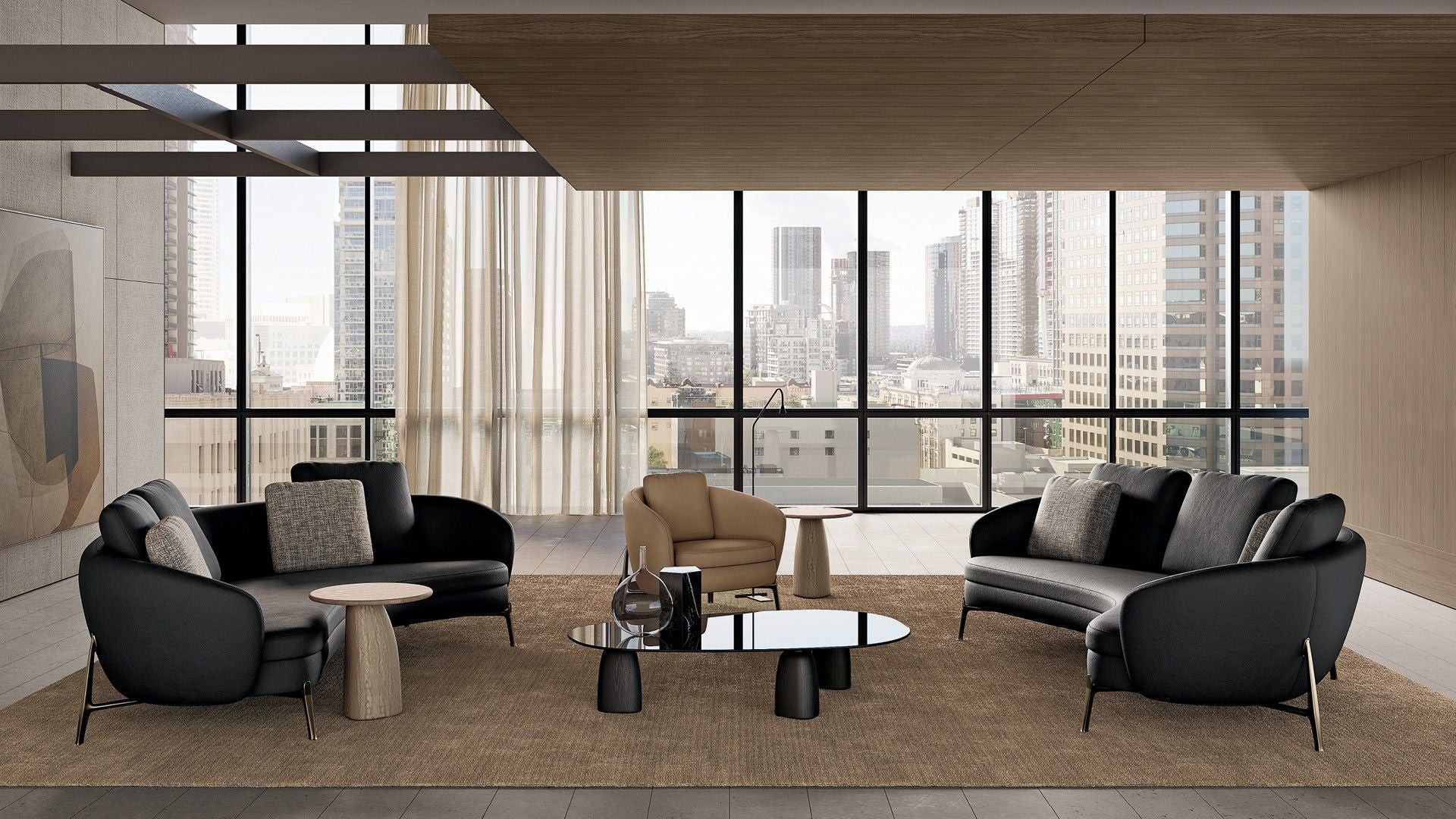 With its curved lines and soft forms, Orbis designs an intimate and cosy space within the living room. The collection consists of two sofas and an armchair with an enveloping backrest,