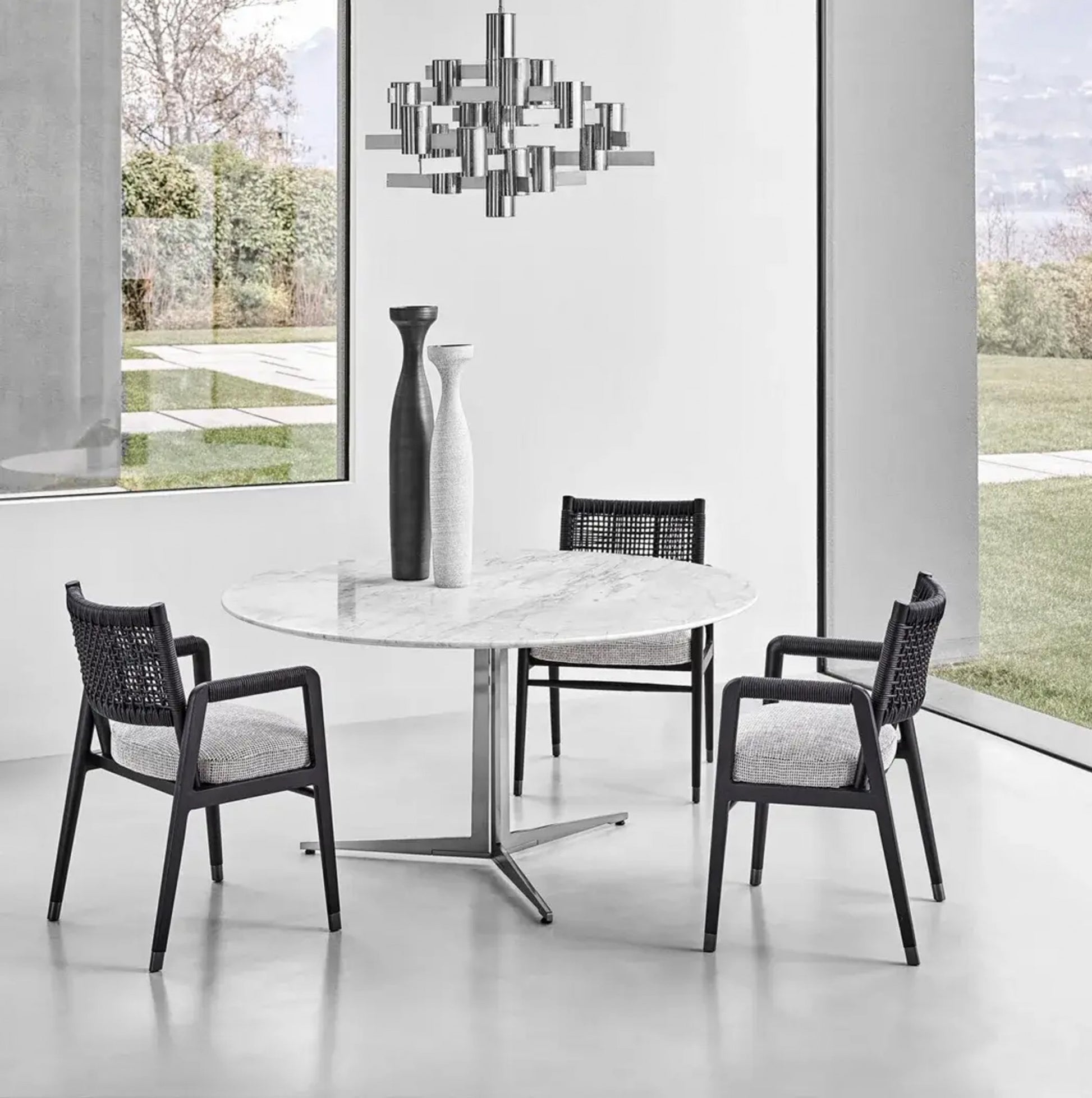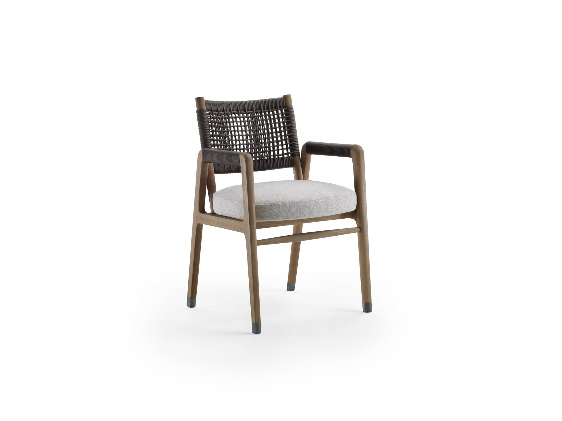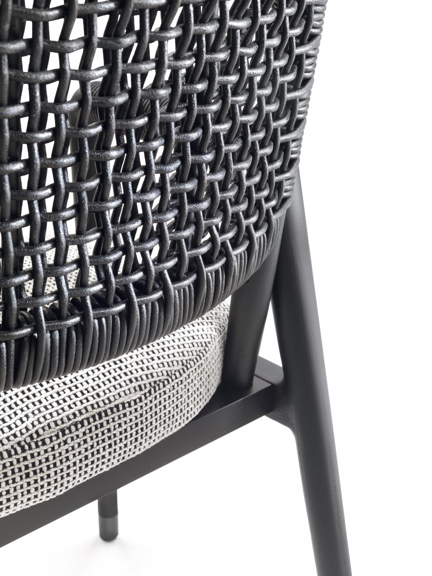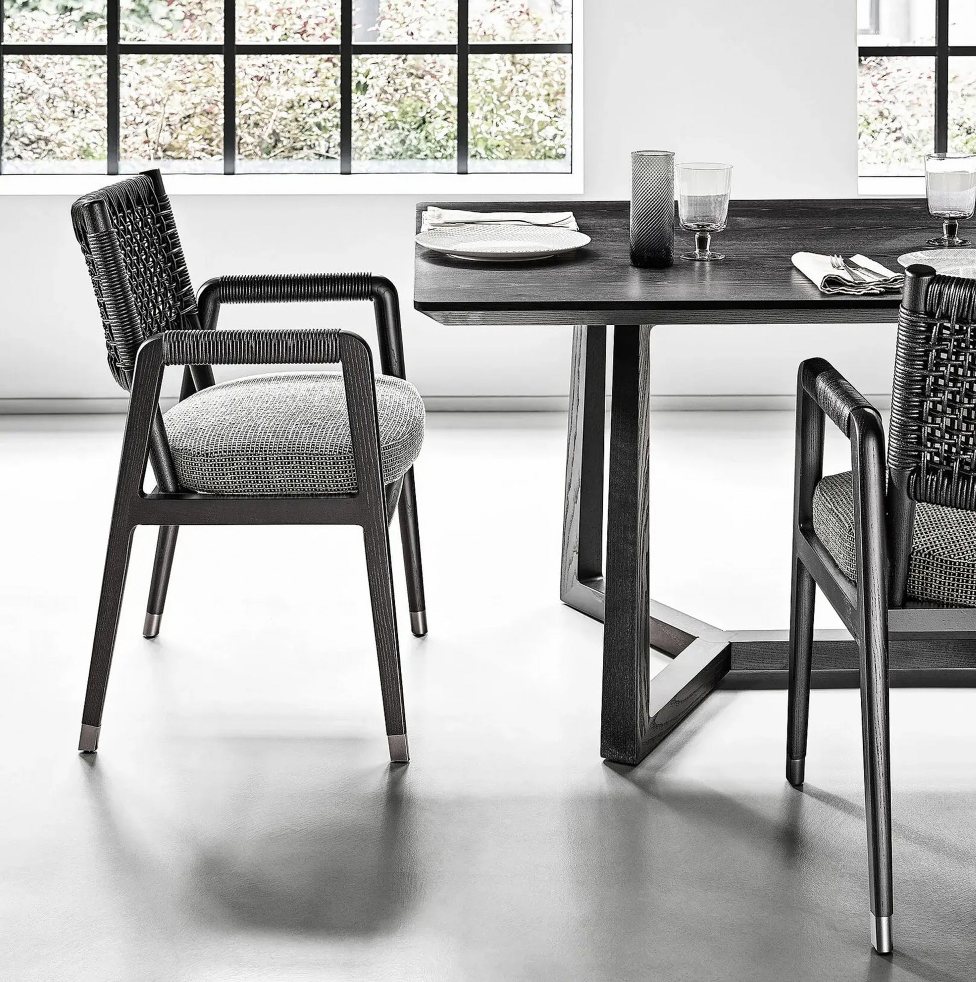 The Ortigia family of seating elements also includes elegant chairs and dining chairs. The structure is made entirely of solid Canaletto walnut or ash, artisan-crafted with techniques that call to mind the fine cabinetmaking tradition, while the sophisticated backrest is made of hand-woven cowhide cord. The padded seat cushion can be upholstered in any of the fabrics or leathers from the exclusive Flexform collection.