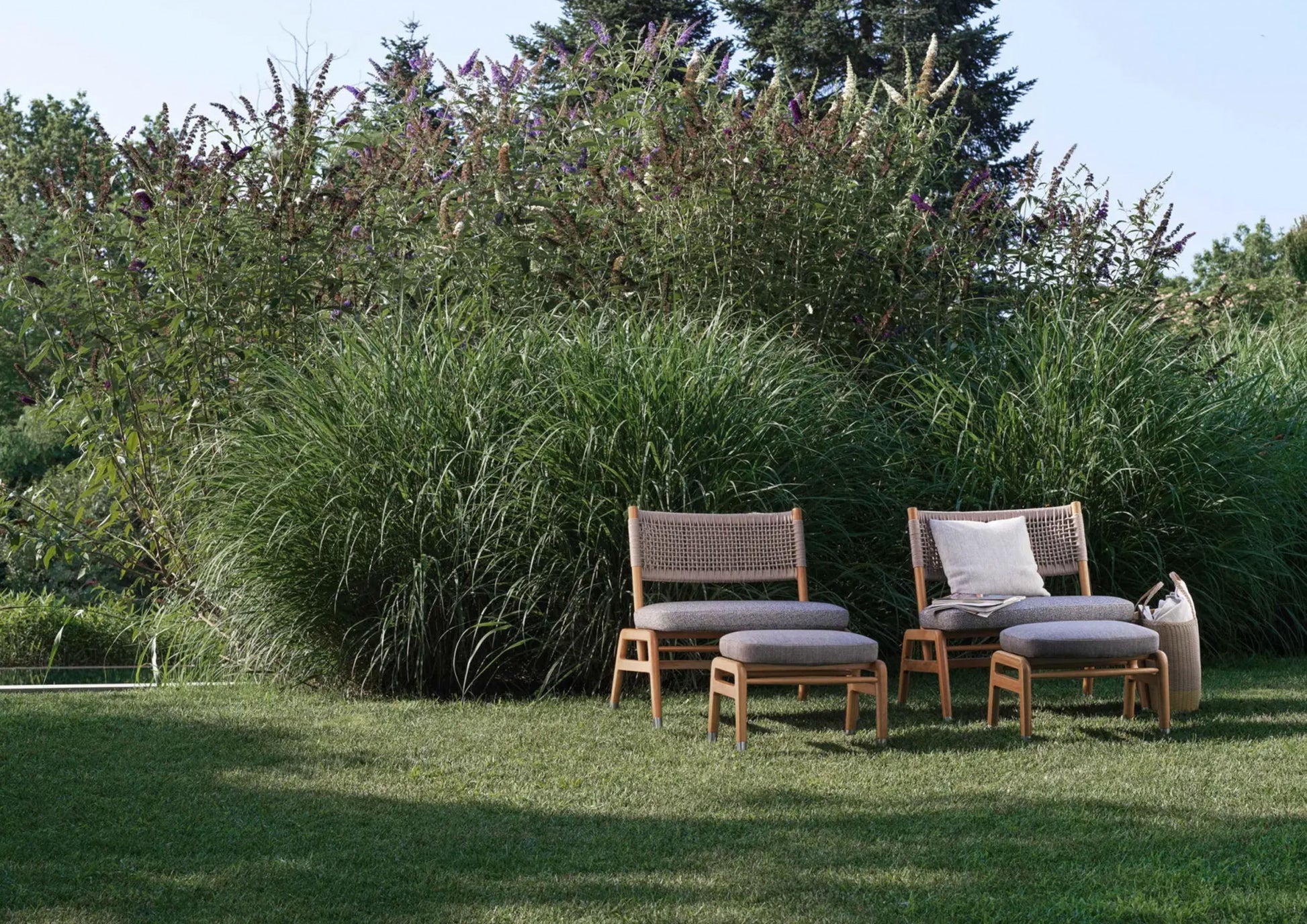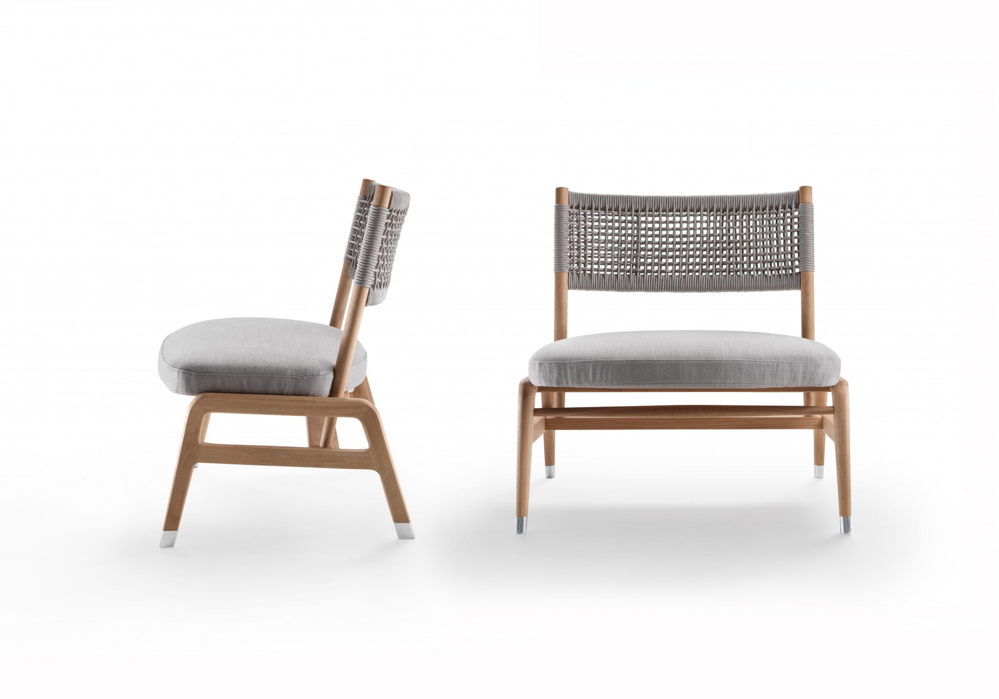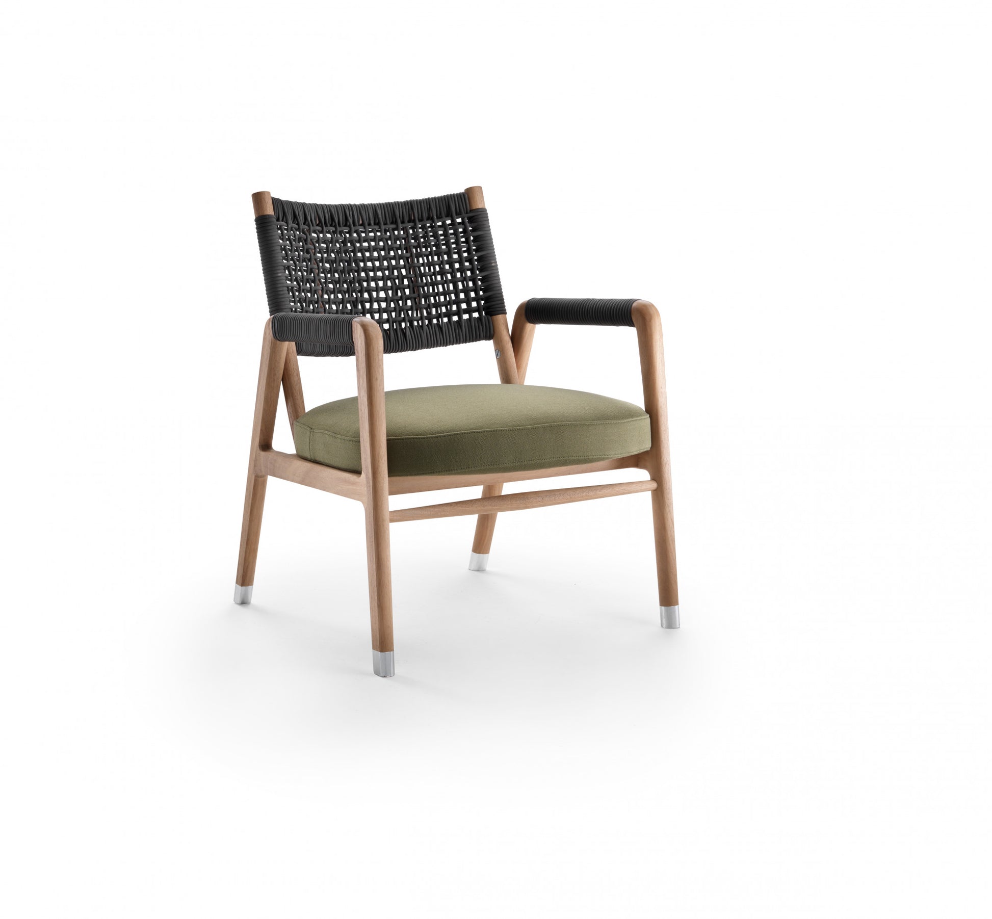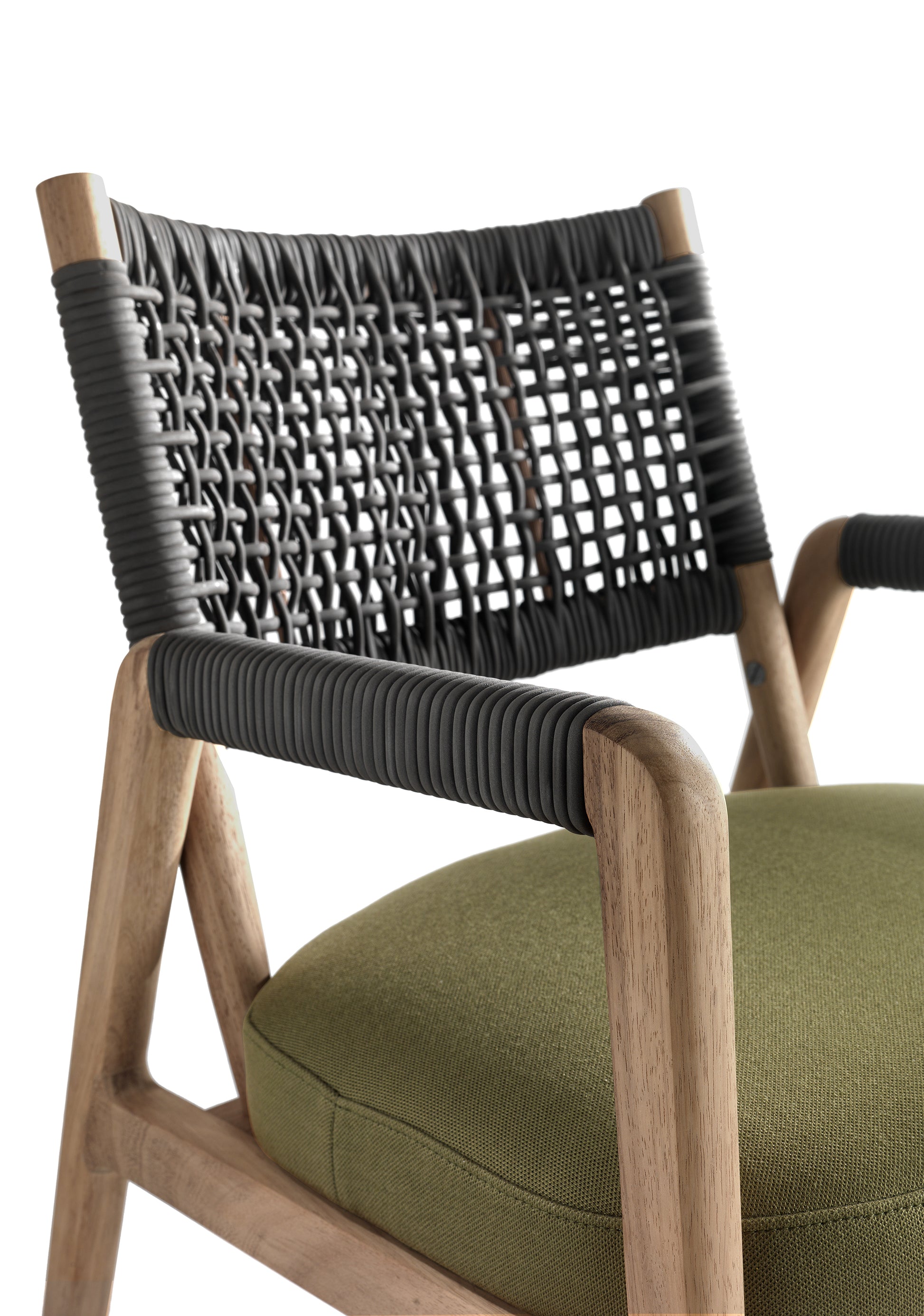 Ortigia Outdoor is the alfresco version of the eponymous family of seating elements featuring classic-traditional charm reinterpreted with a contemporary vibe. The structure of the Ortigia armchairs is made entirely of solid iroko, artisan-crafted with techniques that call to mind the tradition of fine cabinetmaking, and available in natural finish or lacquered white or stained grey. It rests on die-cast milled metal alloy tips and nylon pads. The seat is upholstered while the backrest is covered in refined, entirely hand-woven upholstery available in polypropylene cord or polyurethane rubber, both in an elegant palette of colors. The Ortigia family includes an armchair with armrests, an armchair without armrests that can be paired with a footstool and with a dining chair.