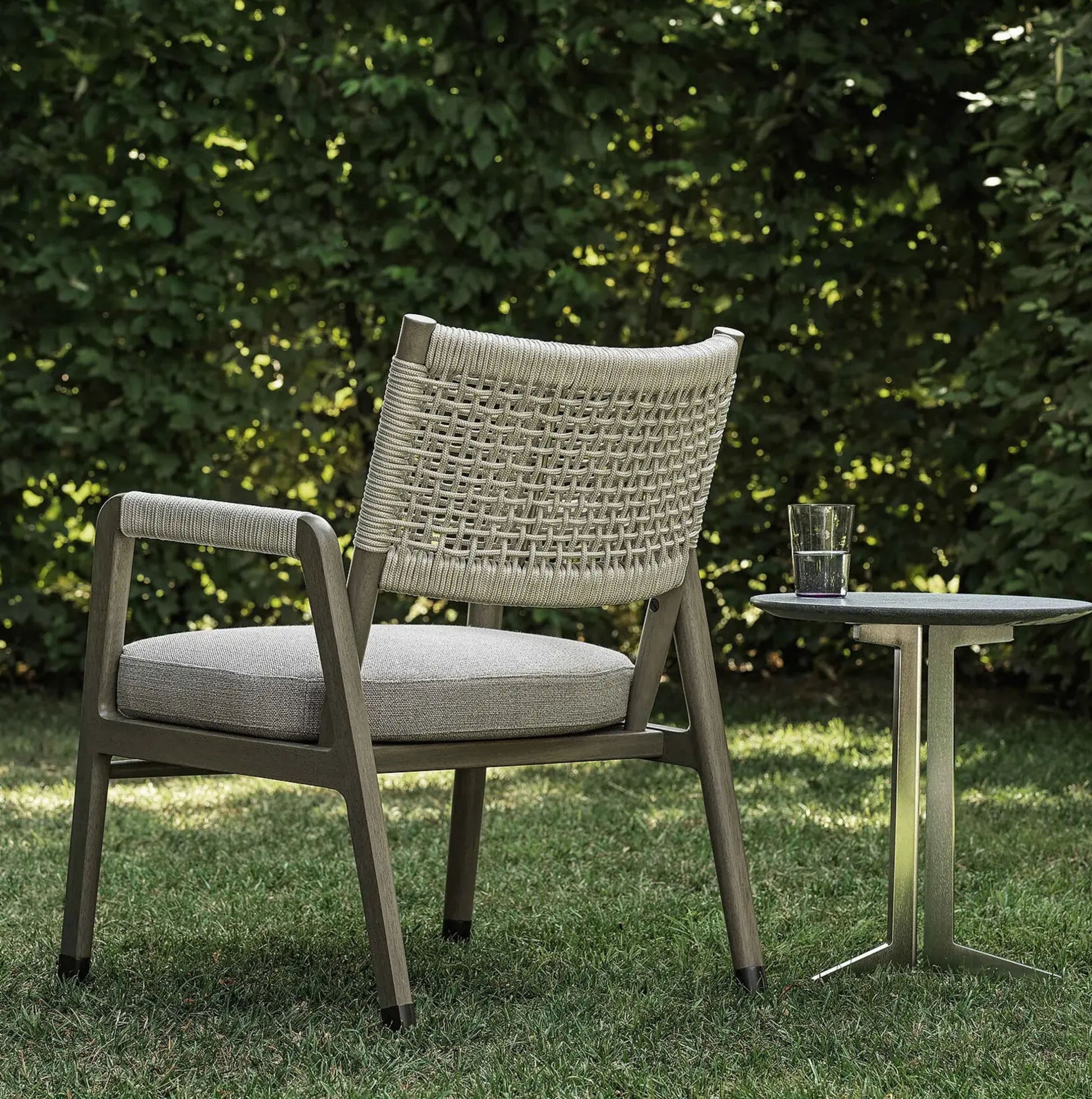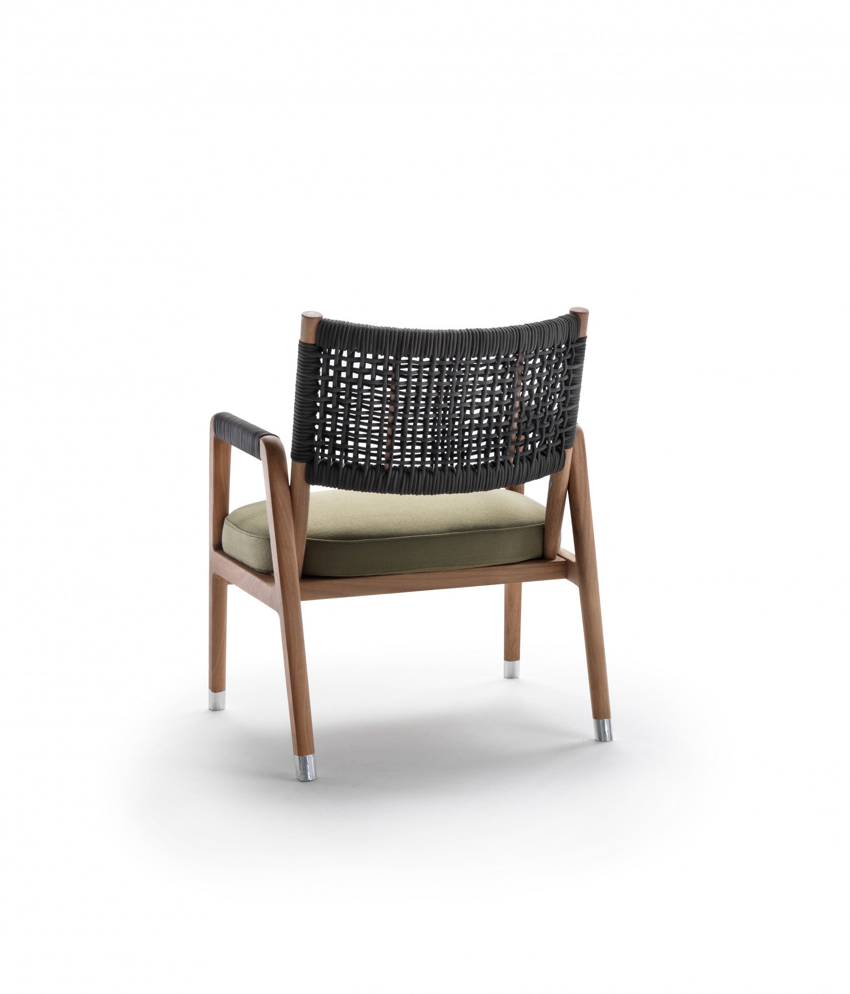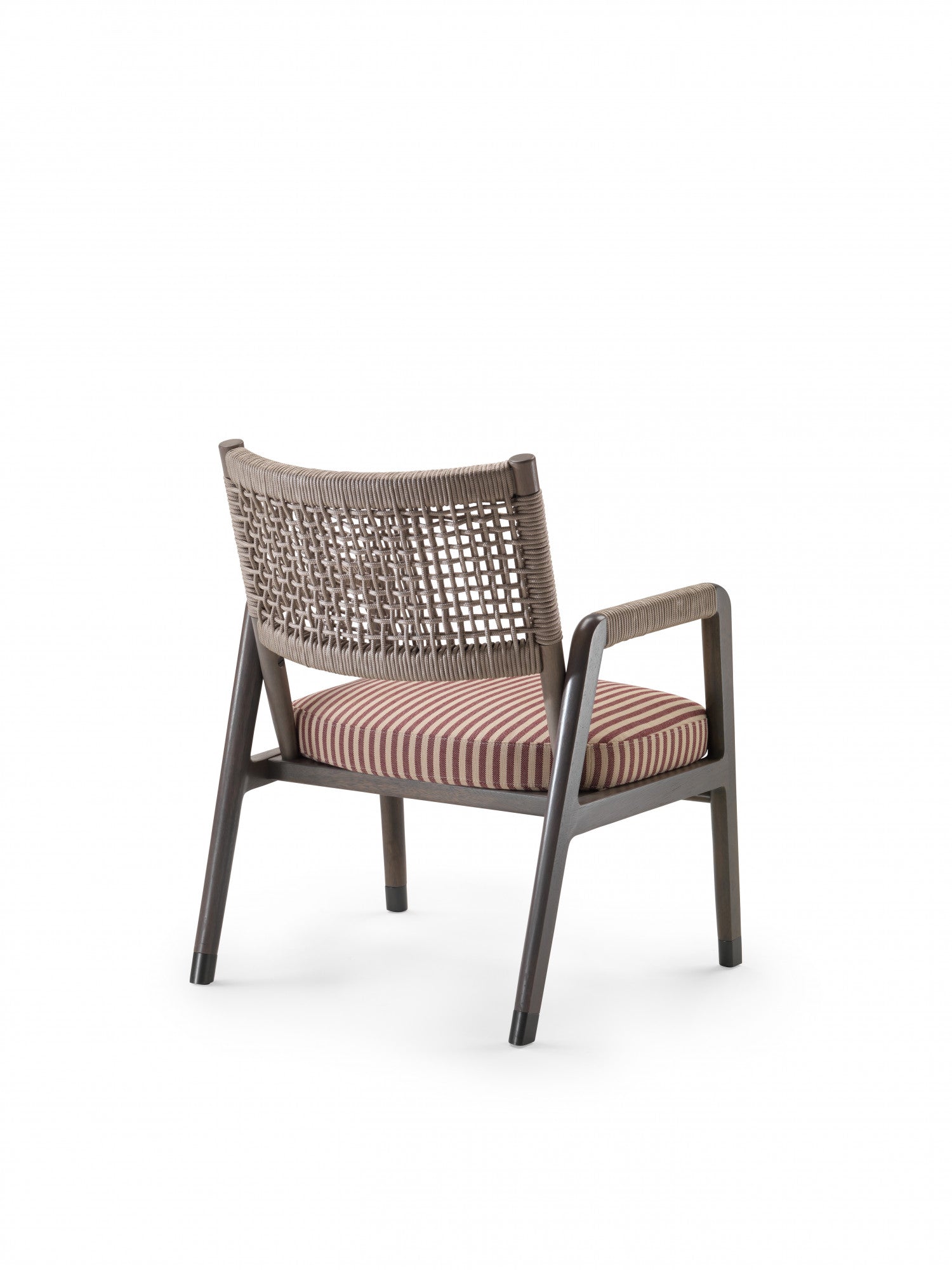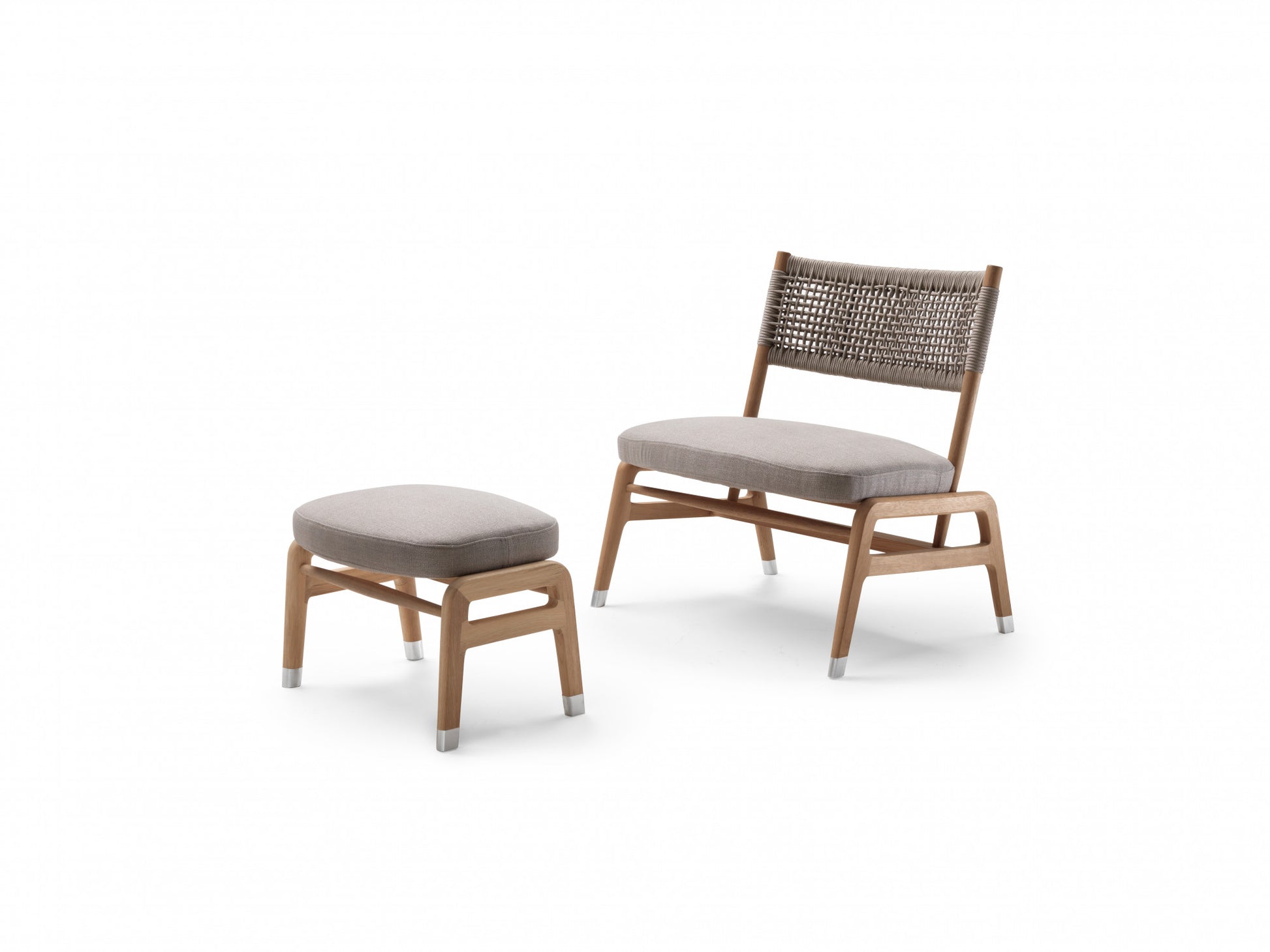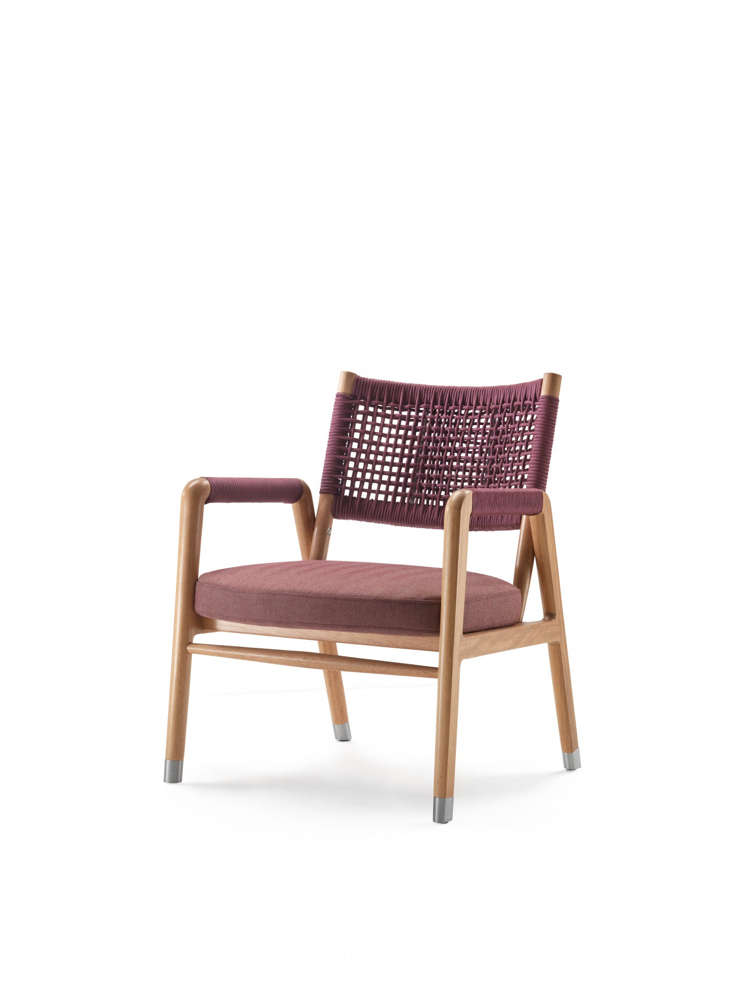Ortigia Outdoor is the alfresco version of the eponymous family of seating elements featuring classic-traditional charm reinterpreted with a contemporary vibe. The structure of the Ortigia armchairs is made entirely of solid iroko, artisan-crafted with techniques that call to mind the tradition of fine cabinetmaking, and available in natural finish or lacquered white or stained grey. It rests on die-cast milled metal alloy tips and nylon pads. The seat is upholstered while the backrest is covered in refined, entirely hand-woven upholstery available in polypropylene cord or polyurethane rubber, both in an elegant palette of colors. The Ortigia family includes an armchair with armrests, an armchair without armrests that can be paired with a footstool and with a dining chair.