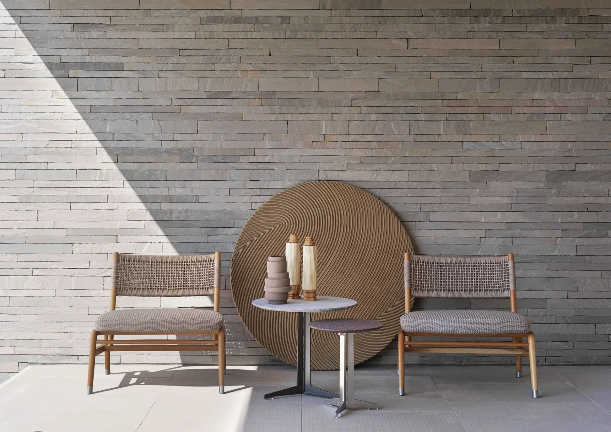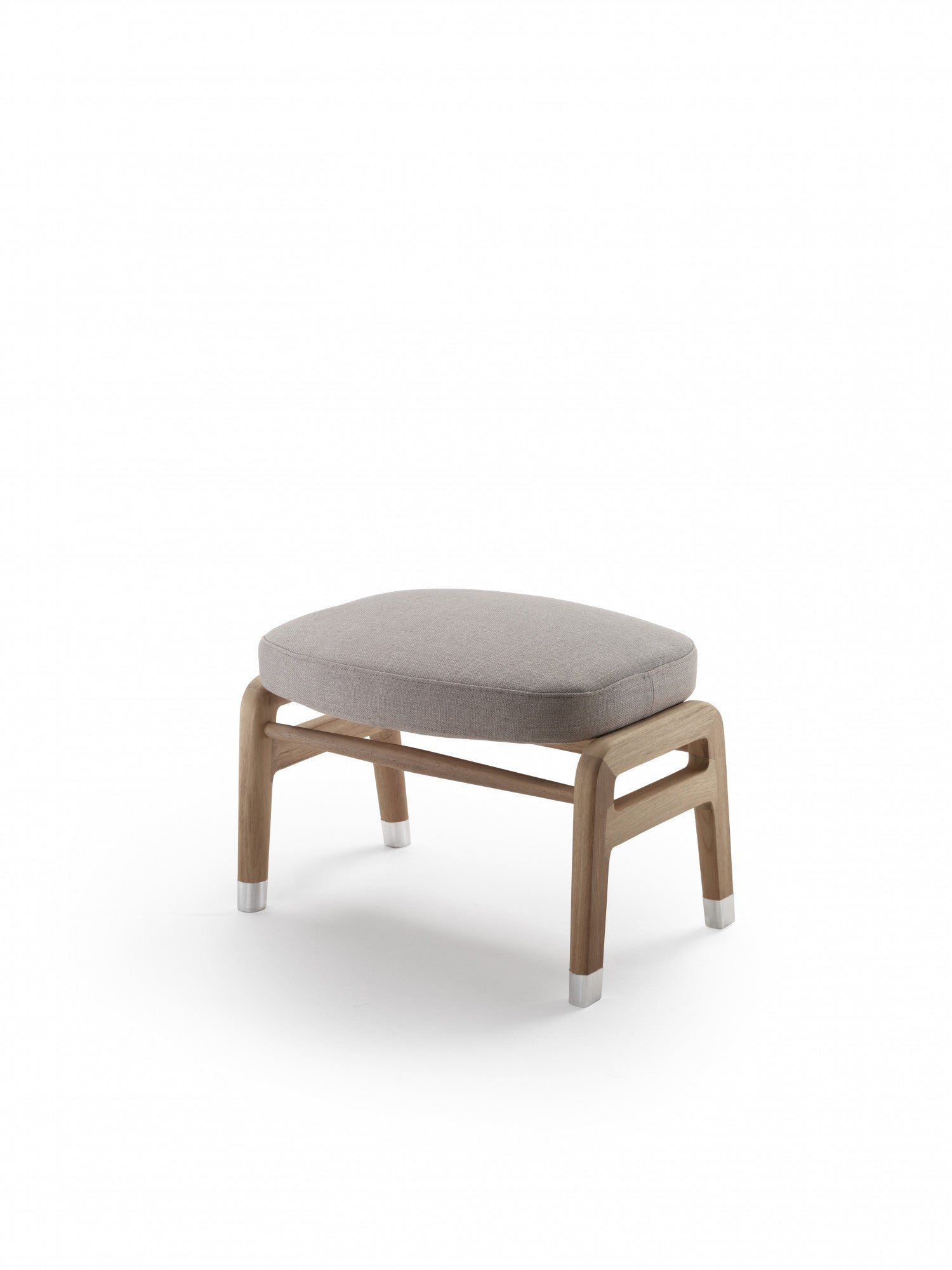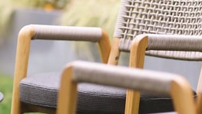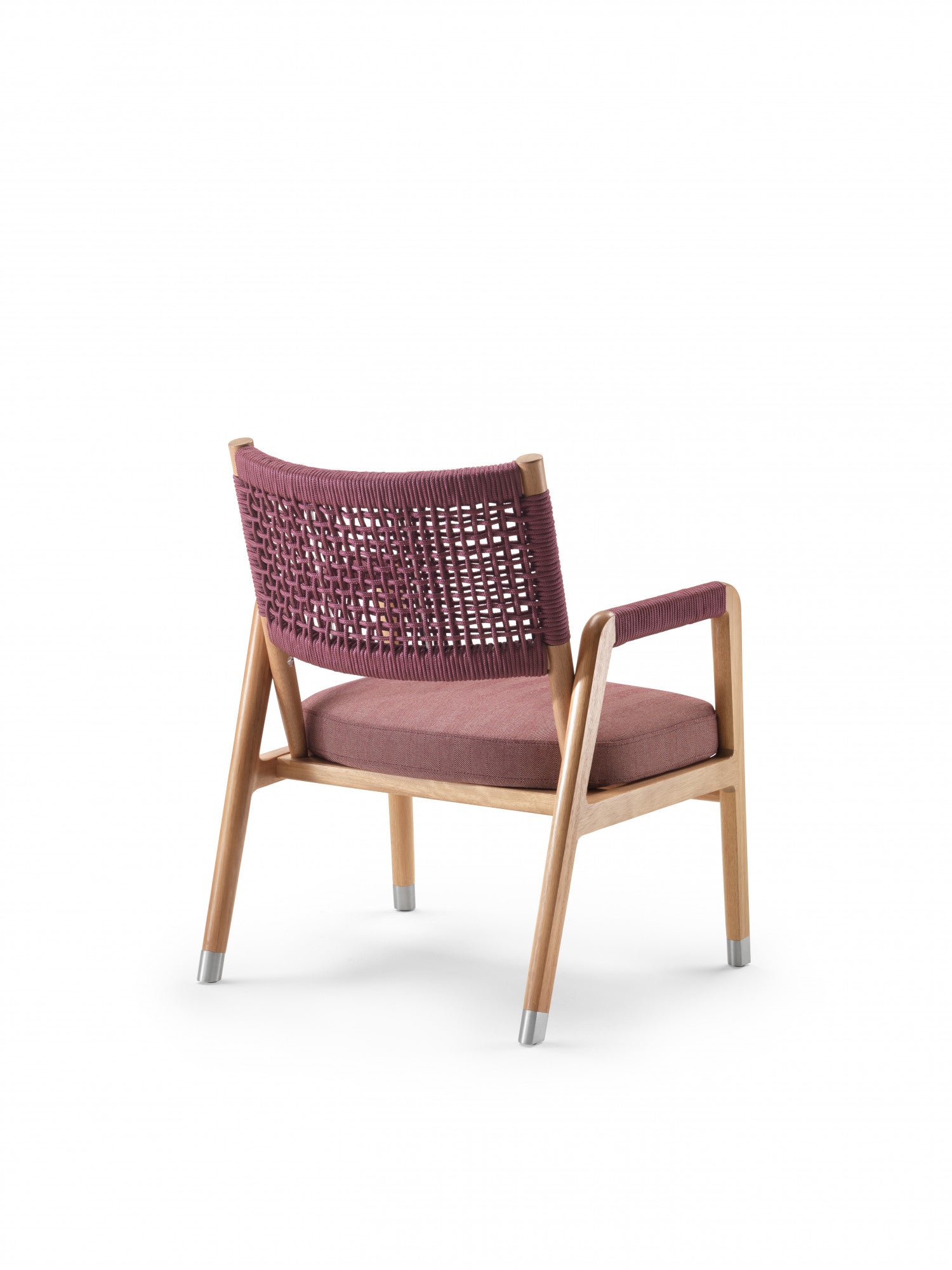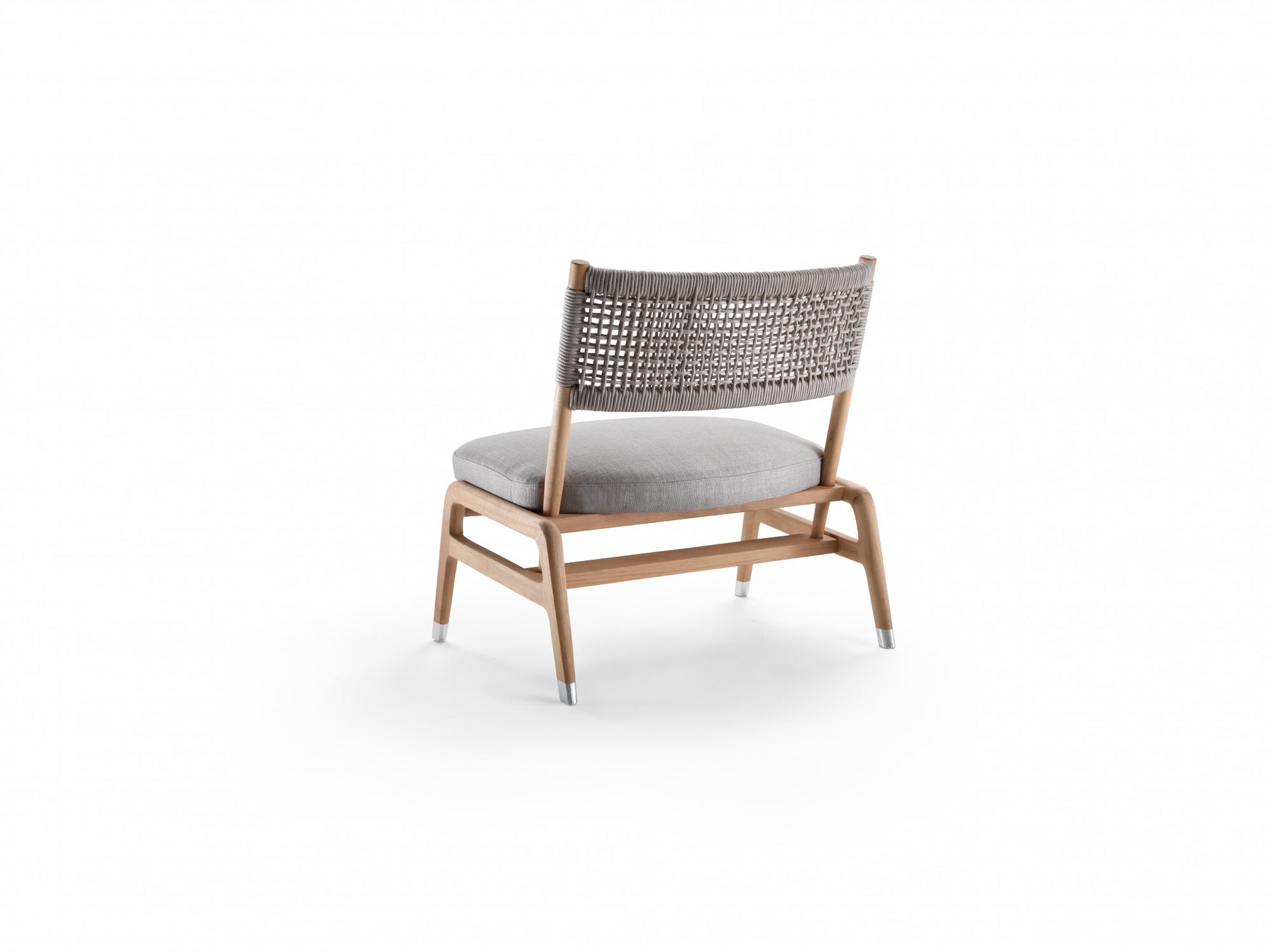 Ortigia Outdoor is the alfresco version of the eponymous family of seating elements featuring classic-traditional charm reinterpreted with a contemporary vibe. The structure of the Ortigia armchairs is made entirely of solid iroko, artisan-crafted with techniques that call to mind the tradition of fine cabinetmaking, and available in natural finish or lacquered white or stained grey. It rests on die-cast milled metal alloy tips and nylon pads. The seat is upholstered while the backrest is covered in refined, entirely hand-woven upholstery available in polypropylene cord or polyurethane rubber, both in an elegant palette of colors. The Ortigia family includes an armchair with armrests, an armchair without armrests that can be paired with a footstool and with a dining chair.