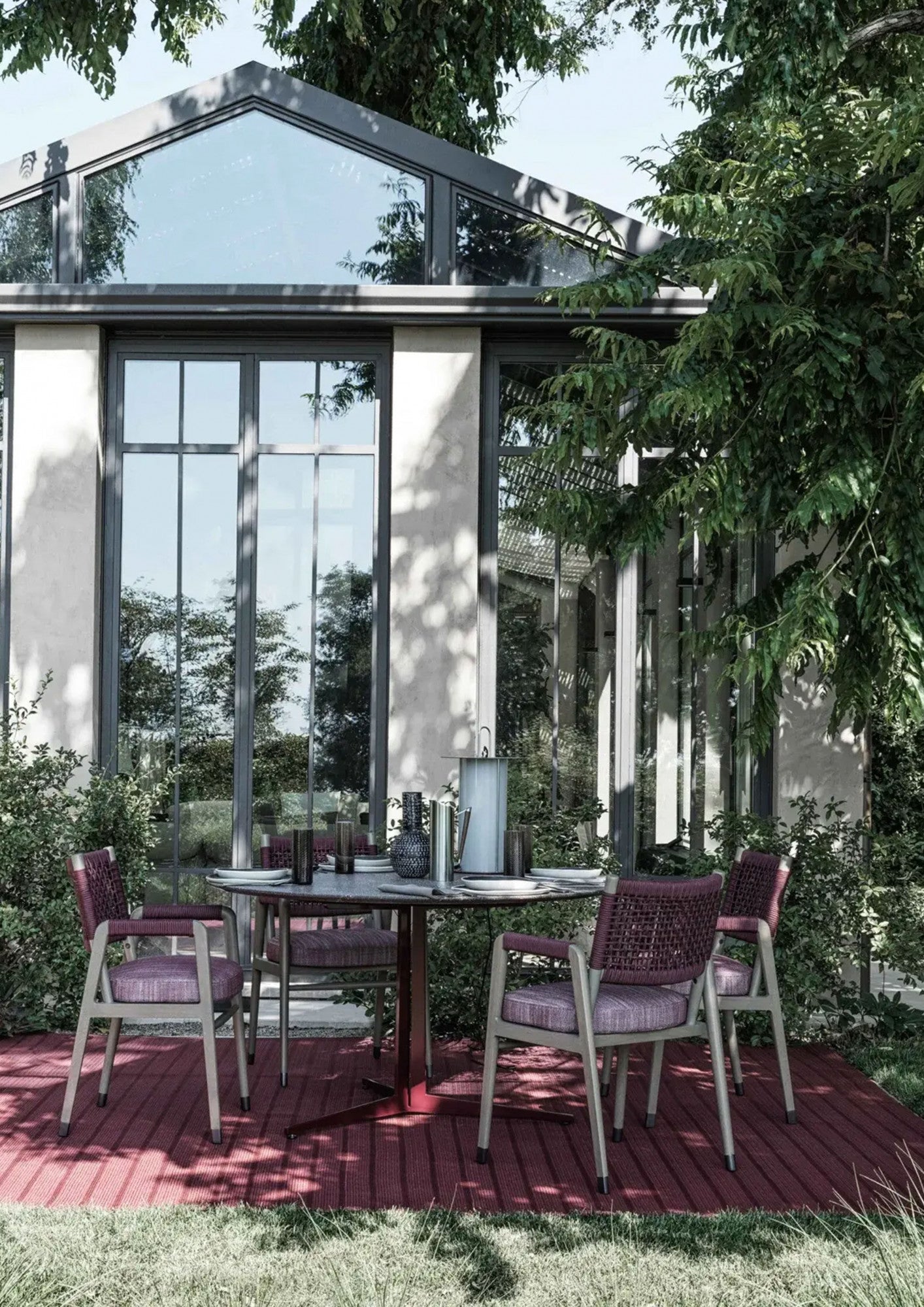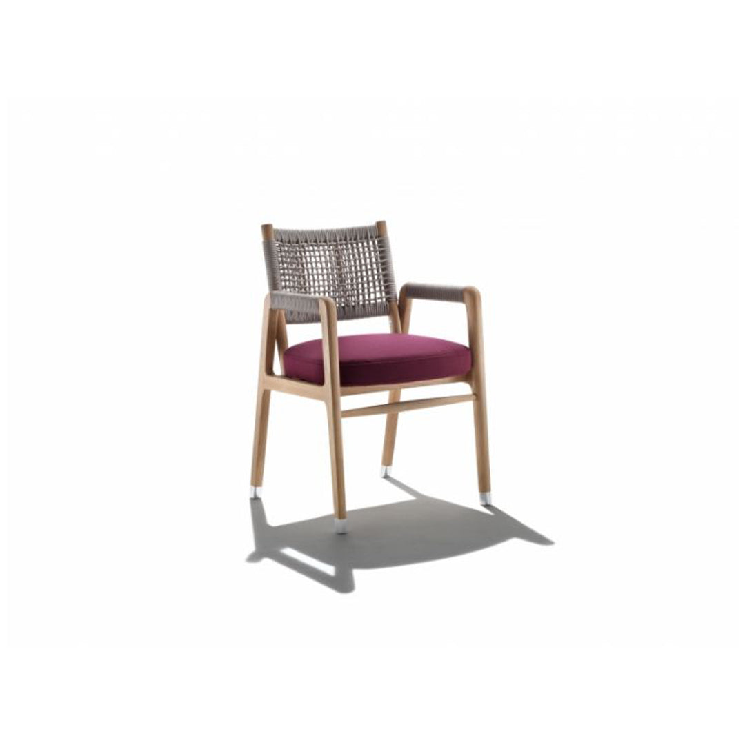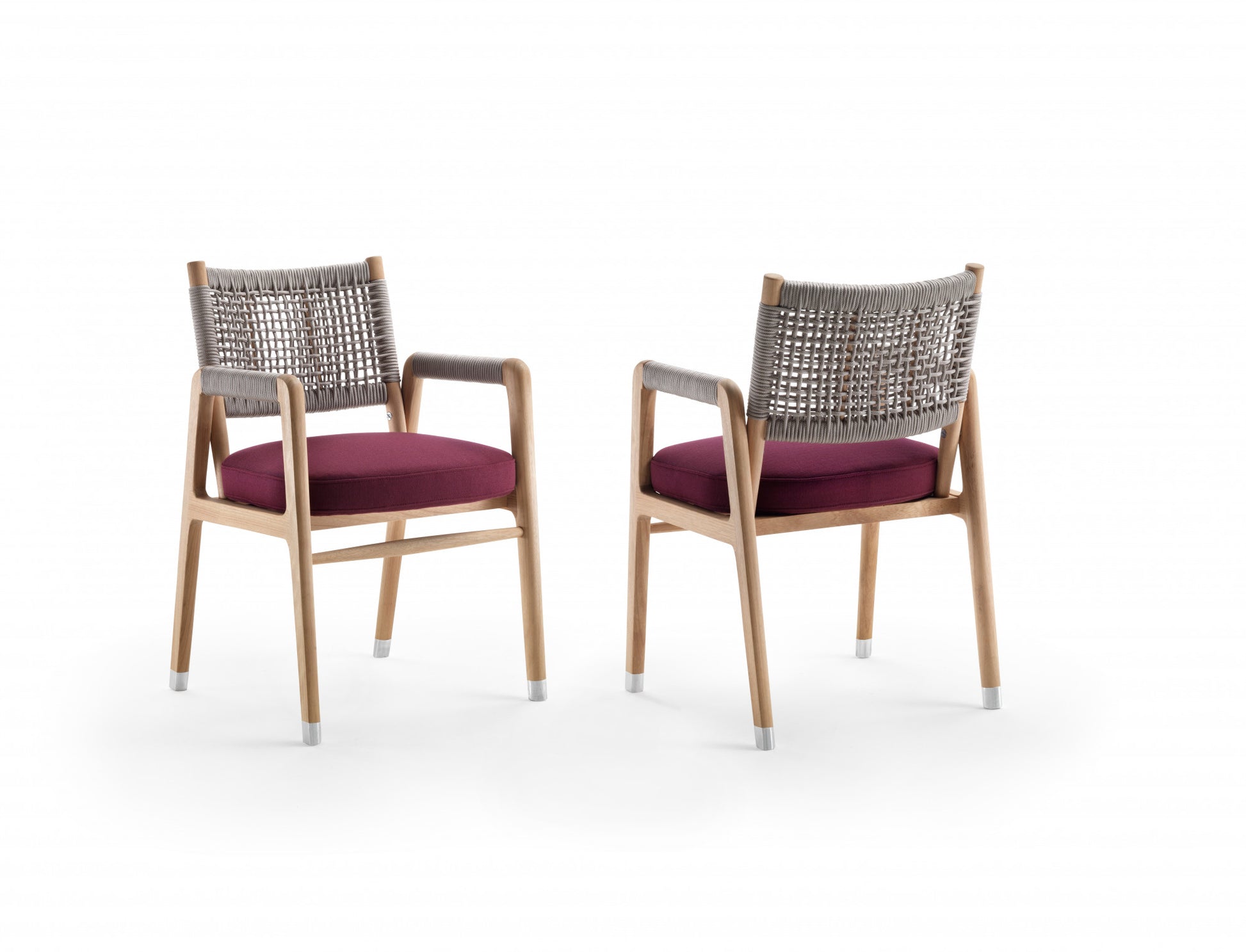 Ortigia Outdoor is the alfresco version of the eponymous family of seating elements featuring classic-traditional charm reinterpreted with a contemporary vibe. The structure of the Ortigia armchairs is made entirely of solid iroko, artisan-crafted with techniques that call to mind the tradition of fine cabinetmaking, and available in natural finish or lacquered white or stained grey. It rests on die-cast milled metal alloy tips and nylon pads. The seat is upholstered while the backrest is covered in refined, entirely hand-woven upholstery available in polypropylene cord or polyurethane rubber, both in an elegant palette of colors. The Ortigia family includes an armchair with armrests, an armchair without armrests that can be paired with a footstool and with a dining chair.
